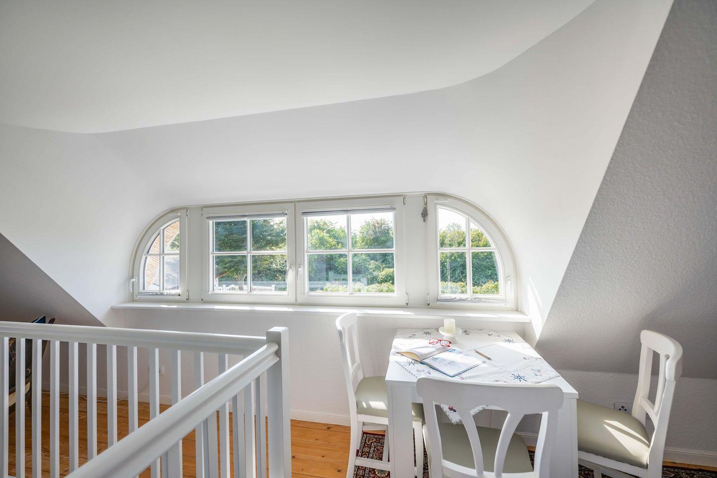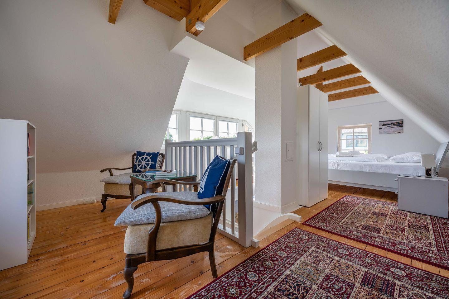 Eine offene Treppe führt Sie hinauf auf die Galerie unterm Reetdach. Dort erwarten Sie ein großzügiges Doppelbett, ein Kleiderschrank, eine kleine Leseecke mit gut gefülltem Bücherregal und ein Esstisch, der sich auch wunderbar als Schreibtisch eignet. Die aufgearbeiteten Holzdielen und die sanften Dachschrägen sorgen für eine besonders gemütliche Atmosphäre.