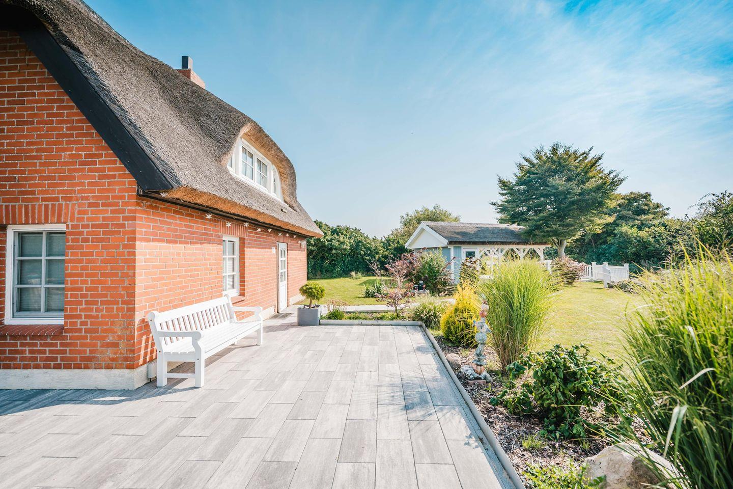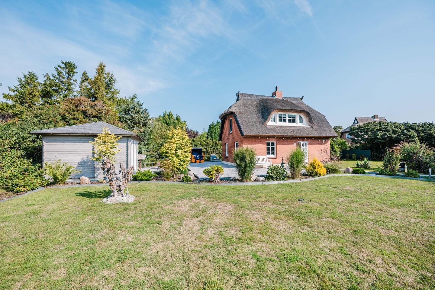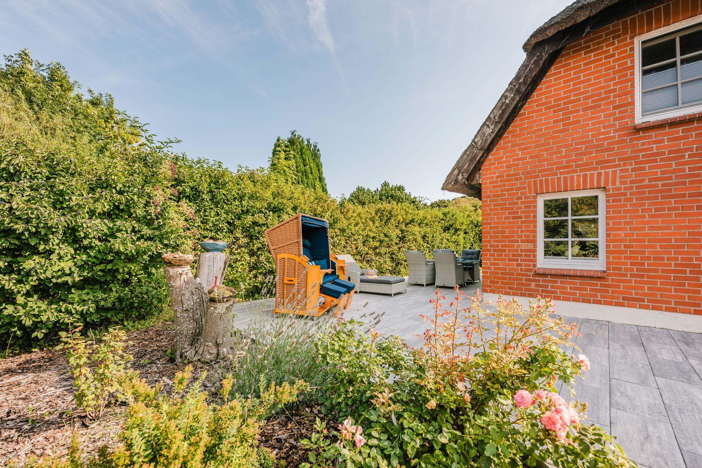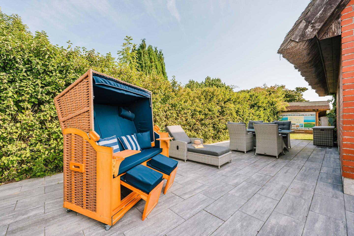 Auch der Außenbereich lädt zum Verweilen ein: die sichtgeschützte Terrasse mit bequemen Sitzmöbeln, Sonnenliegen und einem Strandkorb steht exklusiv für Sie bereit. Ein eigener Carport sorgt für einen sicheren Stellplatz. Dieses eingezäunte Ferienhaus bietet Ihnen viel Privatsphäre – und einen Garten, der auch für gemeinsame Stunden mit Ihren Vierbeinern wie gemacht ist.