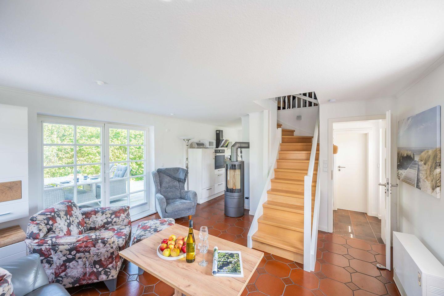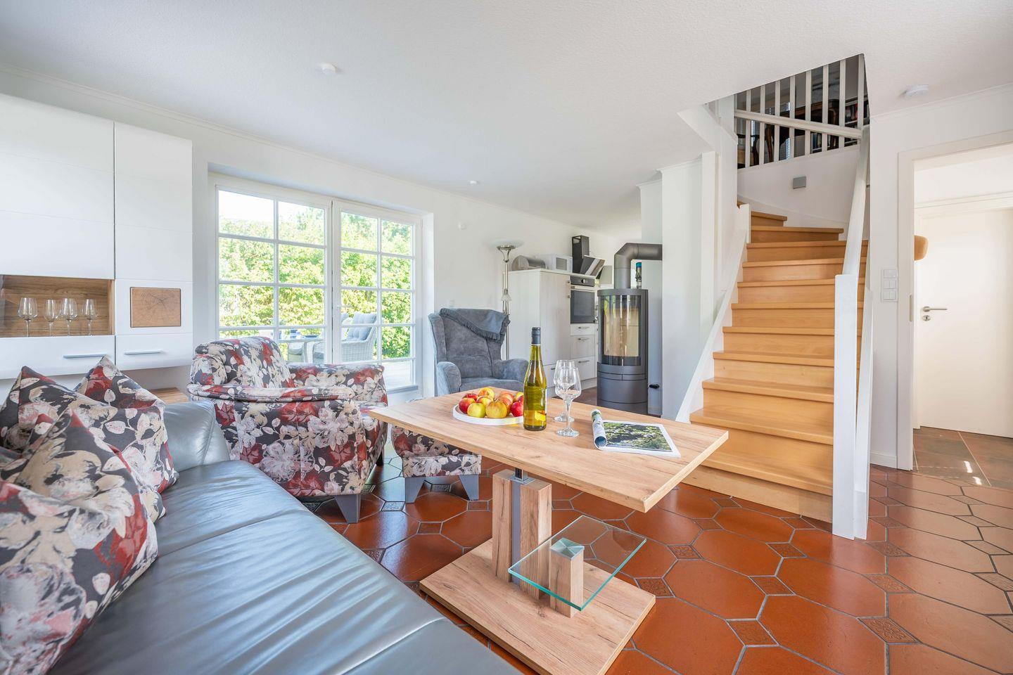Im Erdgeschoss betreten Sie das Ferienhaus durch einen kleinen Eingangsbereich mit Garderobe. Der offene Wohn- und Küchenbereich ist das Herzstück des Hauses: Ein bequemes Ledersofa, Sessel, Fernseher und ein Kaminofen schaffen eine behagliche Atmosphäre – perfekt für gemütliche Abende; das Brennholz bringen Sie bitte selbst mit. Die offene Küche ist mit allem ausgestattet, was Sie für die Selbstverpflegung brauchen, inkl. Gefrierfach und Backofen. Ein kleiner Geschirrspüler übernimmt den lästigen Teil. Zahlreiche Fenster sind mit Insektenschutz versehen, sodass Sie auch an warmen Sommerabenden ungestört lüften können. Das Tageslichtbad mit Dusche, WC, Waschbecken, Handtuchheizkörper und Waschmaschine liegt separat am kleinen Flur. Im Erdgeschoss sind die Böden gefliest.