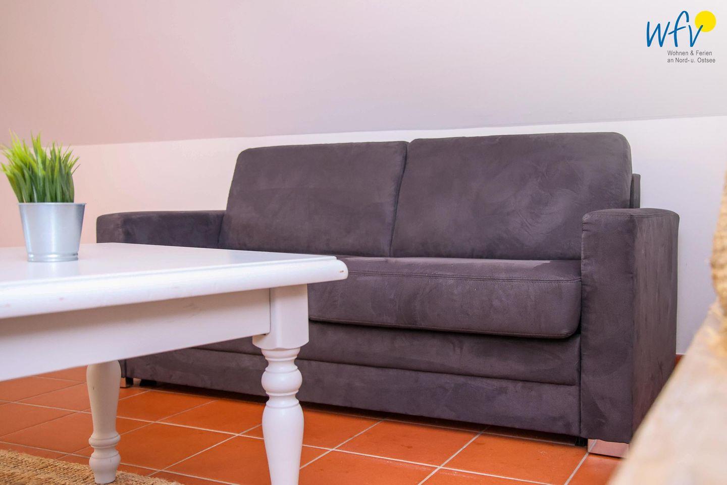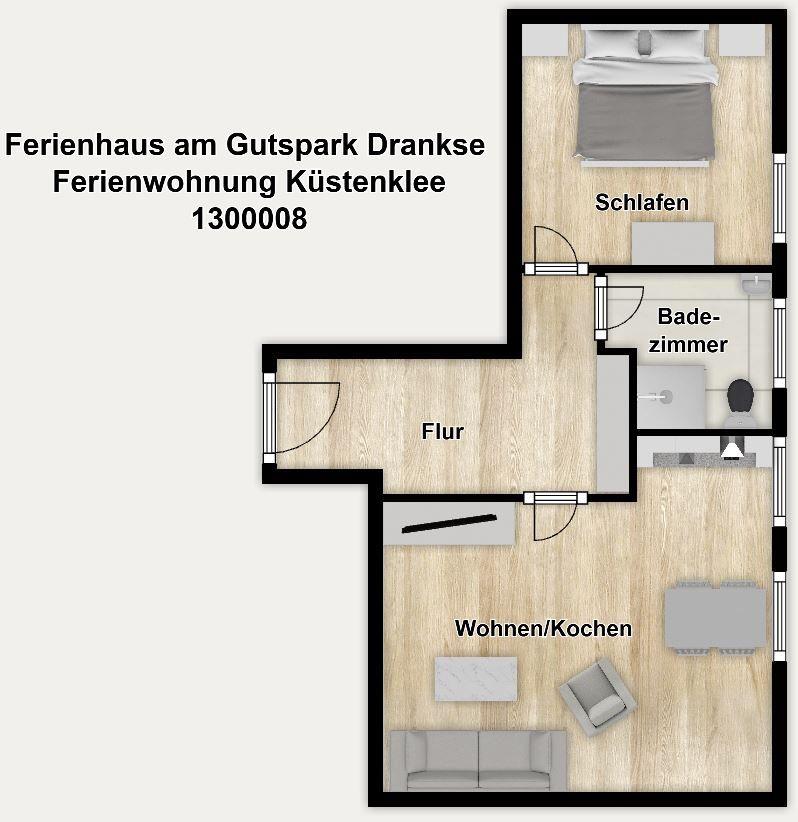 Die Ferienanlage umfasst 23 Ferienwohnungen. In unserem 50 m² großen Appartement "Küstenklee" im 1. Obergeschoss erwartet Sie ein Wohnraum mit Schlafsofa (160 cm x 198 cm), TV, offener Küche und Essplatz sowie ein separates Schlafzimmer mit Doppelbett (180 cm x 200 cm) und ein Duschbad.
