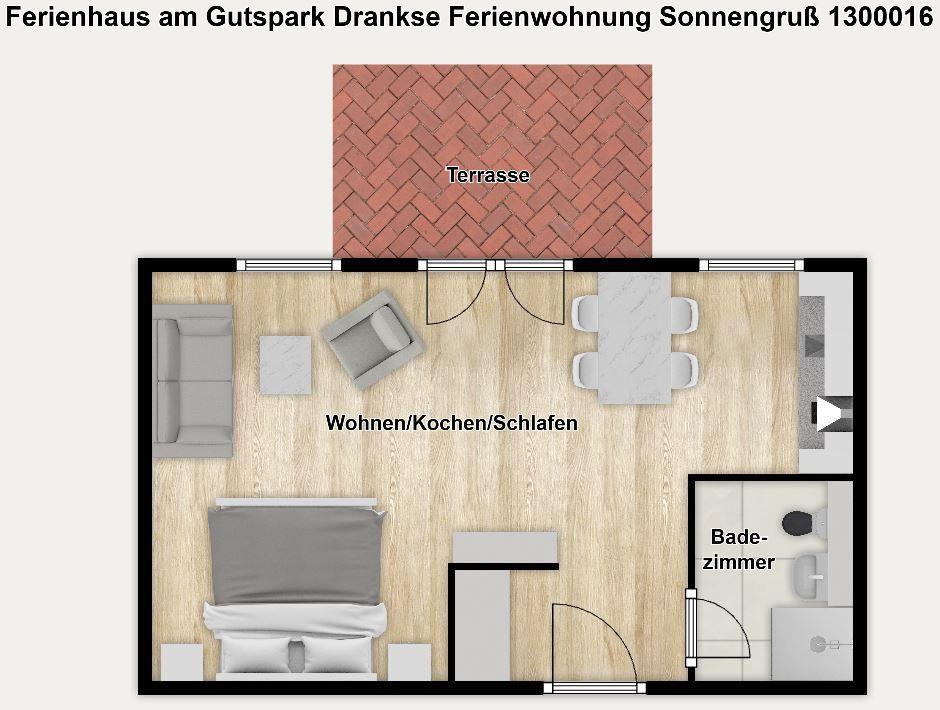 Die Ferienanlage umfasst 23 Ferienwohnungen. In unserem 33 m² großen Appartement "Sonnengruß" im Erdgeschoss erwartet Sie ein kombinierter Wohn-/Schlafraum mit Sitzgelegenheiten, Doppelbett (180 cm x 200 cm), offener Küche und Essplatz sowie ein Duschbad. Das Appartement verfügt außerdem über eine Terrasse, sodass Sie die wohltuende Ostseeluft genießen können.