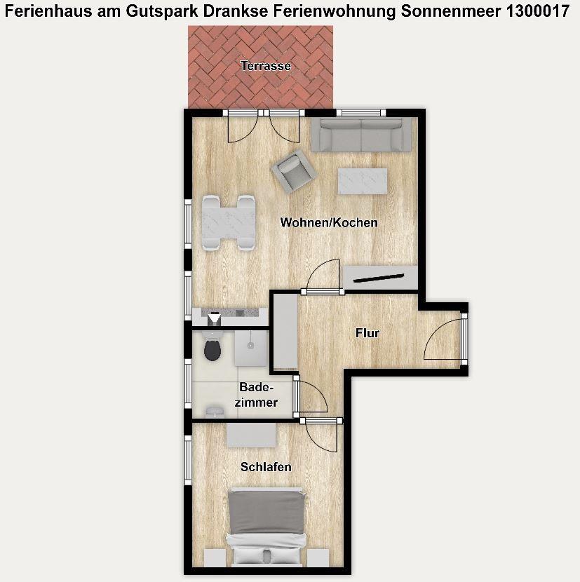Die Ferienanlage umfasst 23 Ferienwohnungen. In unserem 51 m² großen Appartement "Sonnenmeer" im Erdgeschoss erwartet Sie ein Wohnraum mit Schlafsofa (160 cm x 198 cm), TV, offener Küche und Essplatz sowie ein separates Schlafzimmer mit Doppelbett (180 cm x 200 cm) und ein Duschbad. Das Appartement verfügt außerdem über eine Terrasse, sodass Sie die wohltuende Ostseeluft genießen können.