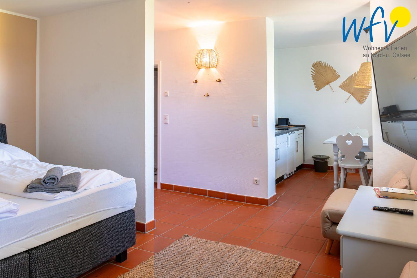 Die Ferienanlage umfasst 23 Ferienwohnungen. In unserem 39 m² großen Appartement "Sonnenkuss" im 1. Obergeschoss erwartet Sie ein Wohnraum mit Doppelbett (180 cm x 200 cm), TV, Kochnische und Essplatz sowie ein separates Schlafzimmer mit zwei Etagenbetten (90 cm x 200 cm) und ein Duschbad.
