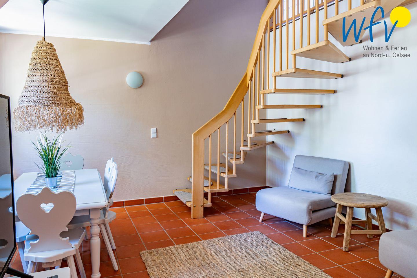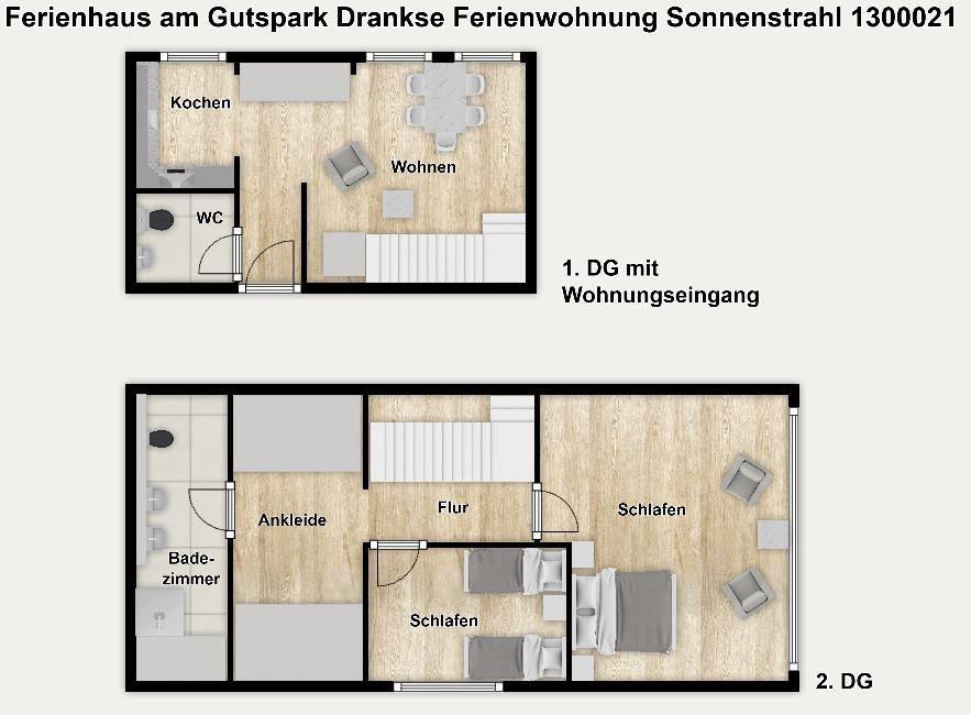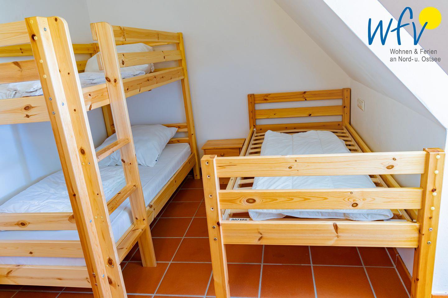 Die Ferienanlage umfasst 23 Ferienwohnungen. In unserem 75 m² großen Appartement "Sonnenstrahl" über zwei Etagen erwartet Sie ein Wohnraum mit Sitzgelegenheiten, TV, Kochnische und Essplatz sowie zwei separate Schlafzimmer und ein Duschbad mit zusätzlichem Gäste-WC. Die Schlafzimmer sind mit einem Doppelbett (180 cm x 200 cm) bzw. einem Einzelbett (90 cm x 200 cm) und einem Etagenbett (90 cm x 200 cm) ausgestattet. Die Maisonettewohnung erstreckt sich über das 1. OG (Wohn- und Küchenbereich, Gäste-WC) und das 2. OG (Schlafbereiche + Bad).