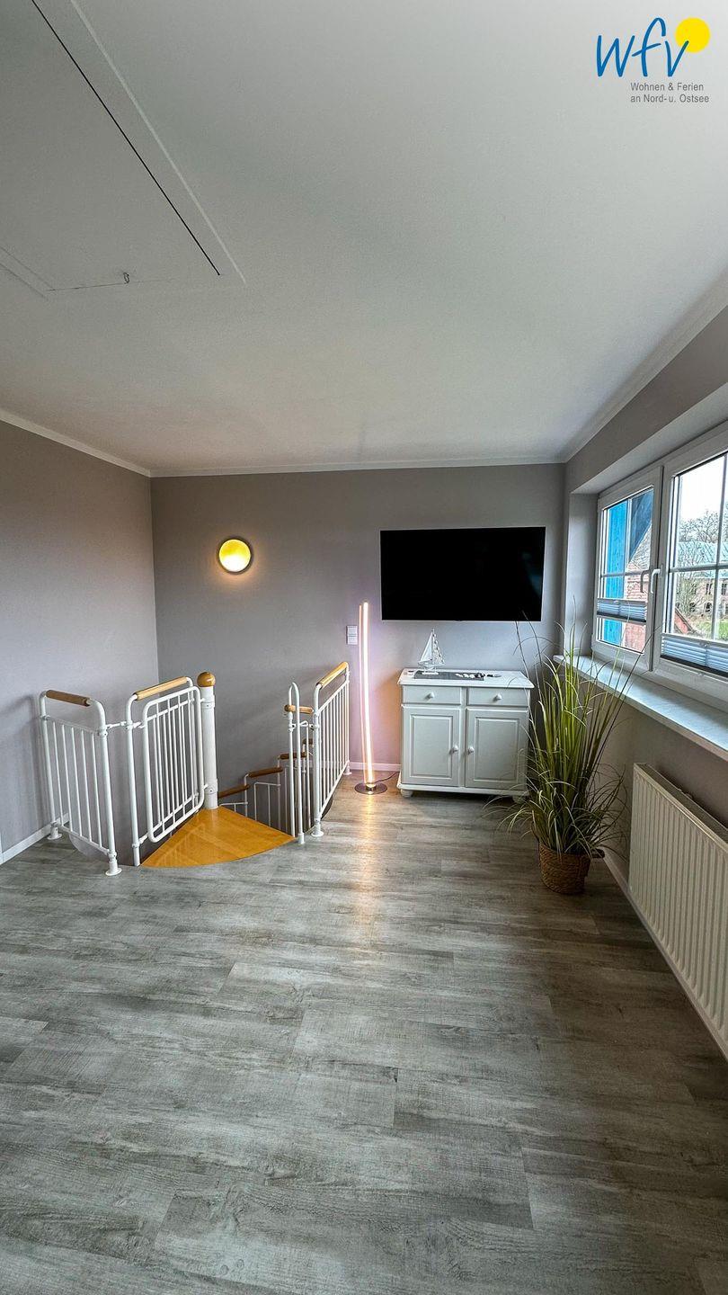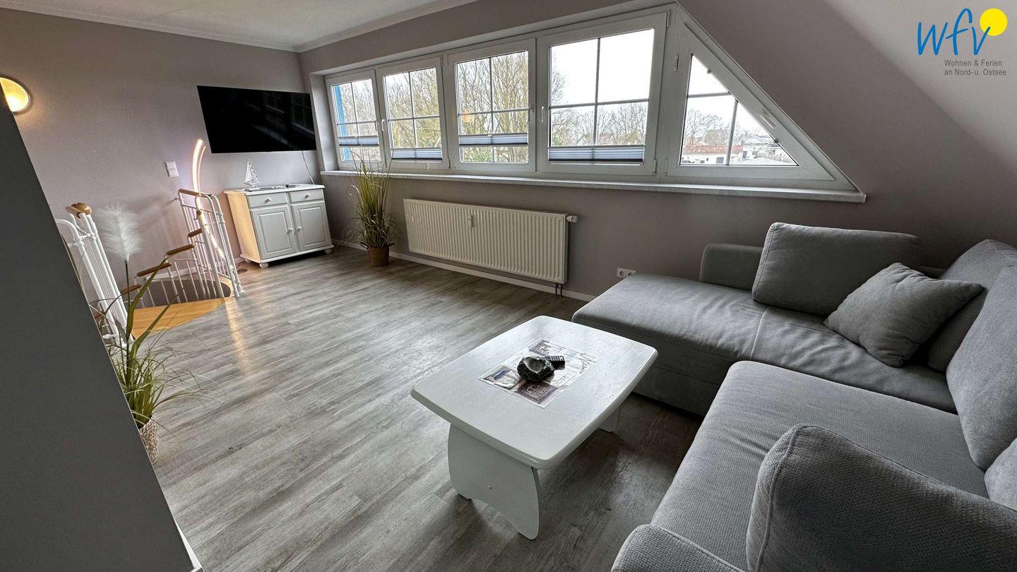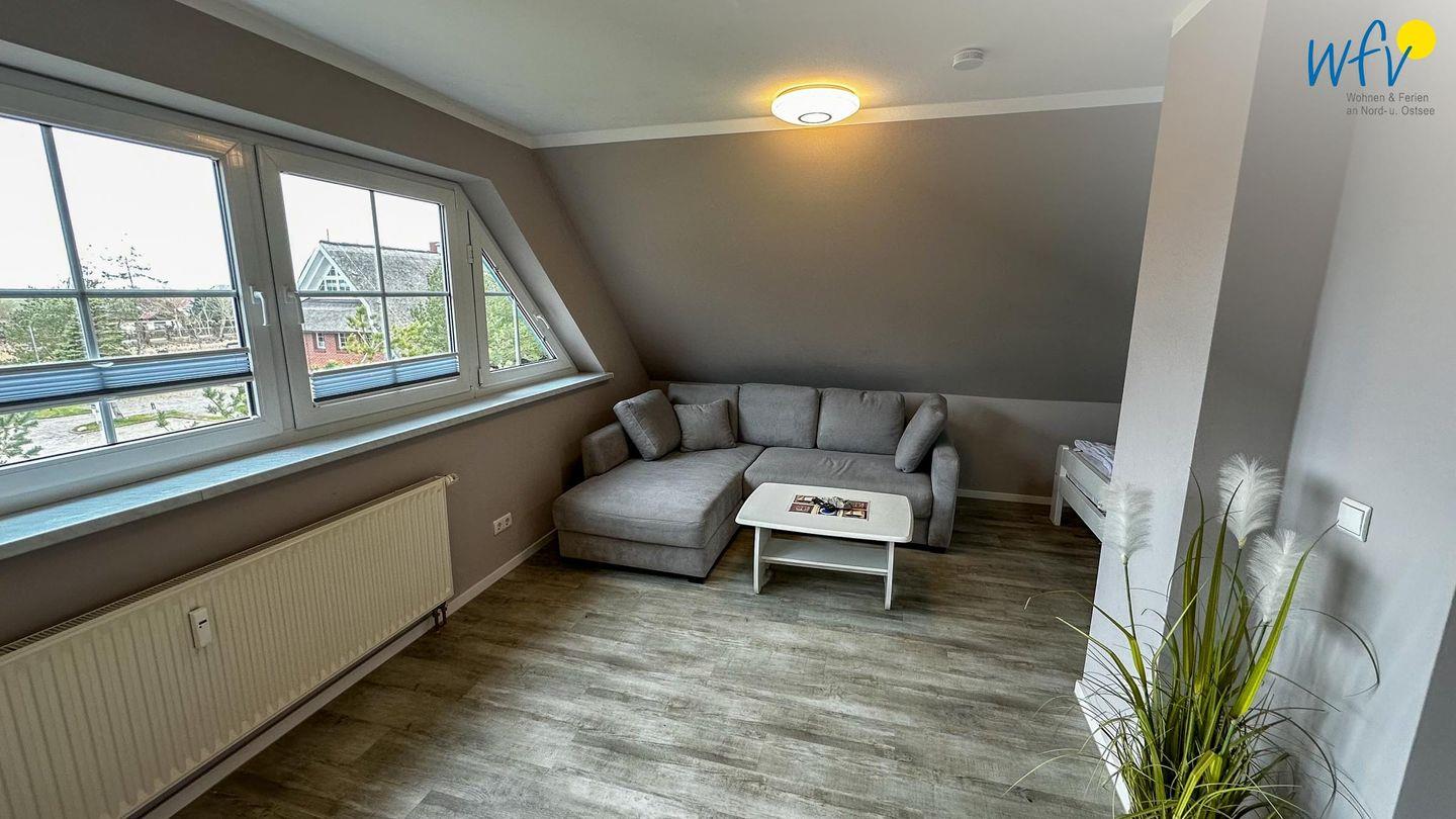 Auf der zweiten Etage empfängt Sie ein heller Wohnraum mit breiter Fensterfront. Hier können Sie es sich nach der Fahrradtour oder dem Strandtag in der Sofaecke mit TV gemütlich machen. Eine Schlafnische mit Doppelbett (2 x 90 x 200 cm) und Kleiderschrank bietet eine angenehme Nachtruhe. Für zwei weitere Personen kann das komfortable Sofa schnell und einfach zu einer Schlafcouch umgewandelt werden.