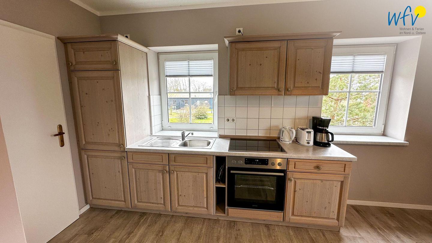 In der ersten Etage der Maisonette-Ferienwohnung befindet sich eine geräumige Küche mit Essplatz, in der Sie wunderbar gemeinsam kochen und gemeinsame Mahlzeiten genießen können. Ein Cerankochfeld, ein Backofen, ein Kühlschrank mit Gefrierfach sowie eine Kaffeemaschine und ein Toaster ermöglichen eine bequeme Selbstverpflegung. Oder Sie verköstigen Ihre Lieblingsgerichte im Freien: Die möblierte Terrasse mit schönem Blick in den Garten lädt zum Entspannen und Verweilen ein.
