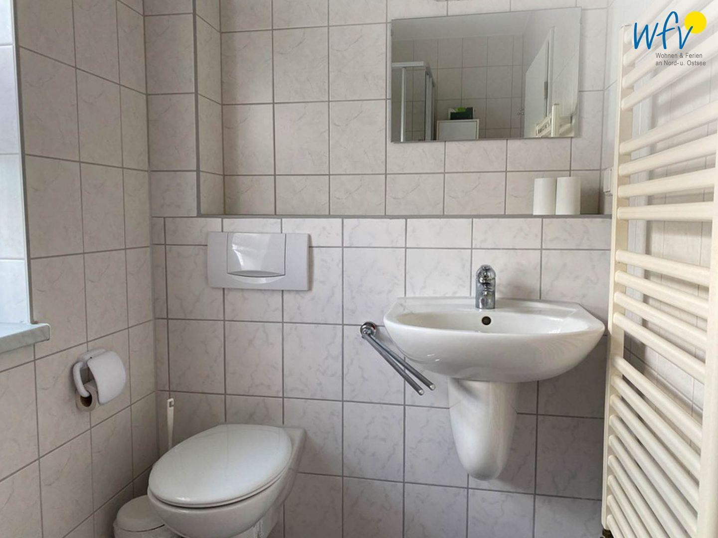 Das gepflegte Tageslichtbad mit Dusche, WC, Waschbecken mit Spiegel und Handtuchheizung sorgt für weiteren Wohnkomfort.