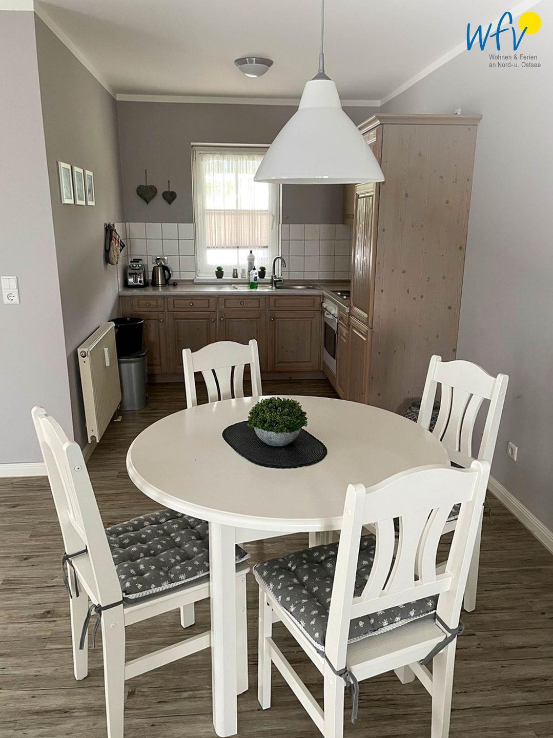 In dem geräumigen Wohnraum empfängt Sie ein schönes Ensemble aus Esstisch, Sofaecke und TV, das zum Erholen und Ausspannen einlädt. Zum Surfen vom Smartphone aus empfangen Sie kostenlos freies WLAN. Oder Sie entspannen beim Blick aus dem Fenster: Von der Wohnung aus haben Sie eine sehr schöne Aussicht in den Garten und die umliegenden Felder.