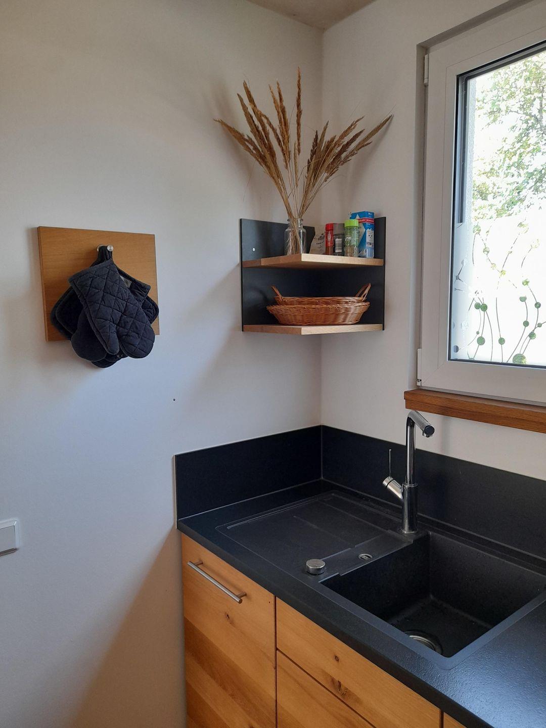 Im Erdgeschoss befindet sich ein Wohnraum mit offener Küche und Esszimmer sowie ein Gäste-WC.