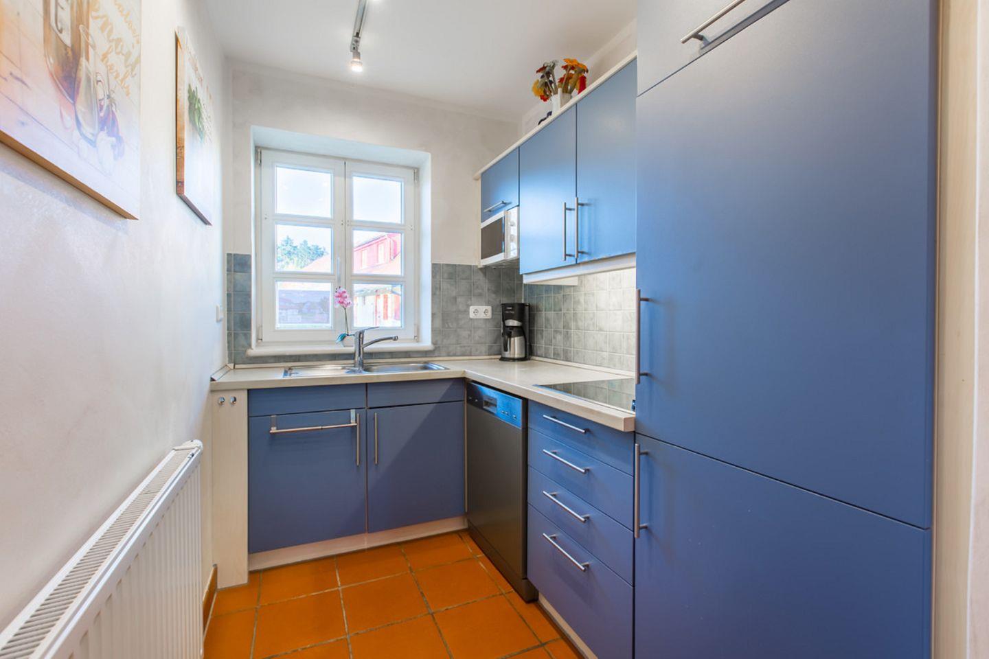 KÜCHE // offene Küche im EG mit Cerankochfeld, Kühlschrank, Mikrowelle, Geschirrspüler, portabler Backofen, Toaster, Wasserkocher, Kaffeemaschine, reichlich Besteck, Geschirr und Küchenutensilien ++