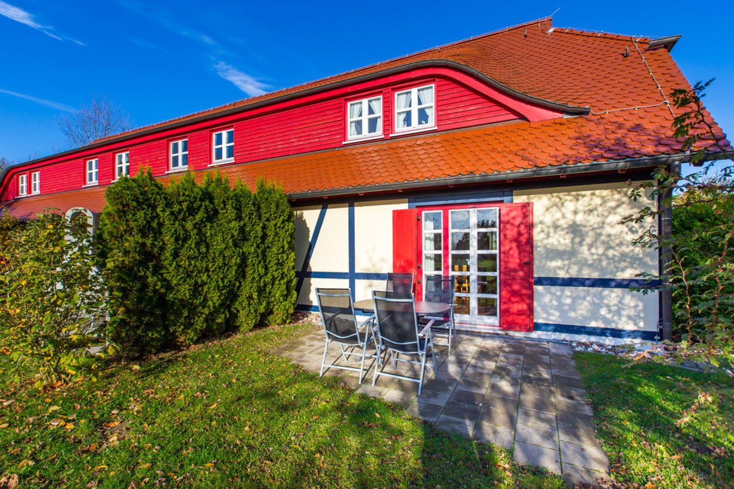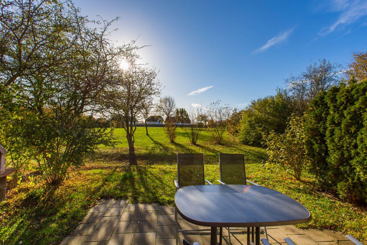 Strandnahe Ferienwohnung mit Terrasse im Feriendorf Bakenberg, ideal für Familien und Hundebesitzer.