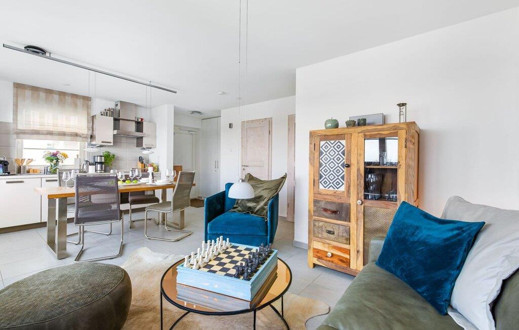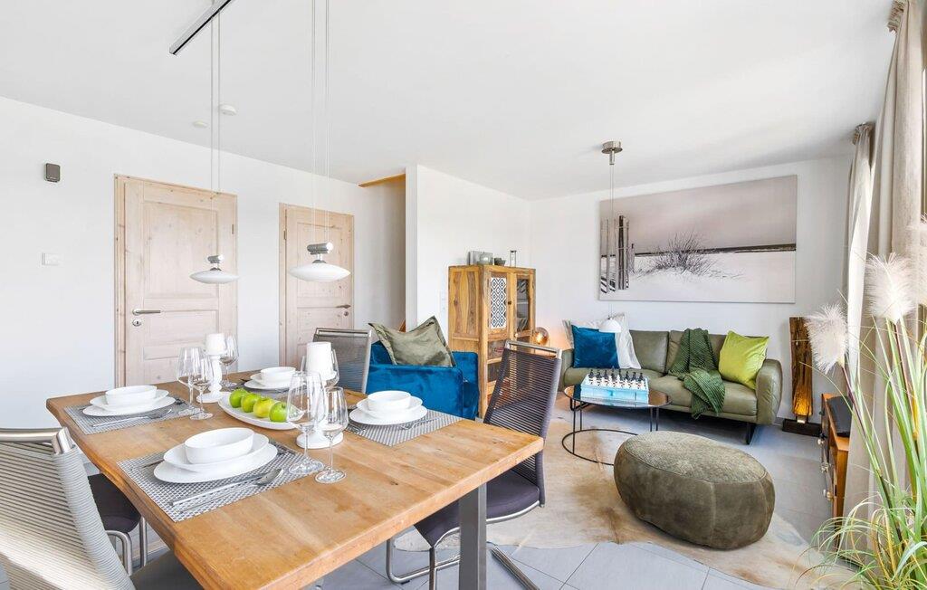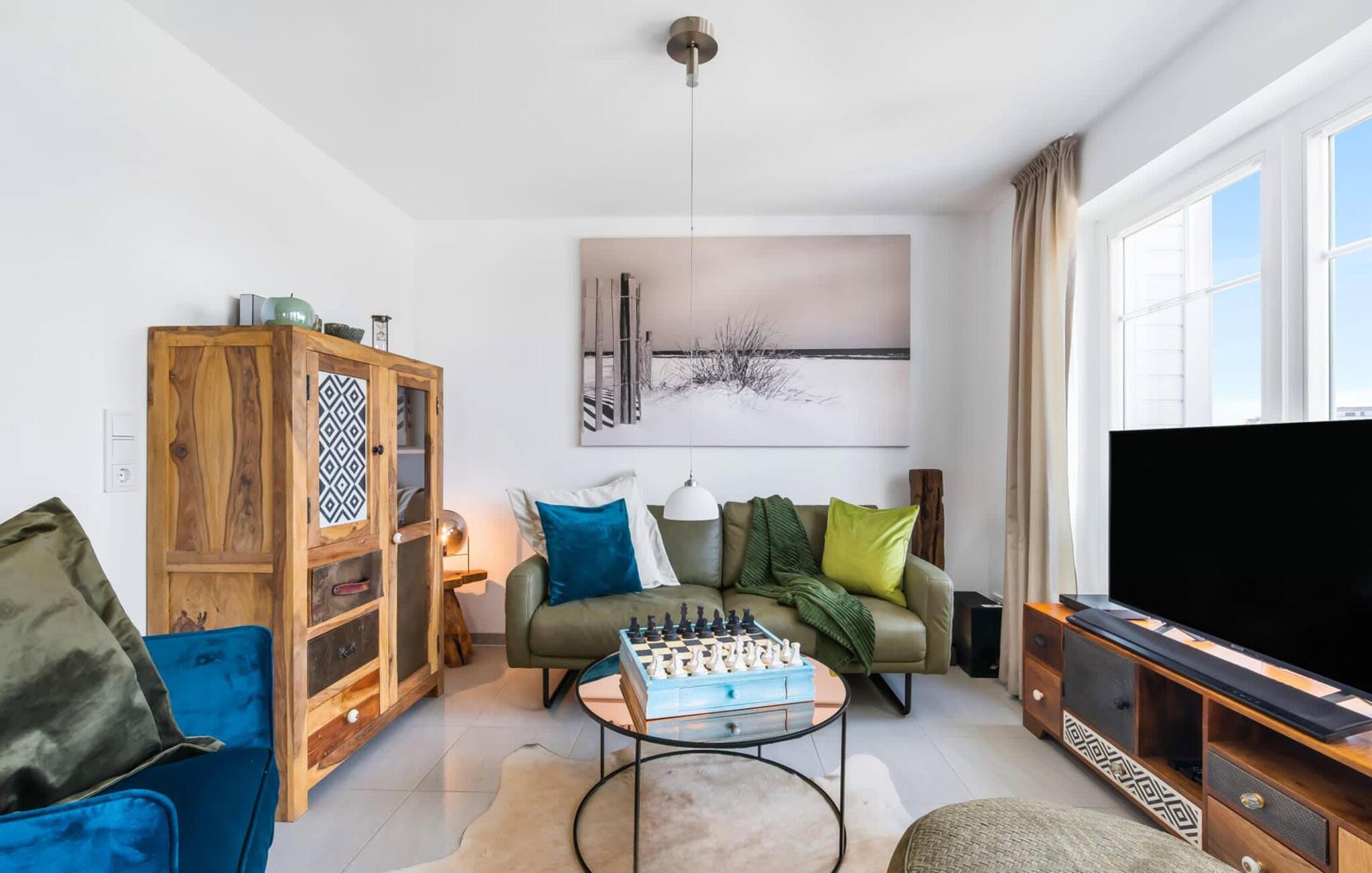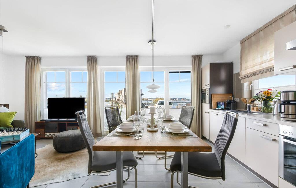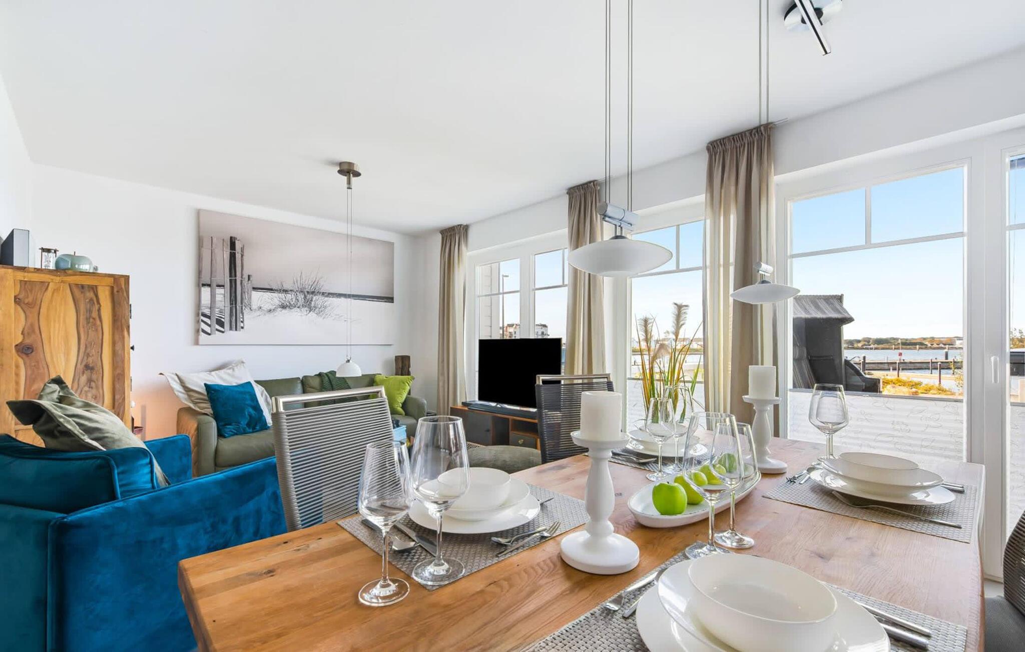Lichtdurchflutet gestaltet sich der Wohn- /Essbereich des Ferienhauses. Durch die bodentiefe Fensterfront fällt der Blick über die anliegende Südterrasse und den Segel- und Sportboothafen. Das spannende Hafenkino ist hierbei garantiert und lässt sich bei gemeinsamen Mahlzeiten am Esstisch oder von der gemütlichen Sitzlandschaft aus beobachten. Die voll ausgestattete Wohnküche lässt keine Wünsche offen. Hier lassen sich köstliche Urlaubsmahlzeiten zaubern.
