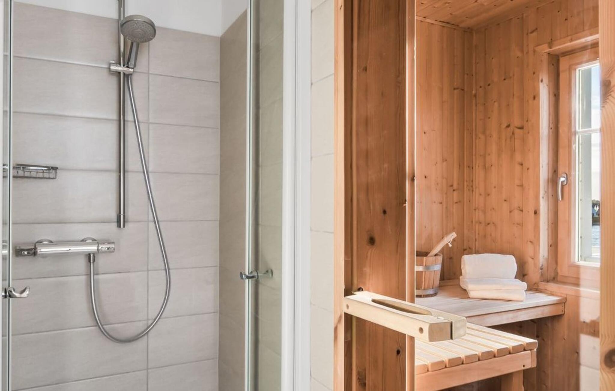 Für das wohltuende Spa-Programm steht auf dieser Ebene außerdem die hauseigene große, finnische Sauna mit Ausblick in den Hafen bereit. Für die nötige Abkühlung sorgt die anliegende Dusche.