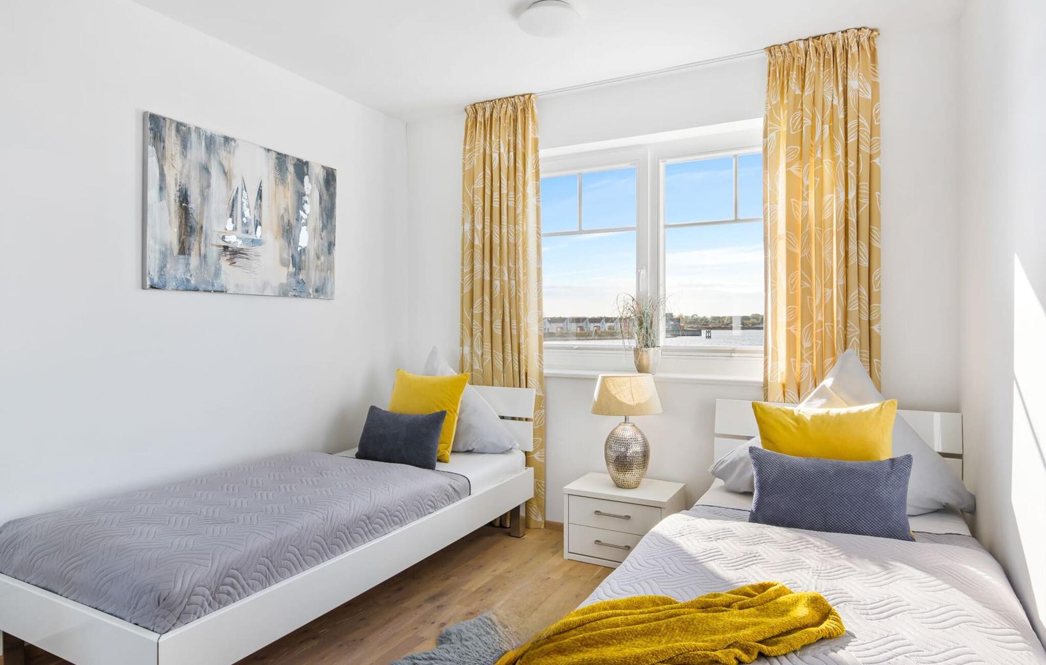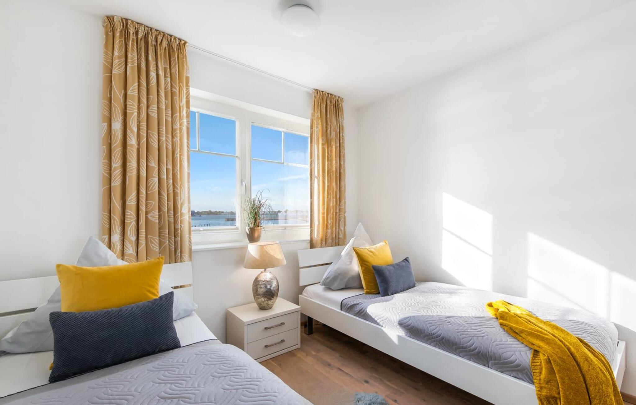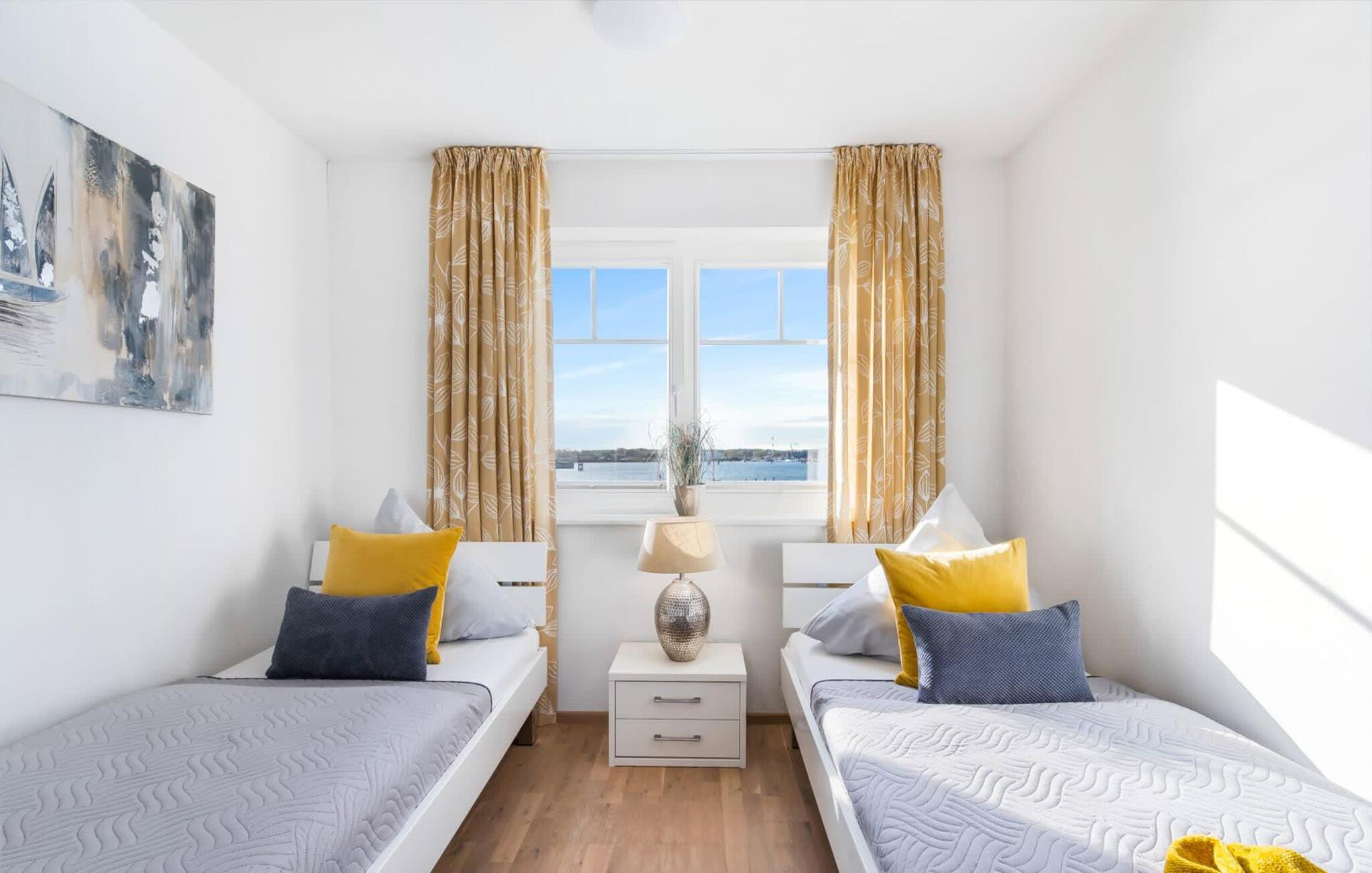 Auch das zweite Schlafzimmer bietet direkten Hafenblick. Dank Spiegelschrank lässt sich dieser aus allen Blickwinkeln genießen.