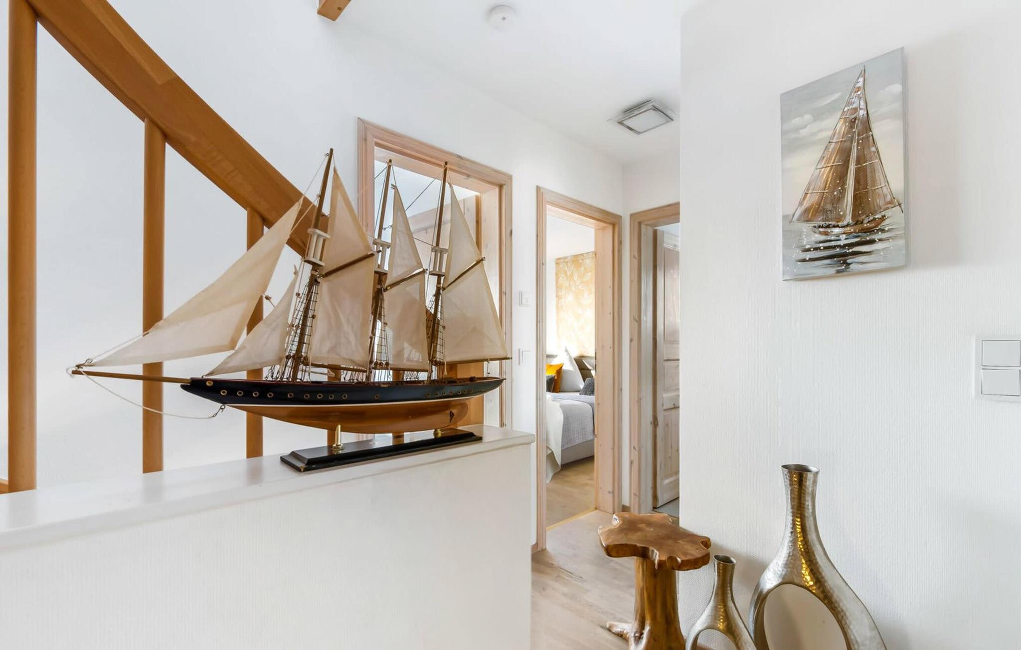 Natürlichkeit und modernem Design. Hochwertige Holzmöbel und natürliche Farben und Materialien treffen auf extravagante Lampen und Designer Möbeldie perfekte Kombination aus Gemütlichkeit und Stil. Für maritimes Ambiente sorgen hierbei vorbeifahrende Segelschiffe im Treiben der Hafeneinfahrt, umherfliegende Möwen und die charakteristische Ostseebrise. Mit Sauna, Whirlpool und Kaminofen ausgestattet, verspricht das Ferienhaus Dreimaster zudem Wellness und Entspannung zu jeder Jahreszeit.
