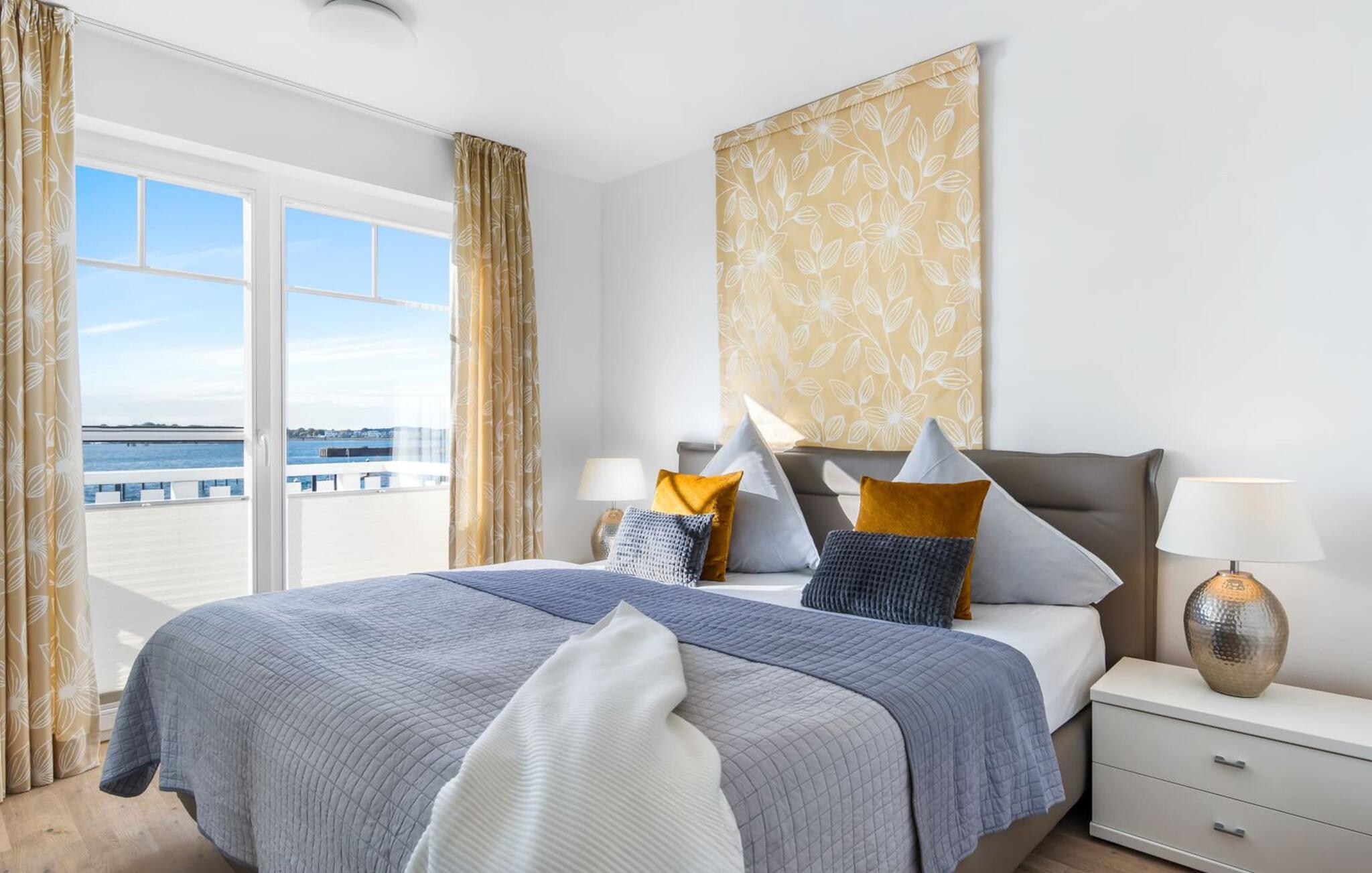 Das Hauptschlafzimmer ist im wahrsten Sinne traumhaft, denn neben einem eigenen Sonnenbalkon, darf man hier mit einem wunderschönen Blick über die Marina aufwachen und einschlafen. Mit einem Kaffee im Morgenmantel direkt auf die Terrasse treten, die Boote, die Wellen und das Hafentreiben beobachten… was will man Meer?