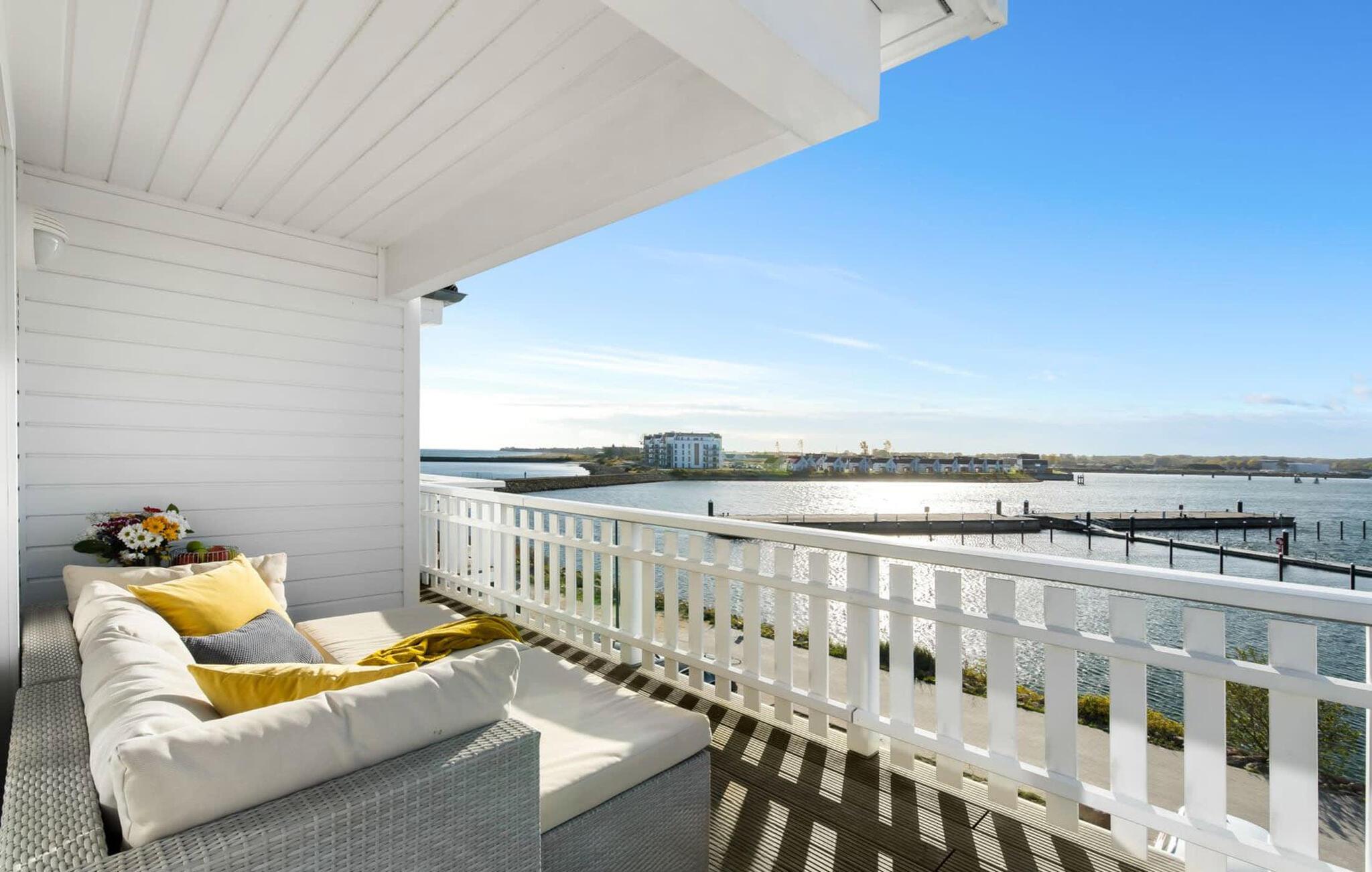 Unser Lieblingsplatz: Im Studio die Füße hochlegen mit einem Buch in der Hand und bei Hafen-, Strand- und Ostseeblick entspannt den Sonnenuntergang und das knisternde Kaminfeuer genießen.