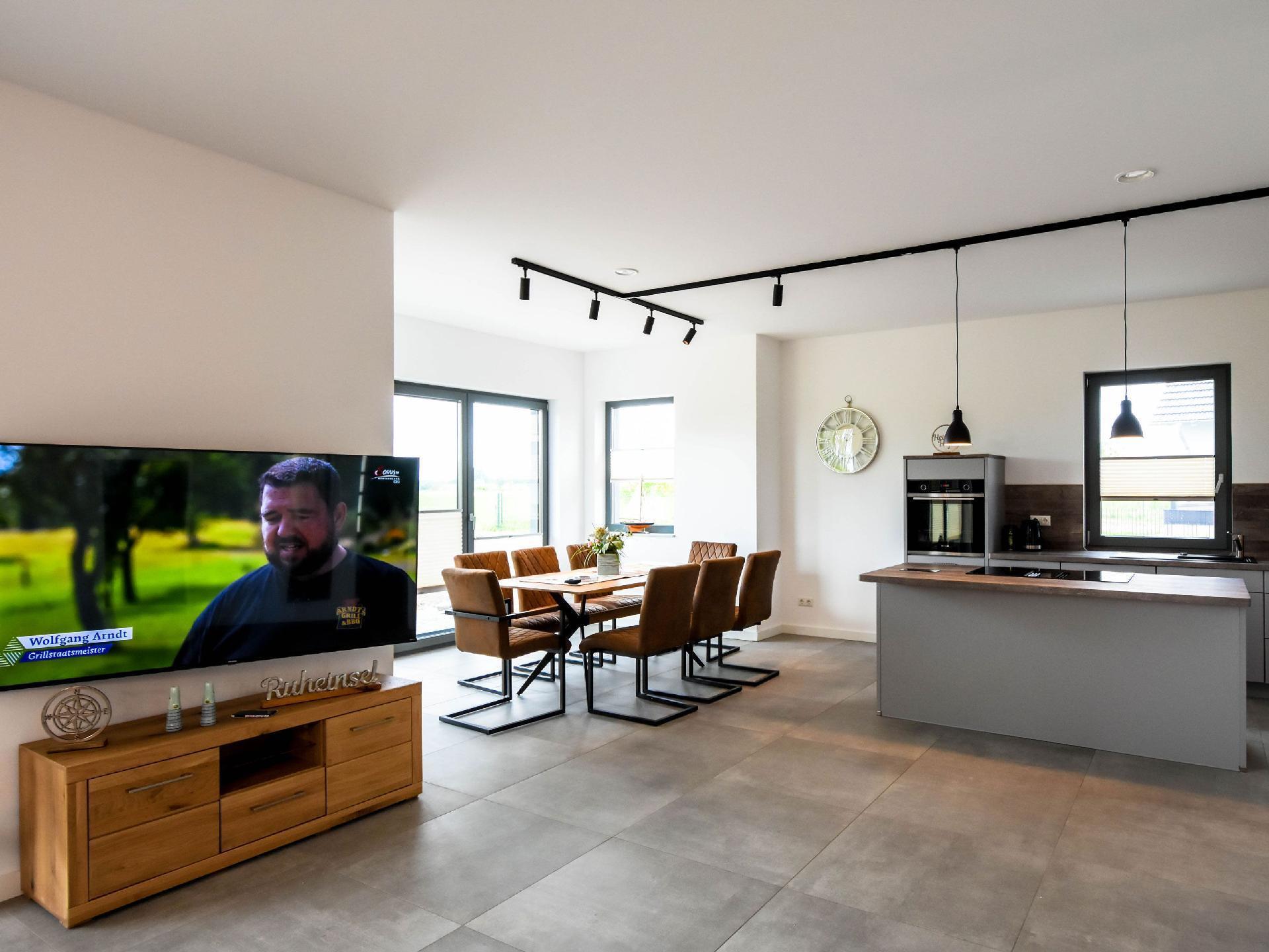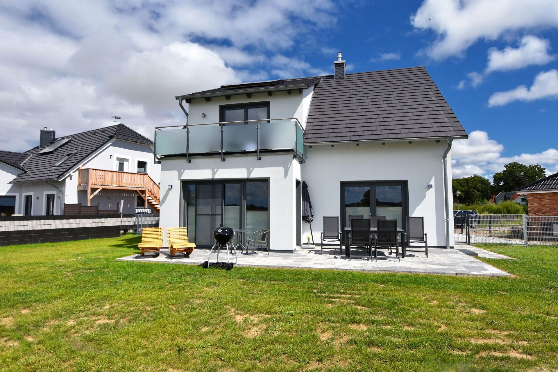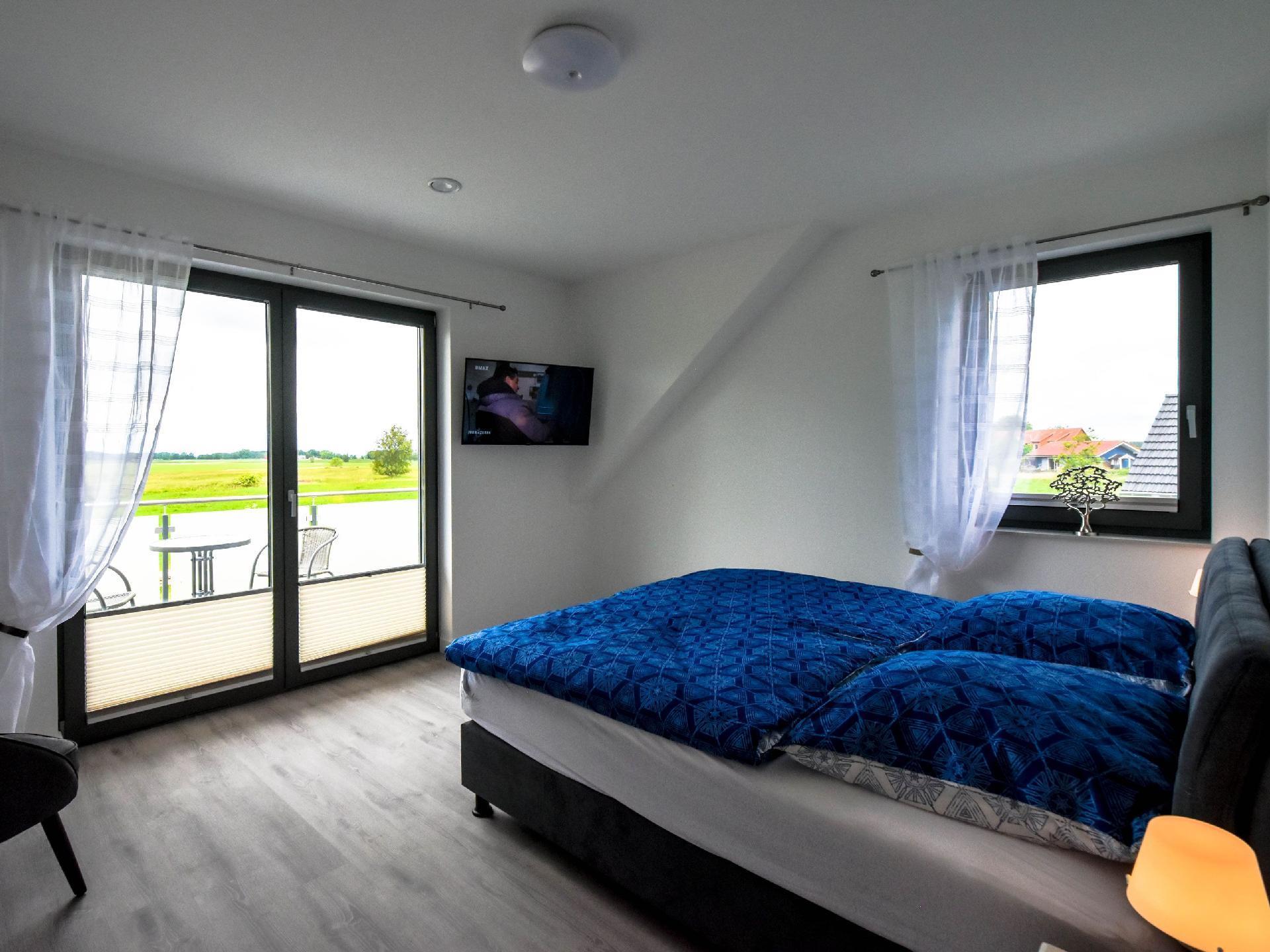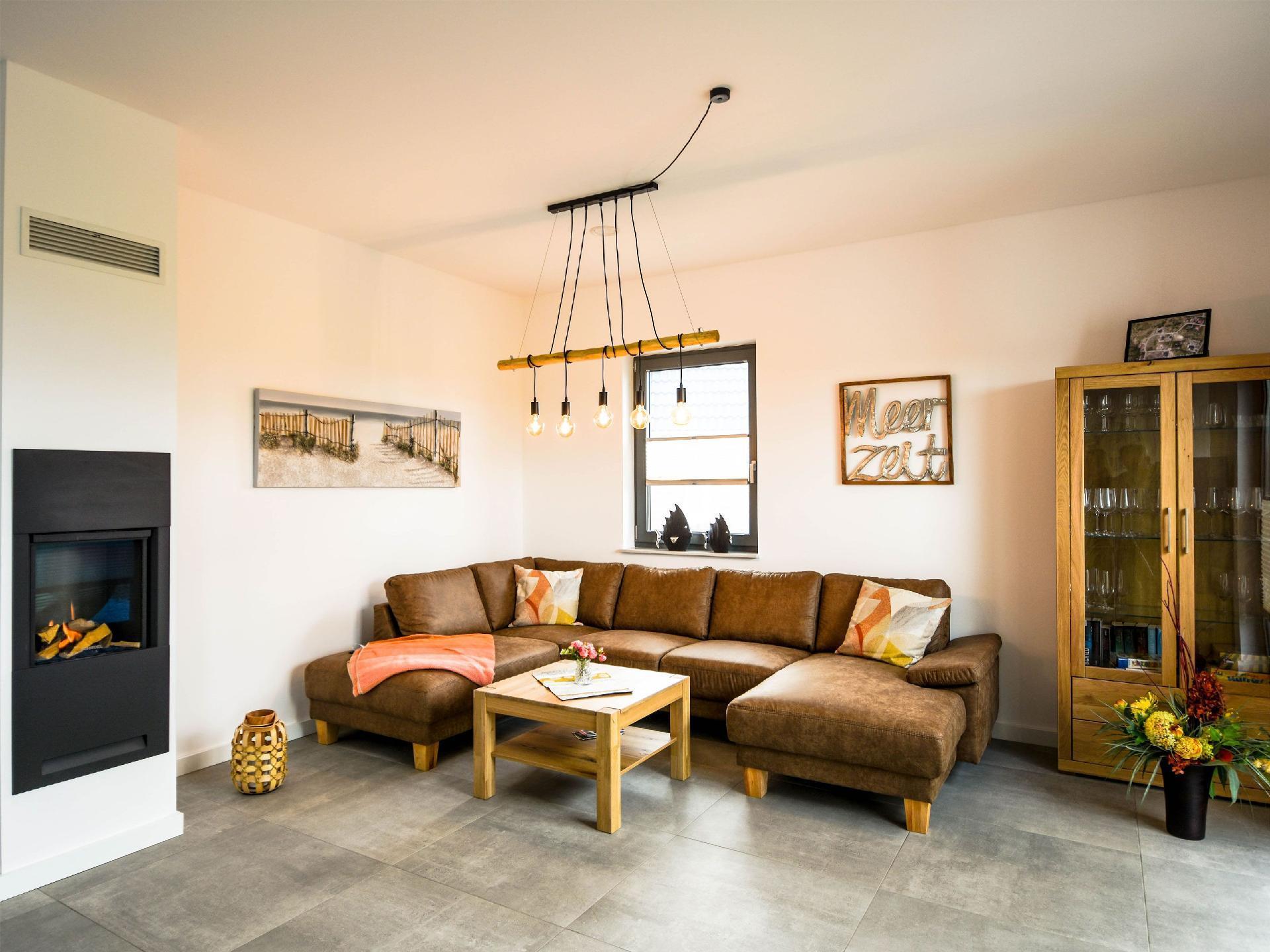 Erleben Sie traumhafte Sonnenuntergänge von der Terrasse oder Balkon im modernen Stil eingerichtet bietet unser Domizil 4 Schlafzimmer mit bequemen Boxspringbetten, 2 Bäder, eine Sauna, moderne Küche mit Kochinsel, Gaskamin mit sofortiger Wärme, Flammenspiel per Fernbedienung einstellbar – täuschend echtes Flammenbild. Wir haben im ganzen Haus Fußbodenheizung. In den Zimmern Designbelag, die Bäder und der Wohnbereich ist gefliest. Machen Sie sich das bei einem schönen Grillabend gemütlich und verweilen Sie auf unserem Balkon oder der Terrasse im Liegestuhl und beobachten im Frühjahr oder Herbst den Kranichflug. Wandern Sie zu unserer Wegkirche in Richtung Landow (2 km).