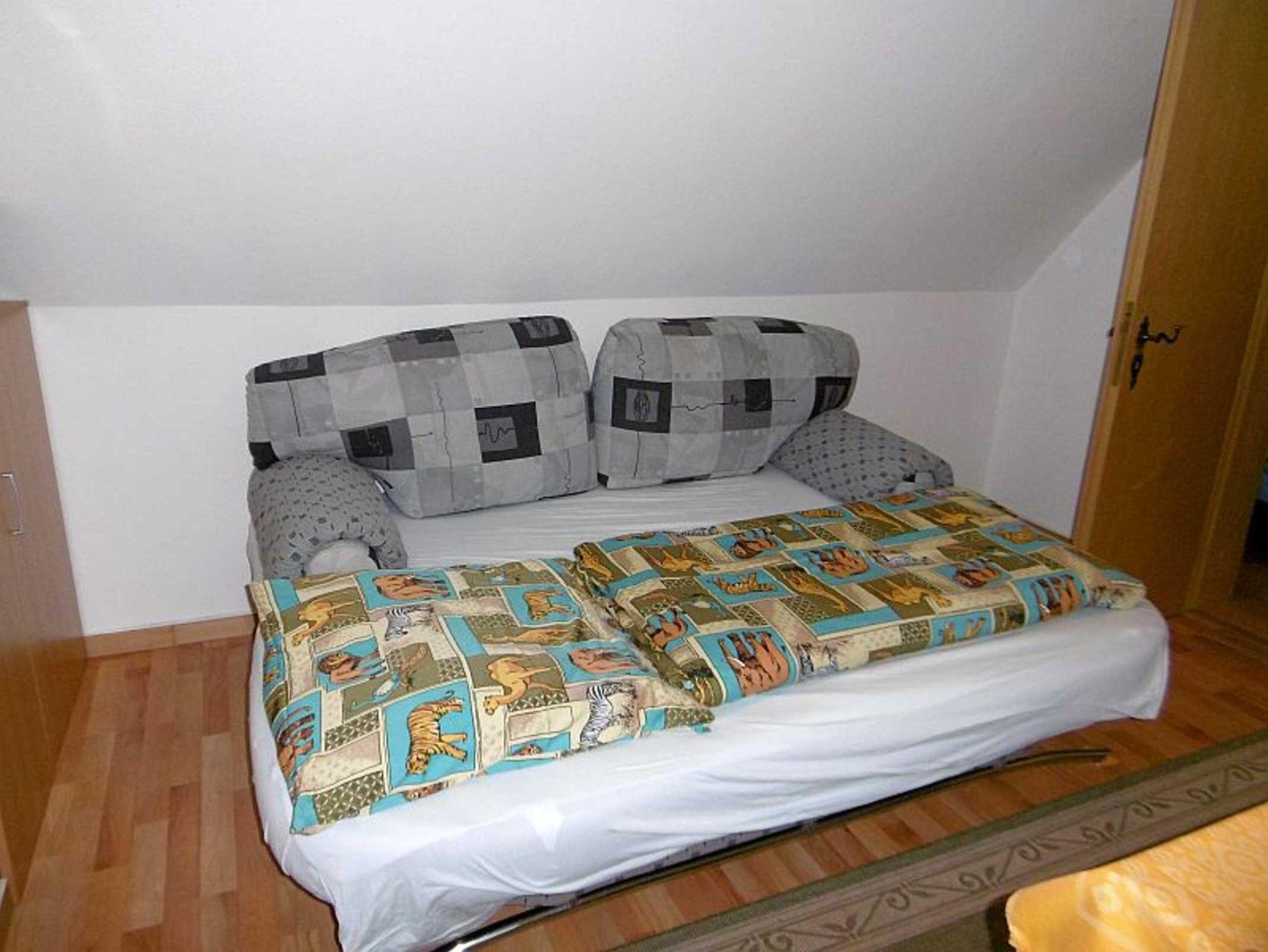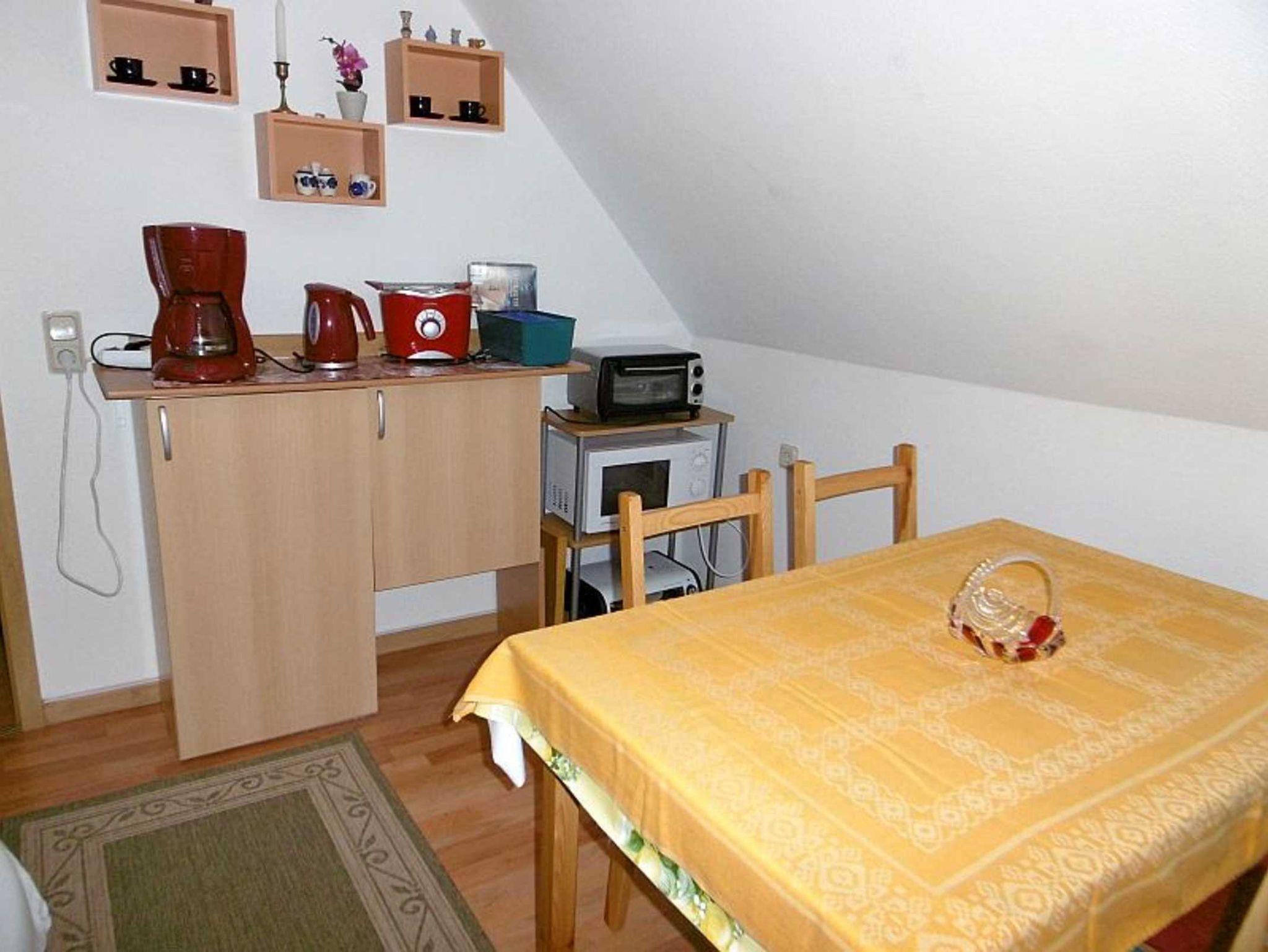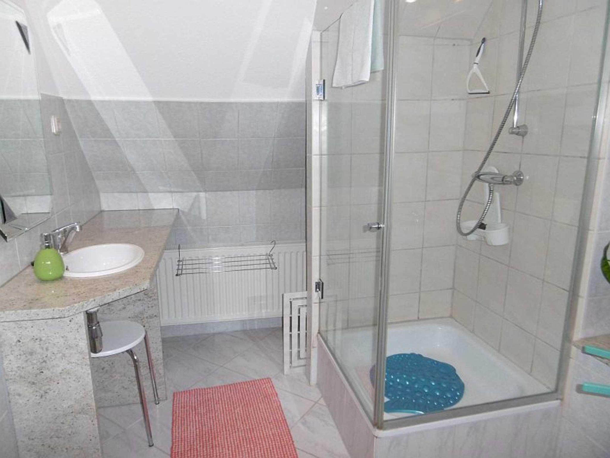 Die Ferienwohnung befindet sich im Obergeschoss und besteht aus einem Wohn-/ Schlafzimmer mit der Sitzgruppe, der modern eingerichteten Küche mit Esstisch und einem Bad mit DU/WC. Die Aufbettungsmöglichkeit besteht in der Wohnküche auf einer Schlafcouch.
