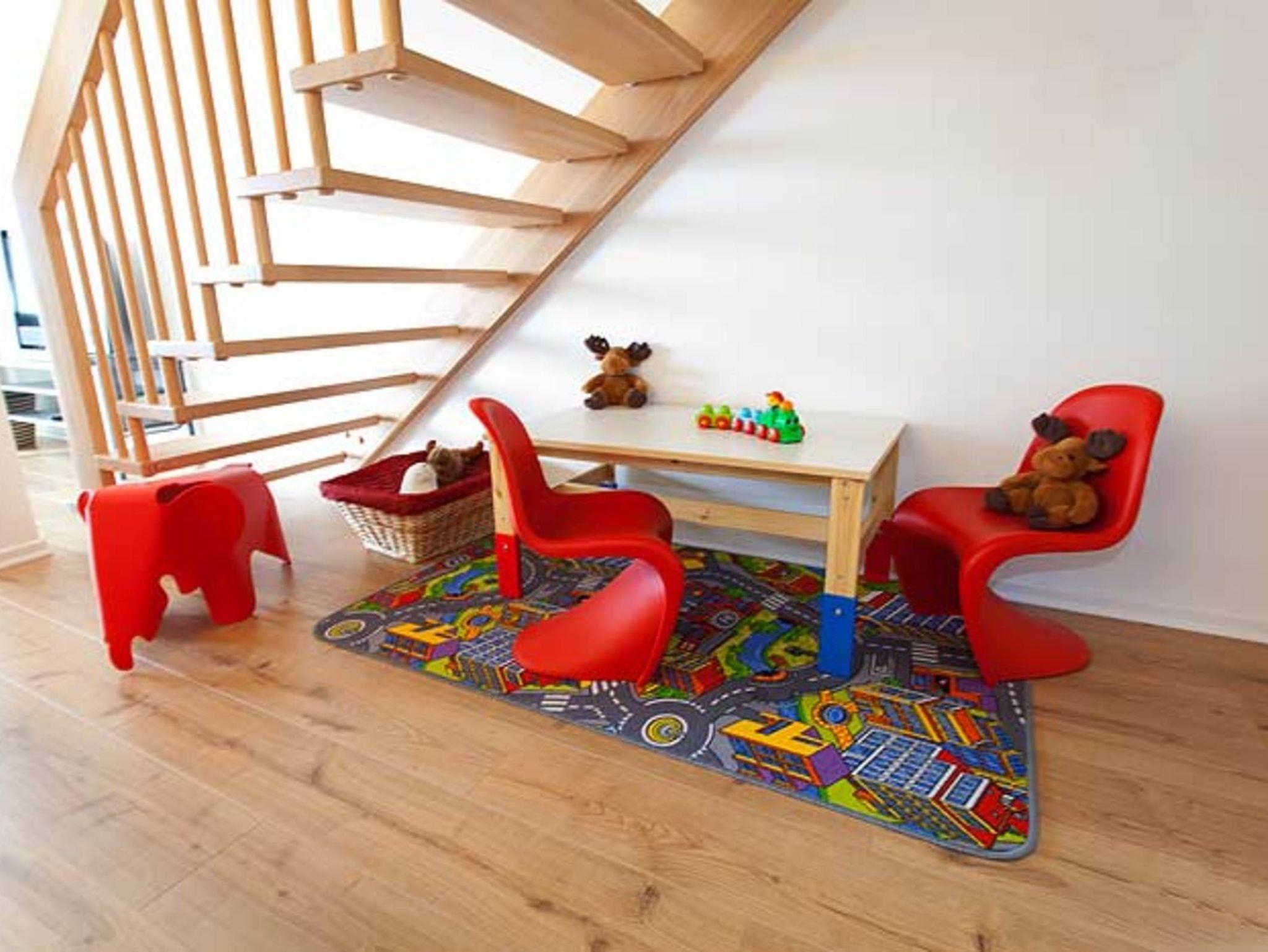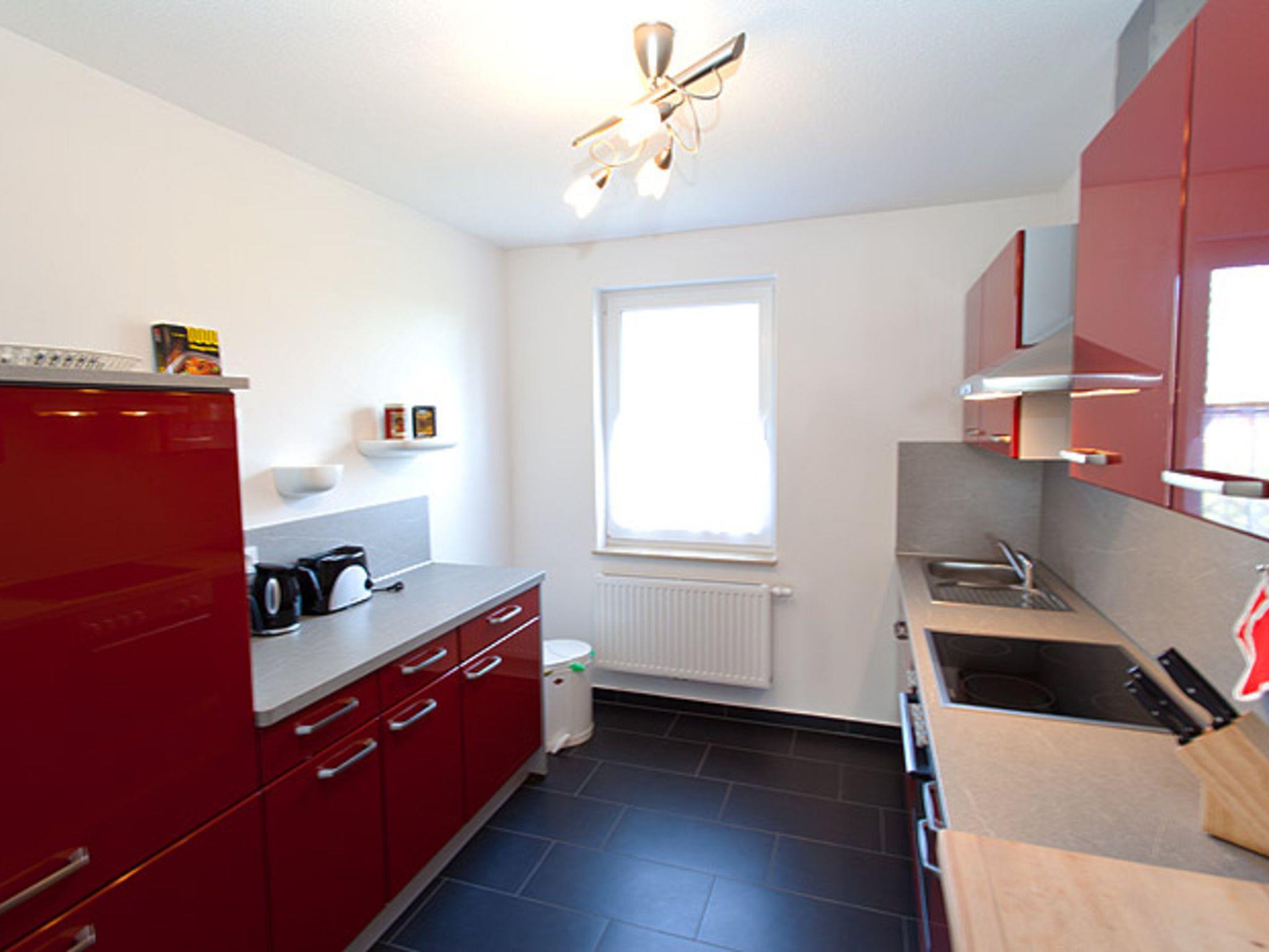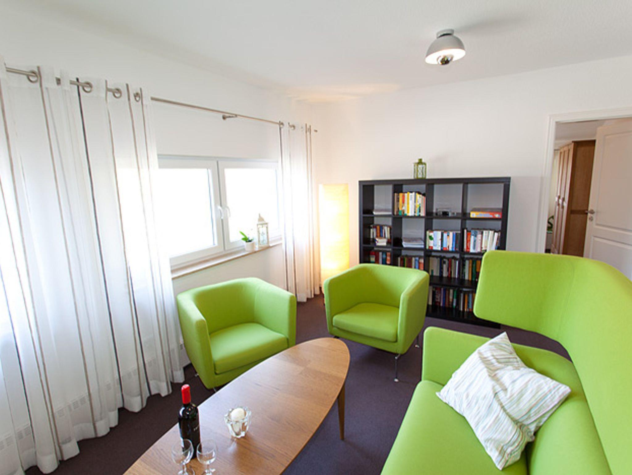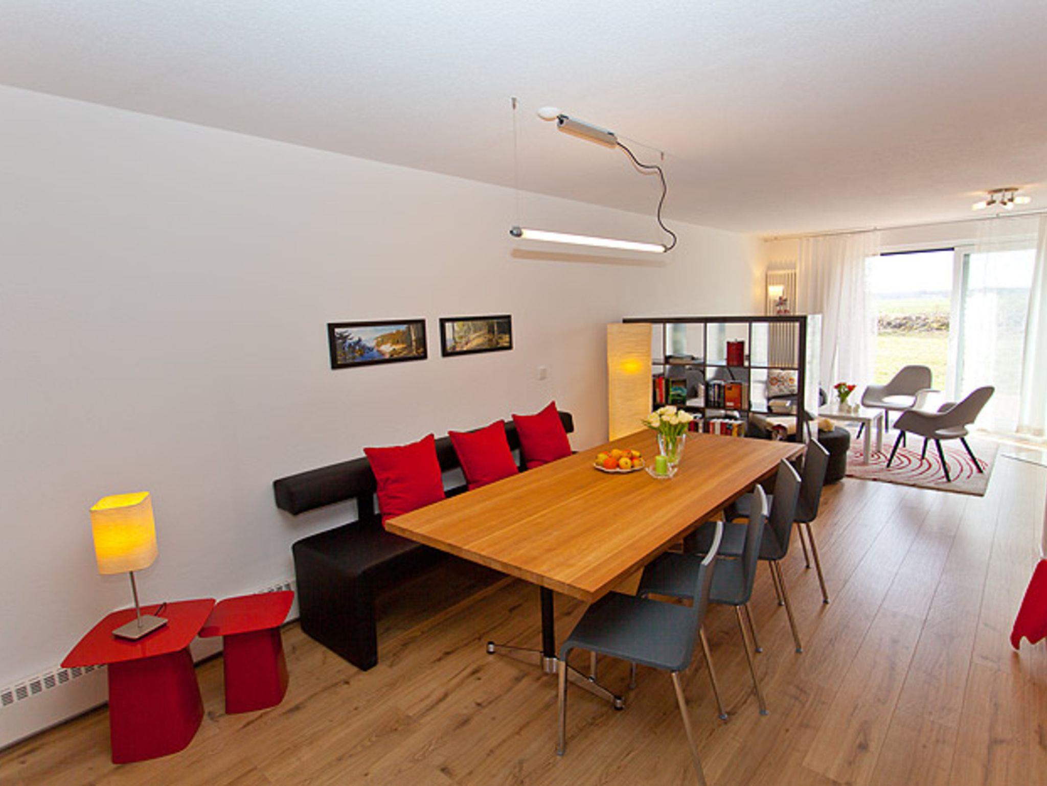 Die Ferienwohnung verfügt in der unteren Etage über ein geraümiges Wohnzimmer mit TV und dem großem Esstisch, der separaten Küche sowie dem Gäste WC.