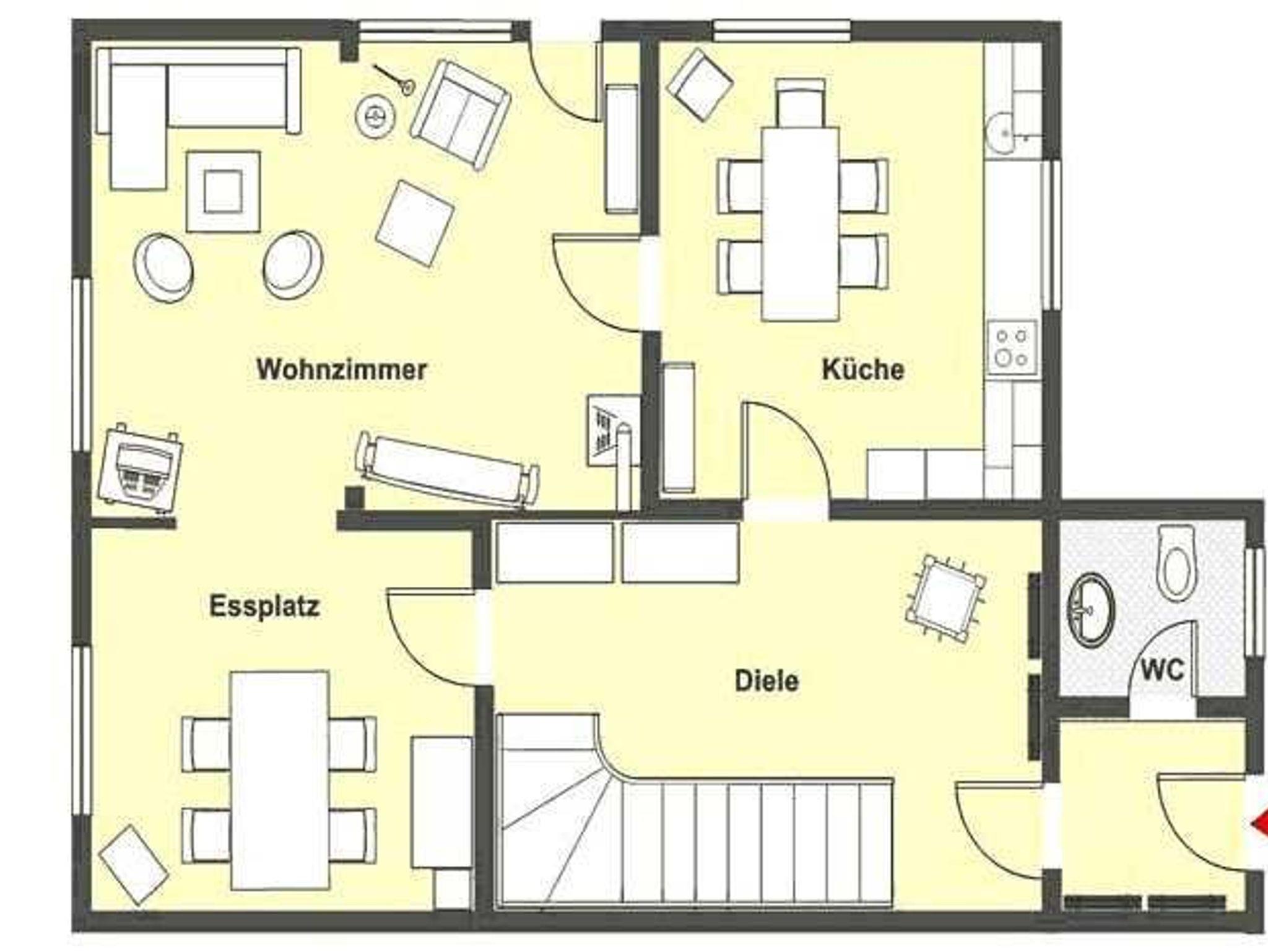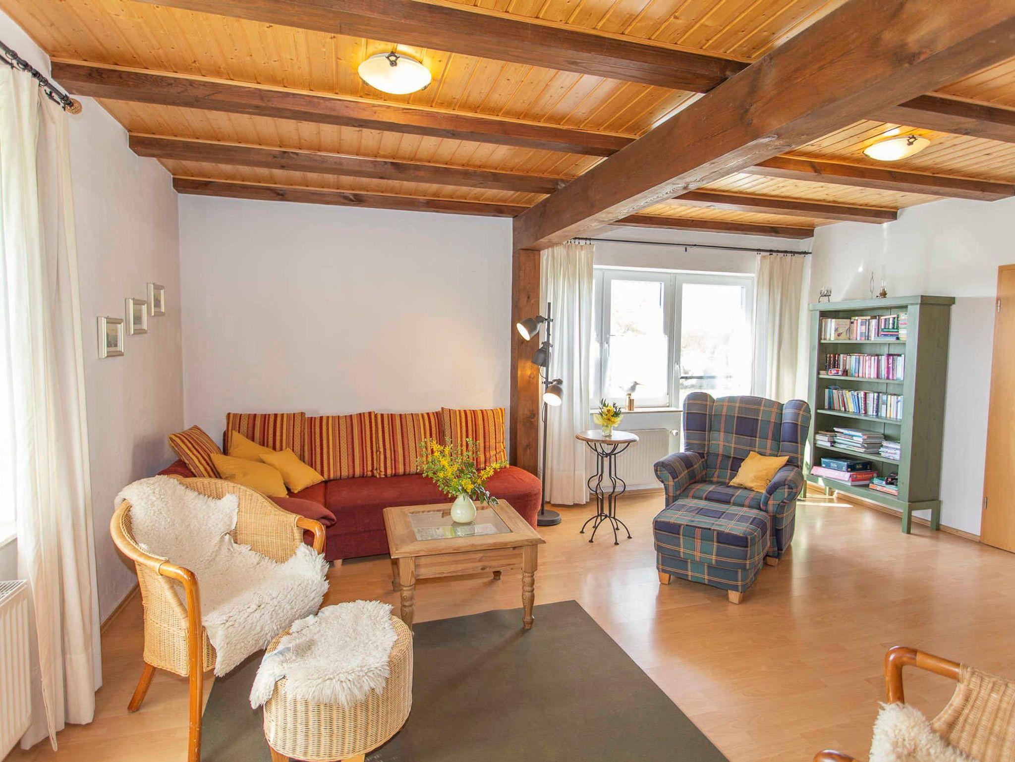 Die Ferienwohnung über 3 Etagen befindet sich auf der rechten Seite des Hauses. Sie verfügt über eine große Küche mit Esstisch und allem was dazu gehört, einem Wohnzimmer mit Sitzgruppe und Kamin, den 2 Schlafzimmern mit Doppelbetten, einem Schlafzimmer mit 2 Einzelbetten und dem Schlazimmer mit einem Einzelbett in der Mansarde, einem Duschbad und einer Gästetoilette. Auf dem großen Grundstück haben Sie die Möglichkeit sich aktiv zu erhohlen.