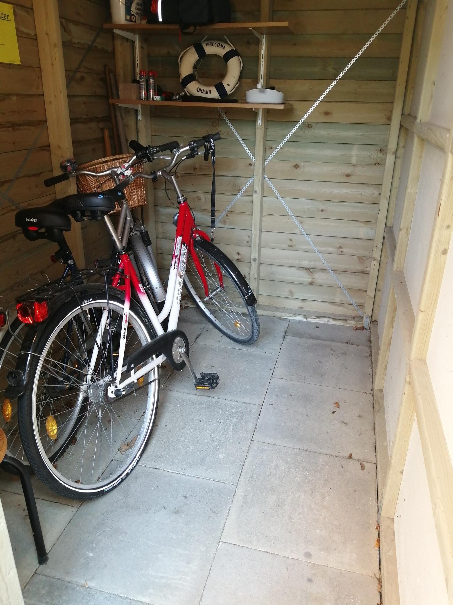 Für die eBIKE Fahrer haben wir in unserem Schuppen (1,50 x 2,30 m) auch eine STECKDOSE zum Laden der Akkus.