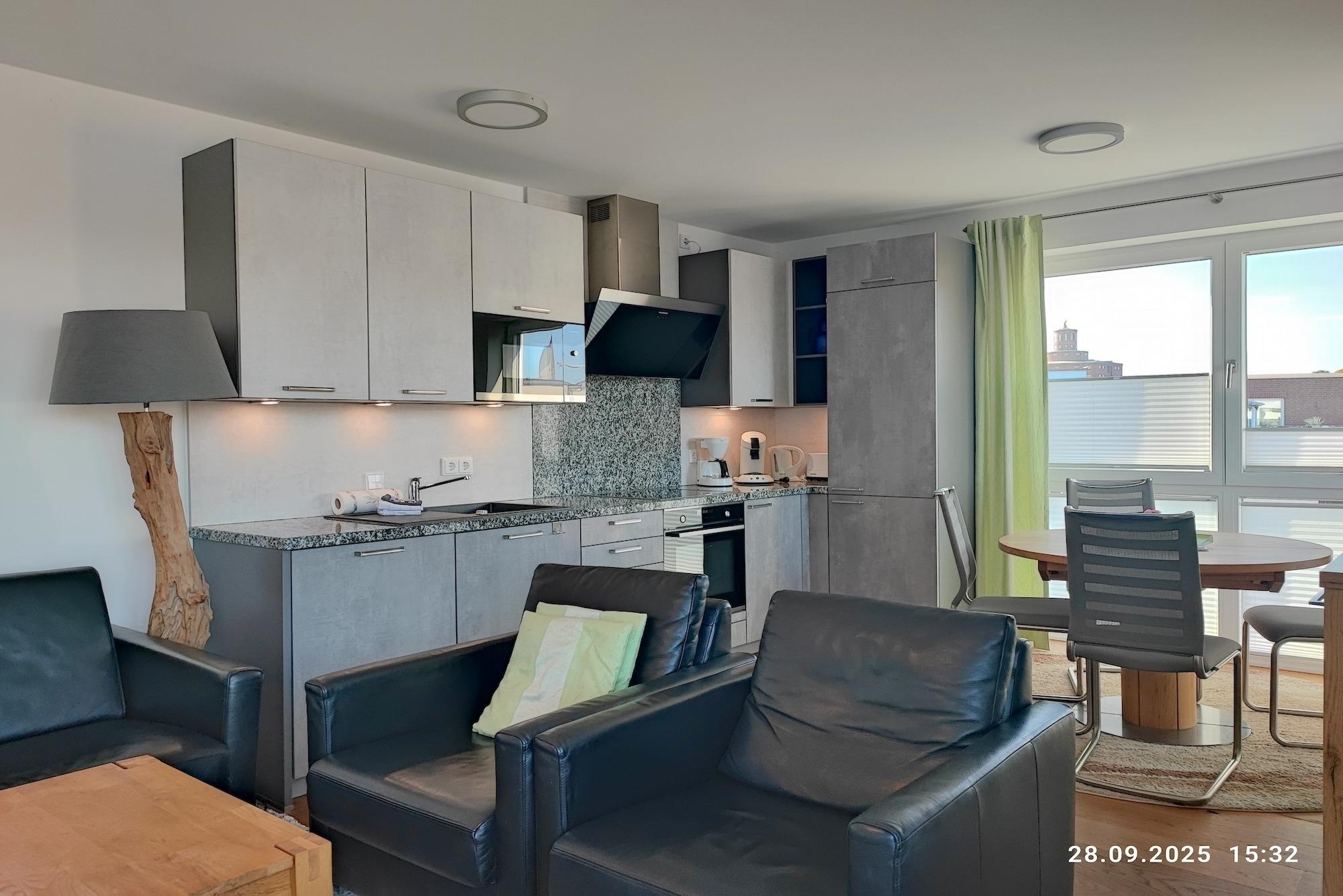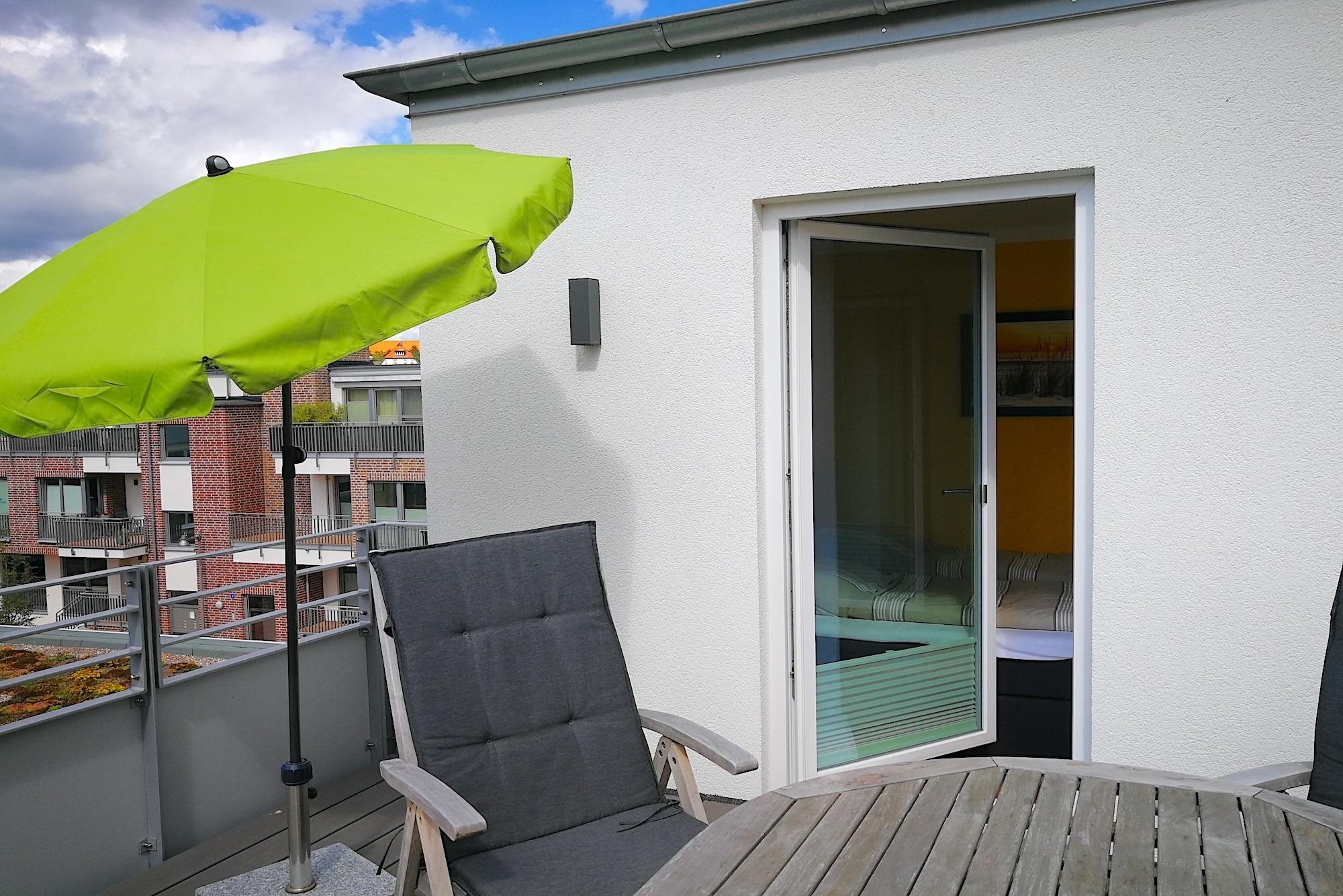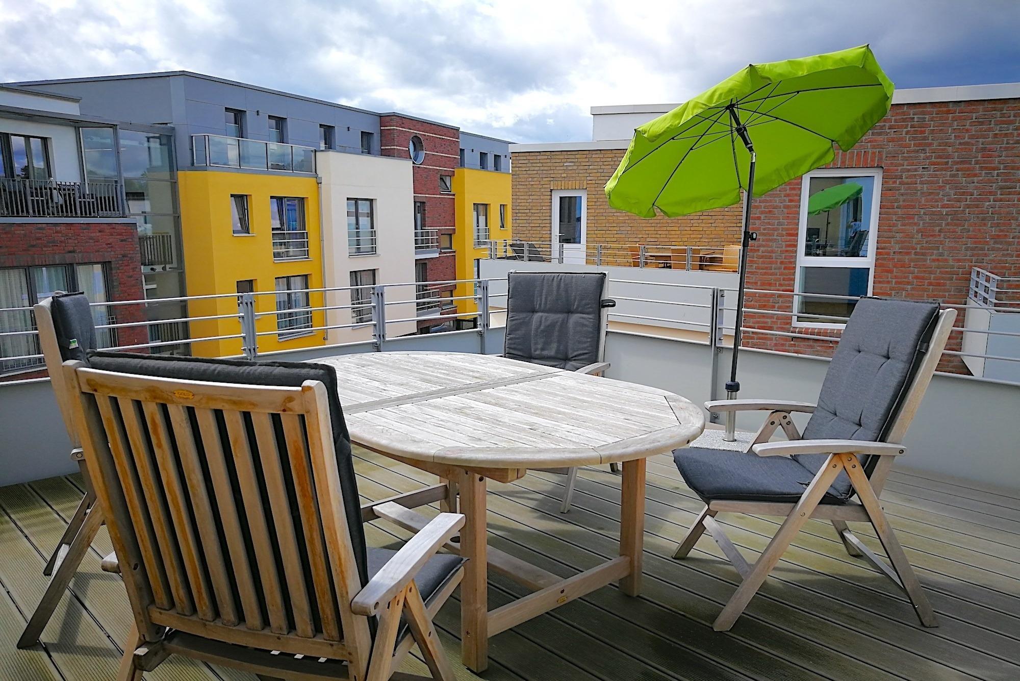 Moderne 5-Sterne Ferienwohnung „Seestern“ in Eckernförde mit Hafenblick, Balkon und Dachterrasse, nur 25 m von der Strandpromenade entfernt.