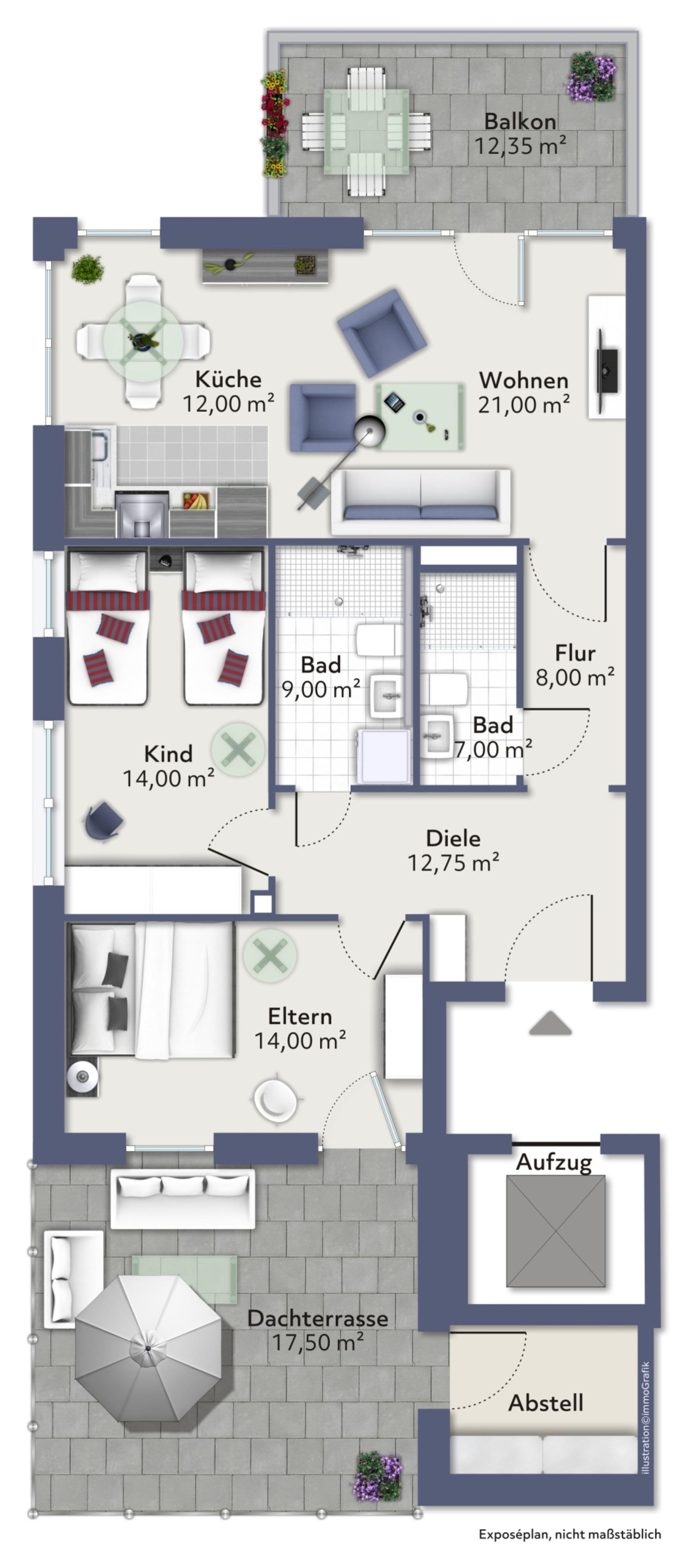 Genießen Sie den Blick durch die bodentiefen Fenster vom Wohnzimmer aus direkt auf das Wasser des Eckernförder Hafens. Der offene, gemütliche Wohn- und Essbereich, mit voll ausgestatteter Küche, la¨dt zum gemeinsamen Entspannen und Kochen ein! Die Ferienwohnung verfügt über einen Balkon und eine Dachterrasse mit wunderschönem Blick auf den Eckernförder Hafen bis nach Borby. Ein Schlafzimmer wurde mit einem modernen Boxspringbett (180x200), einem Kleiderschrank und einem Sessel ausgestattet. Im zweiten Schlafzimmer befinden sich zwei Einzelbetten (80x200) und ein Kleiderschrank. Die Schlafzimmer bieten somit die gewünschte nächtliche Erholung! Die Duschen in beiden Badezimmern sind ebenerdig. Die komplette Wohnung ist mit Echtholzfußboden und Fußbodenheizung ausgestattet. Die im 2. Stock des Appartementhauses gelegene Ferienwohnung kann ''barrierefrei'' über einen Aufzug, mit direktem Zugang aus der Tiefgarage erreicht werden. Die Symbole vom Wohngrundriss können in der Darstellung von der tatsächlichen Innen- und Außengestaltung der Wohnung abweichen!