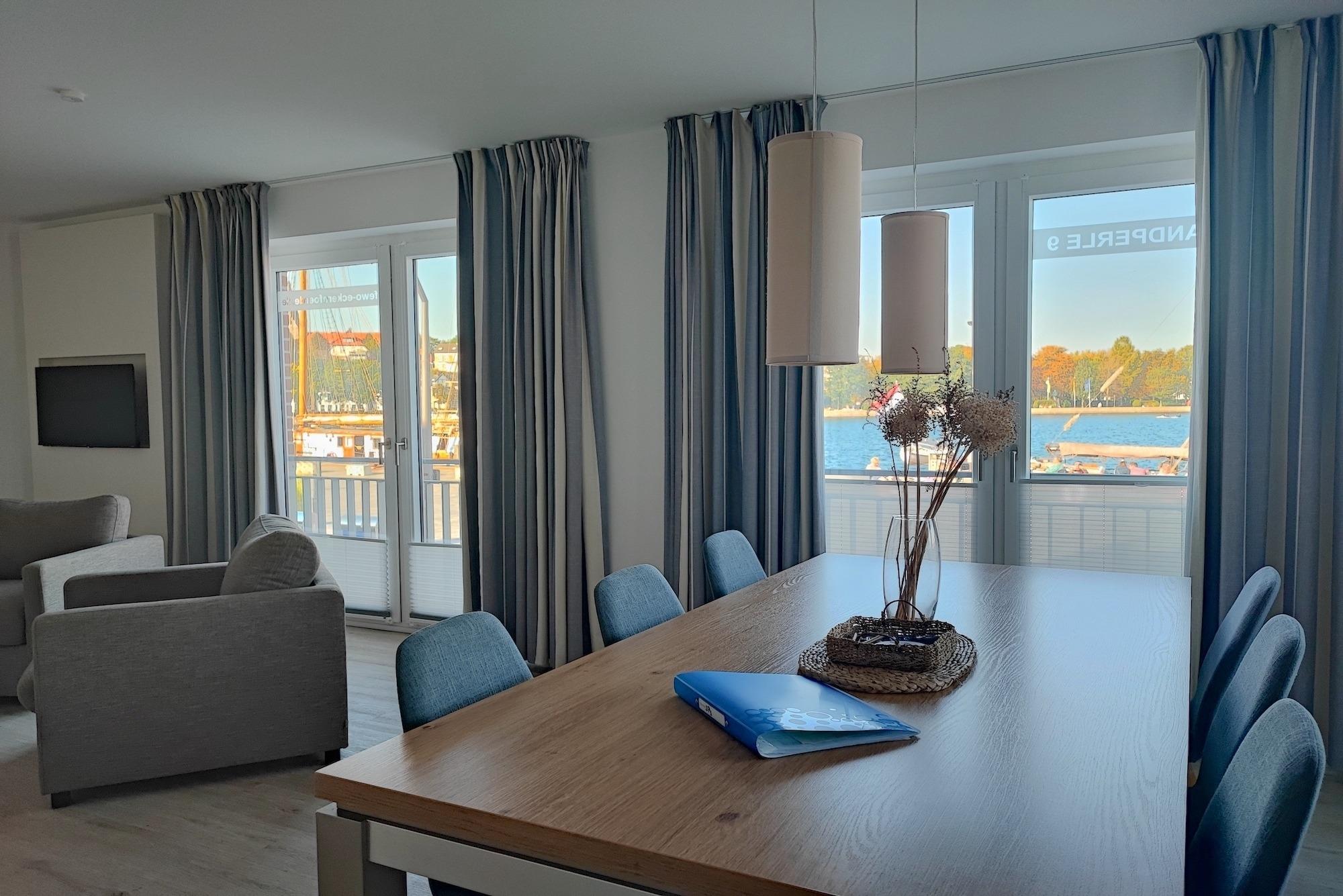 Moderne 5-Sterne-Ferienwohnung mit Hafenblick, Balkon und barrierefreiem Zugang in Eckernförde, nur 25m von Strand und Zentrum entfernt.