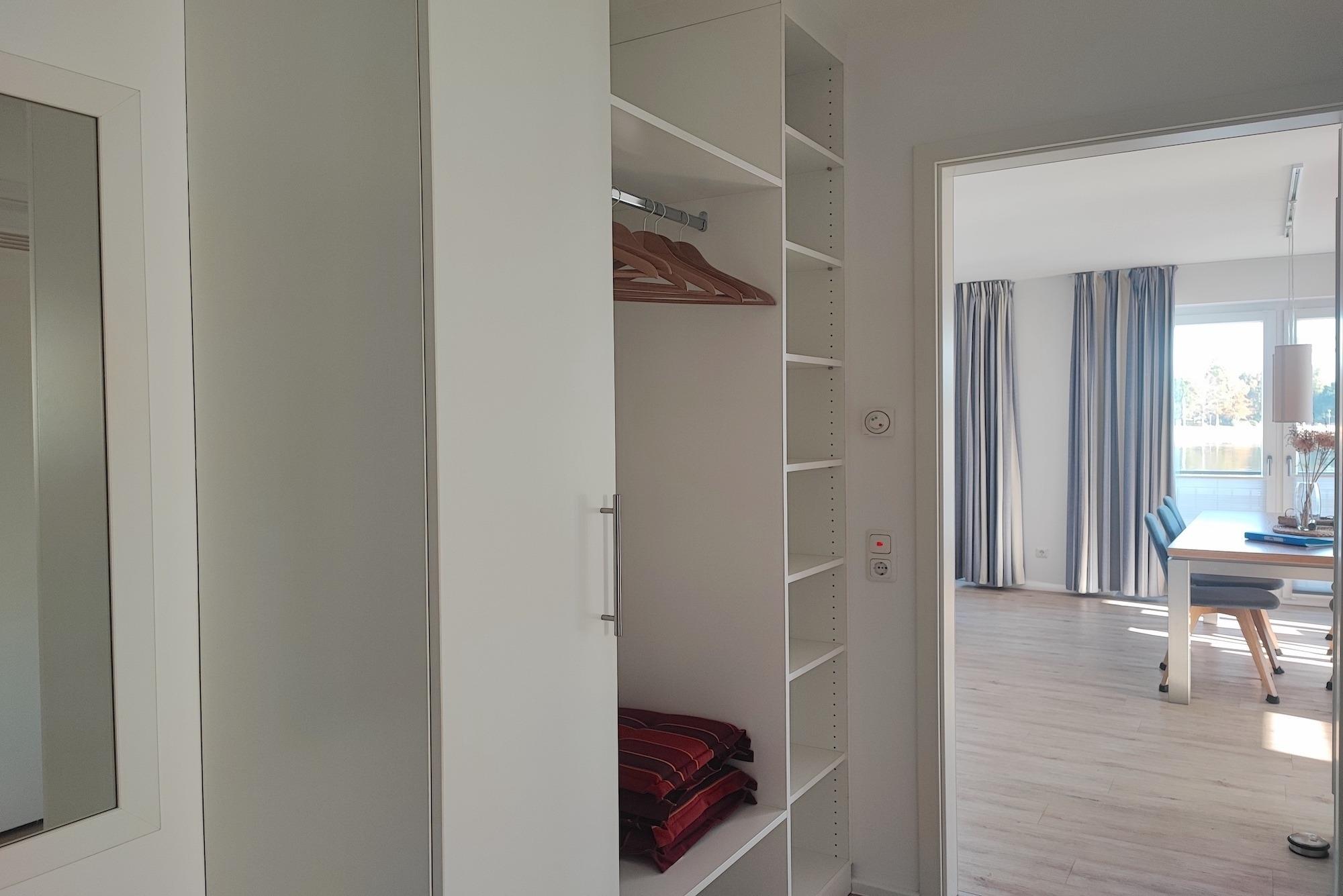 Genießen Sie durch die bodentiefen Fenster oder vom Balkon aus, den weiten Blick über die Hafenpromenade mit Wasserblick. Der stilvoll maritim eingerichtete Wohn- und Essbereich, mit voll ausgestatteter Küche, la¨dt zum gemeinsamen Entspannen und Kochen ein! Die Ferienwohnung verfügt über eine Terrasse mit wunderschönem Blick über das Hafenbecken. Ein Schlafzimmer wurde mit einem modernen Boxspringbett (180x200) und einem Kleiderschrank ausgestattet. Im zweiten Schlafzimmer befinden sich ein zwei zusammenstellbare Einzelbetten (90x200), ein Kleiderschrank und ein TV-Gerät. Die Schlafzimmer bieten somit die gewünschte Erholung! Die Dusche im Badezimmer ist ebenerdig und eine Badewanne in einem weiteren Badezimmer lädt zur Entspannung ein. Die komplette Wohnung ist mit Vinylboden und Fußbodenheizung ausgestattet. Die im Hochperterre des Appartementhauses gelegene Ferienwohnung kann ''barrierefrei'' über einen Aufzug, mit direktem Zugang aus der Tiefgarage erreicht werden. Die Symbole vom Wohngrundriss können in der Darstellung von der tatsächlichen Innen- und Außengestaltung der Wohnung abweichen!