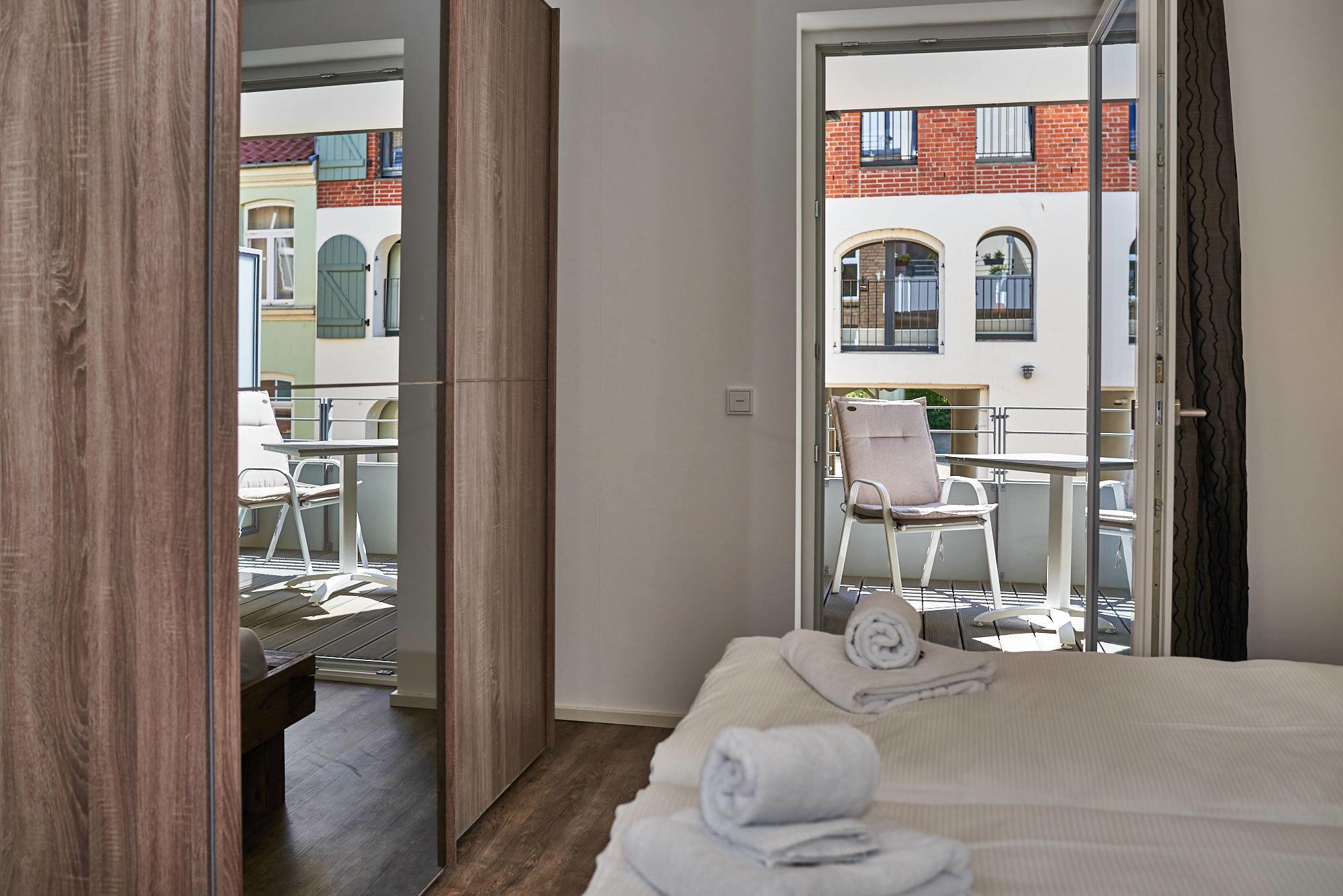 Der offene, mit bodentiefen Fenstern umgebene Wohn- und Essbereich, mit voll ausgestatteter Küche, la¨dt zum gemeinsamen Entspannen und Kochen ein! Die Ferienwohnung verfügt über einen Balkon mit Zugang zum Wohnzimmer und Schlafzimmer. Das Schlafzimmer hat ein modernes Doppelbett (2x90x200), einen großen Kleiderschrank und bietet die gewünschte nächtliche Erholung! Das Badezimmer On-Suite ist mit ebenerdiger Dusche sowie die komplette Wohnung mit Vinylboden und Fußbodenheizung ausgestattet. Die im Hochpaterre des Appartementhauses gelegene Ferienwohnung kann ''barrierefrei'' über einen Aufzug, mit direktem Zugang aus der Tiefgarage erreicht werden. Die Symbole vom Wohngrundriss können in der Darstellung von der tatsächlichen Innen- und Außengestaltung der Wohnung abweichen!