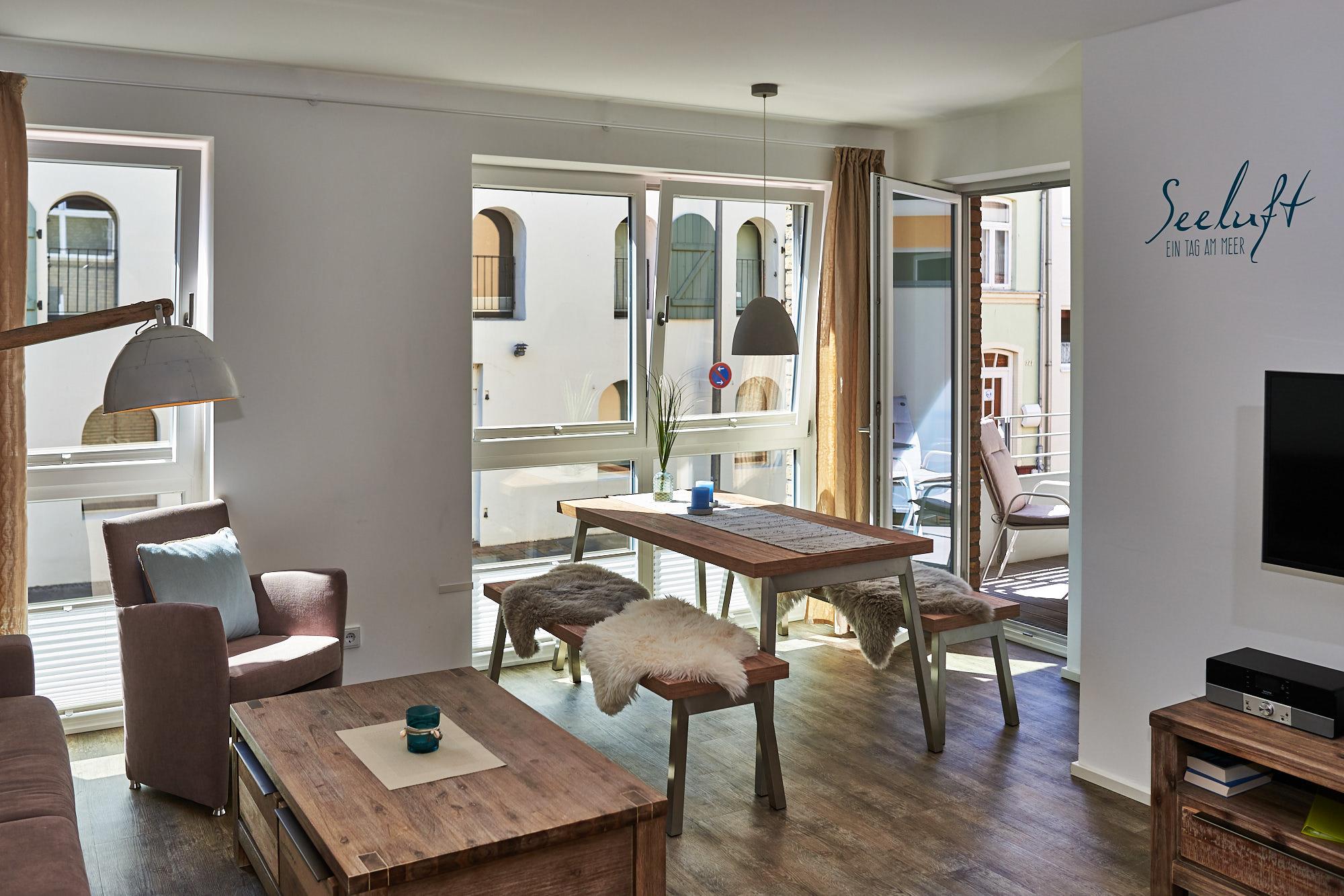 Moderne 4-Sterne-Ferienwohnung "Lachmöwe" in Eckernförde, nur 50m von Hafenpromenade und Strand entfernt, mit Balkon und Tiefgaragenplatz.