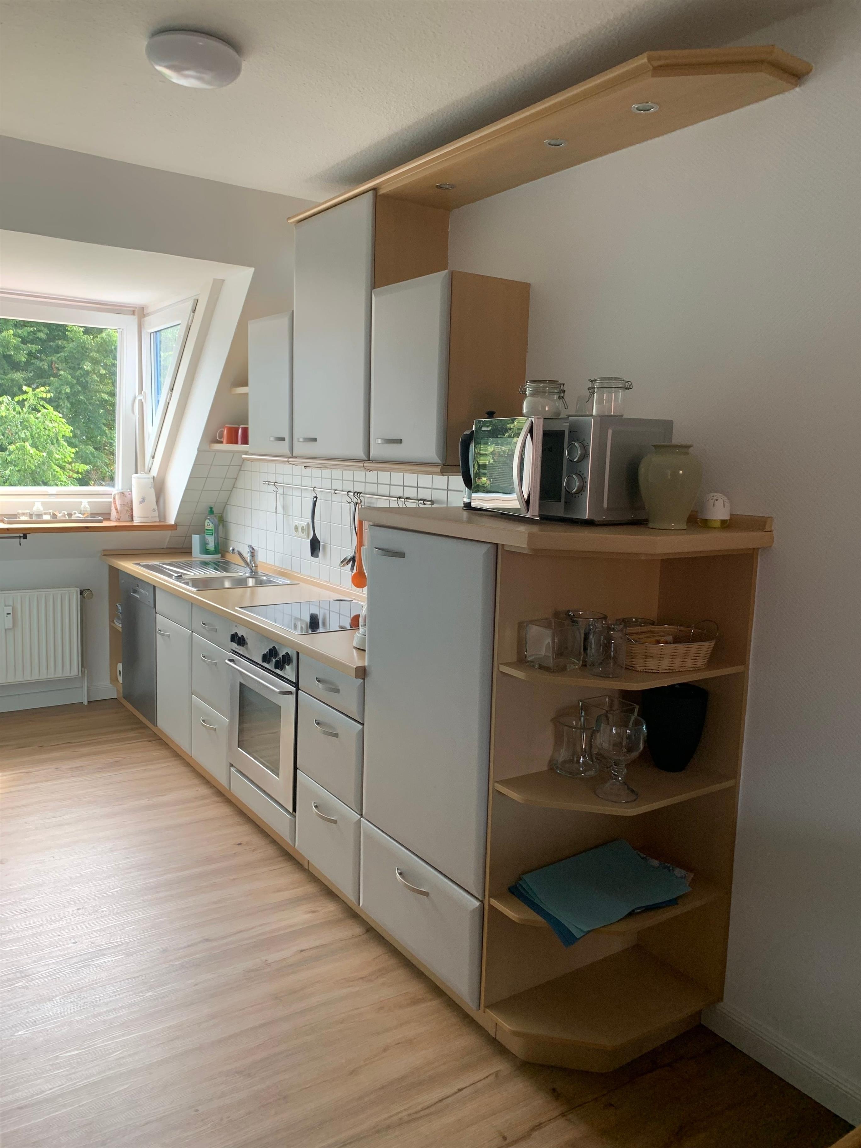 Die leicht vom Wohnbereich abgetrennte Küche ist voll ausgestattet. (Siehe Liste)