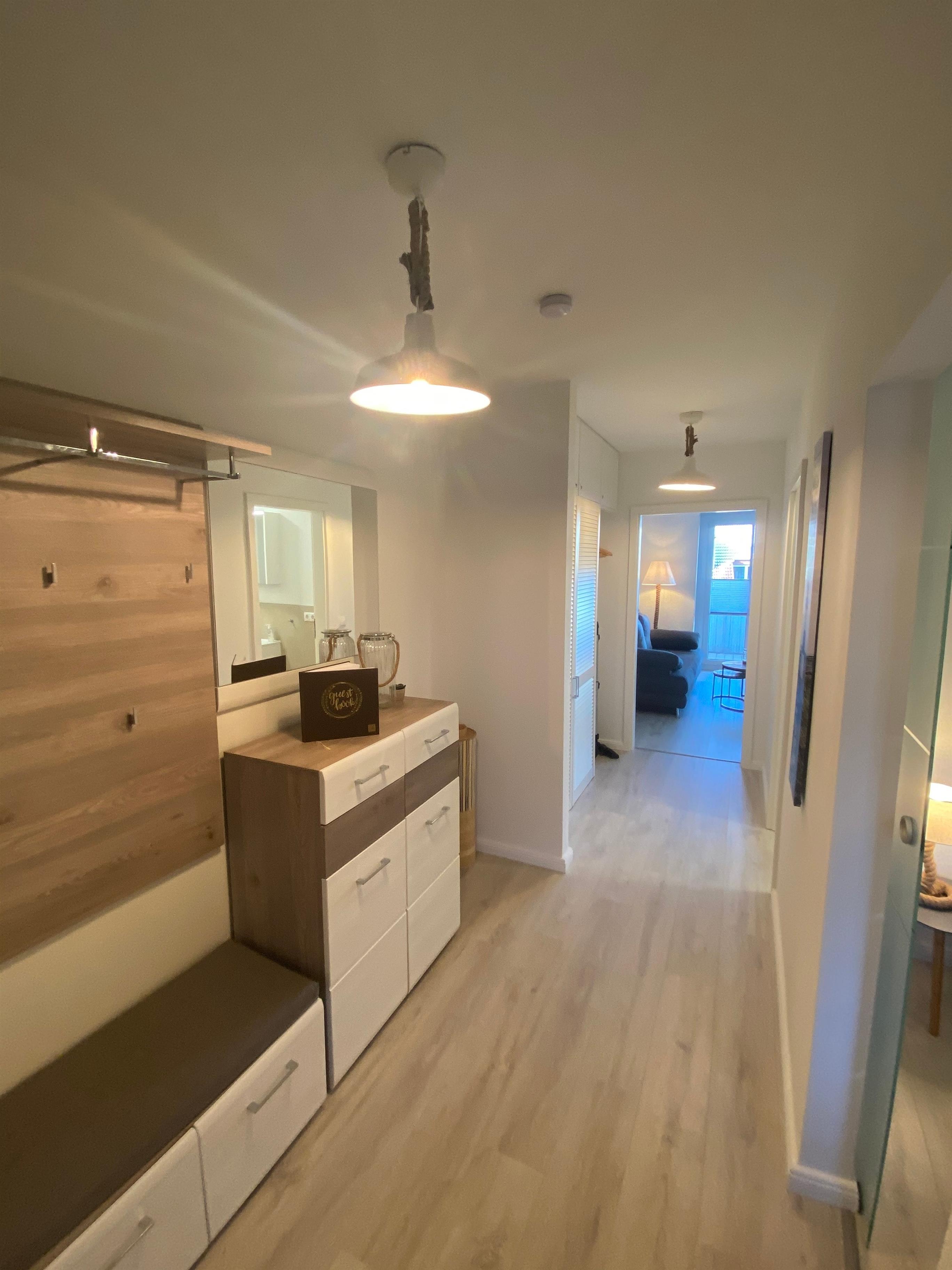 Das kernsanierte und neu eingerichtete 43 qm Ferienapartment befindet sich im 2. OG mit Balkon. Beim Betreten der Wohnung empfängt Sie ein langer Flur, mit viel Staufläche und von dem alle Räume abgehen. Im Wohnzimmer lässt sich alles vereinbaren Essen, Kochen, Relaxen, Entspannen. Die offene, moderne Pantry- Küche ist gut ausgestattet und verfügt über alle Dinge, die sie im Urlaub benötigen. Ein Esstisch lädt zum gemeinsamen Frühstück und Abendessen für 2-4 Personen ein. Das gemütliche Schlafsofa (200 X 150) im Wohnzimmer bietet Platz für eine weitere Person. Im kuscheligen Schlafzimmer (Doppelbett 160 x 200 cm) lässt sich der Abend entspannt ausklingen. Das innenliegende Badezimmer ist modern gefliest und verfügt über eine Dusche.