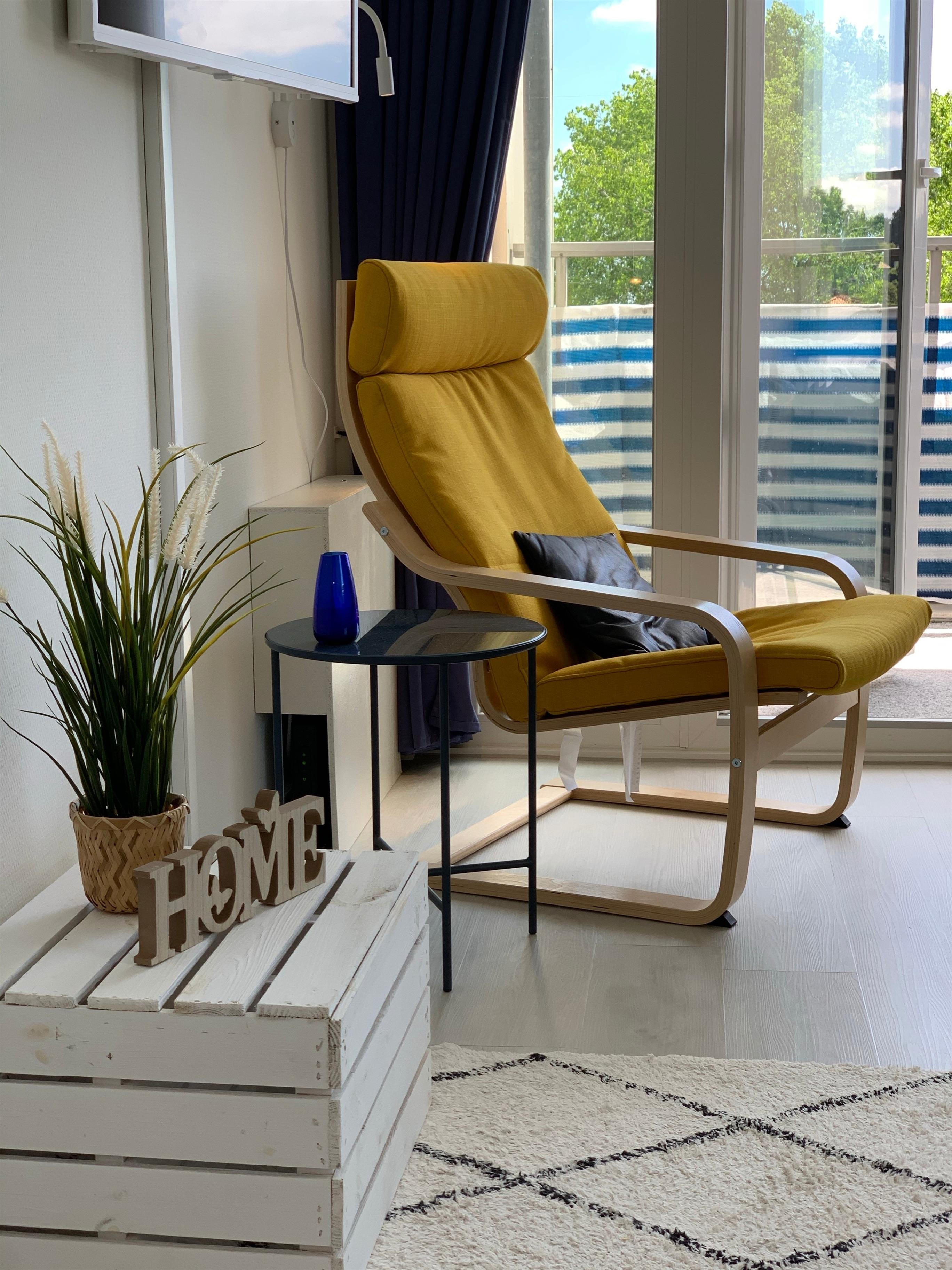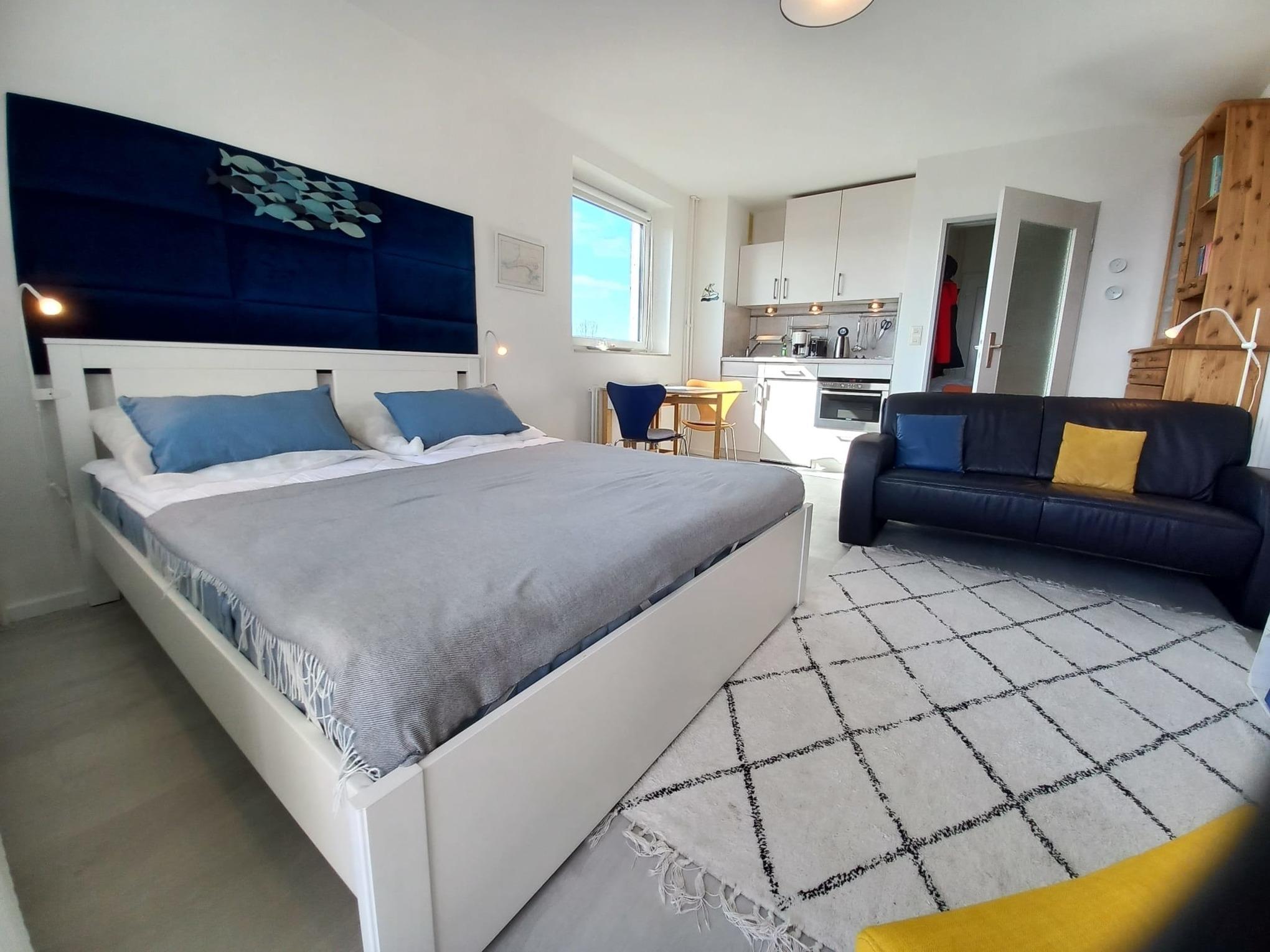 Durch einen geschlossenen Flur, mit Garderobe und einem Wandschrank mit viel Stauraum, gelangen Sie in das helle, freundliche Wohnzimmer. Direkt vom Bett aus (160x200 cm,2 Matratzen 80x200 cm, offenes Fußende, neu in 2023 angeschafft) haben Sie bereits morgens beim Aufwachen durch das große Panoramafenster zum Balkon einen direkten, unverbauten Blick über die Eckernförder Bucht.