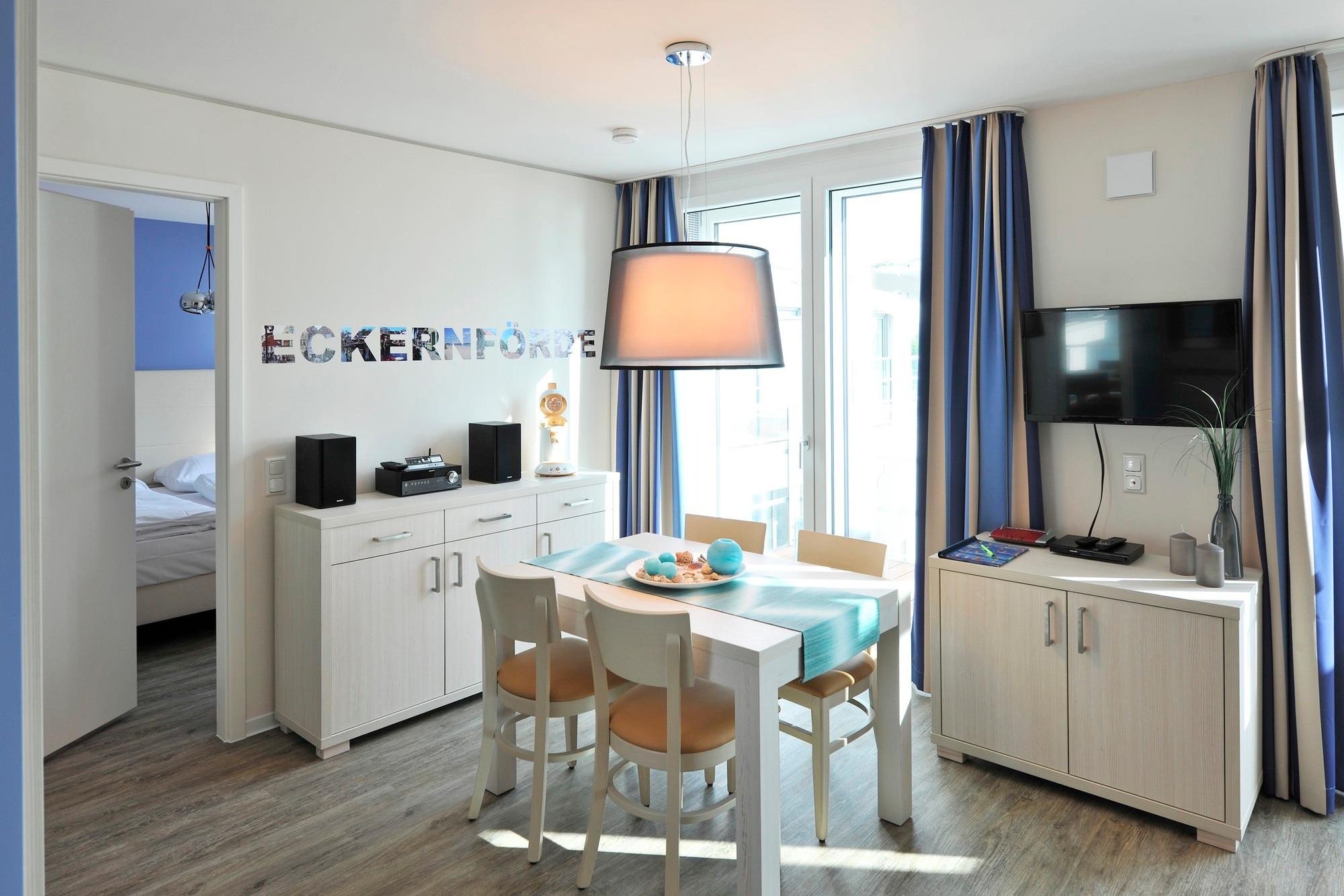 Elegant eingerichtetes Apartment mit Balkon und Meerblick in Eckernförde, ideal für einen erholsamen Urlaub mit Komfort und Nähe zur Innenstadt.