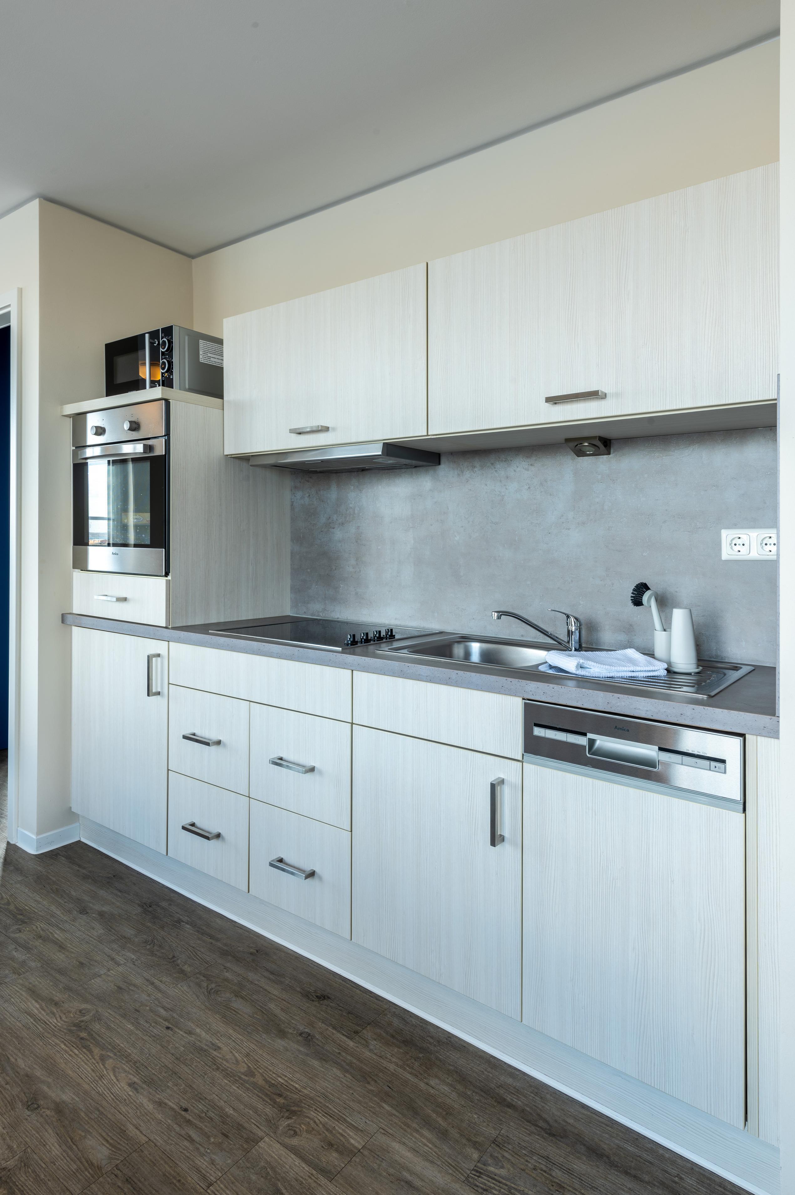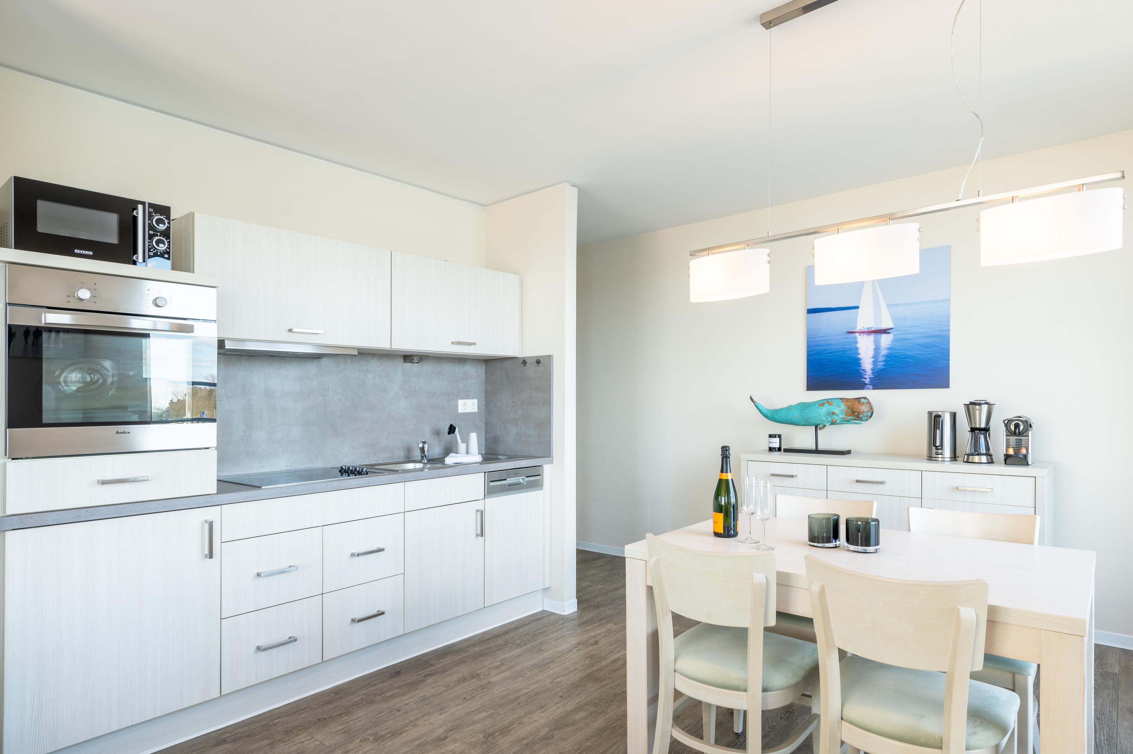 • Küche mit Herd, Backofen, Geschirrspülmaschine, Mikrowelle,