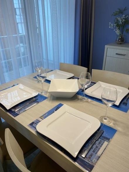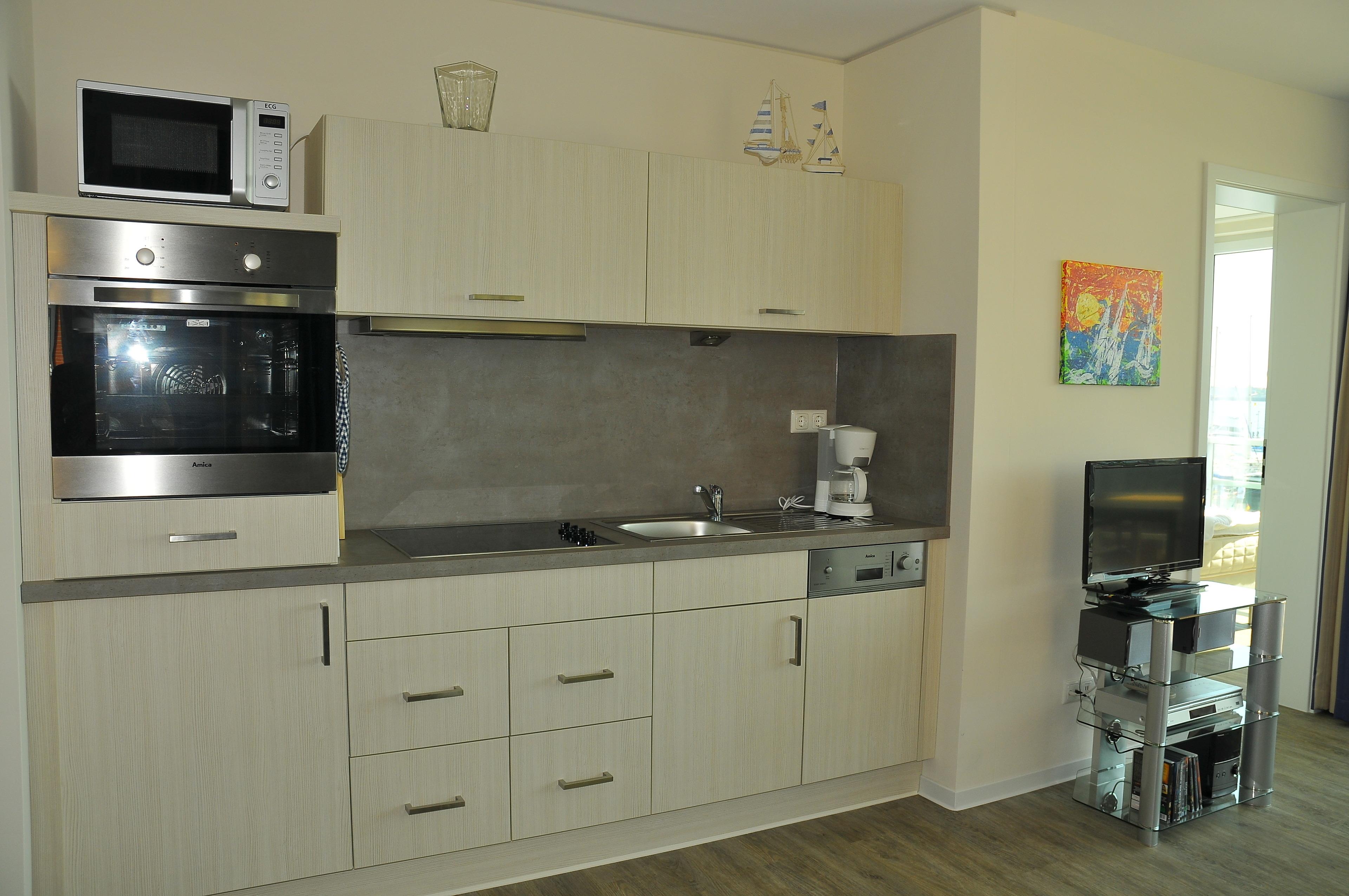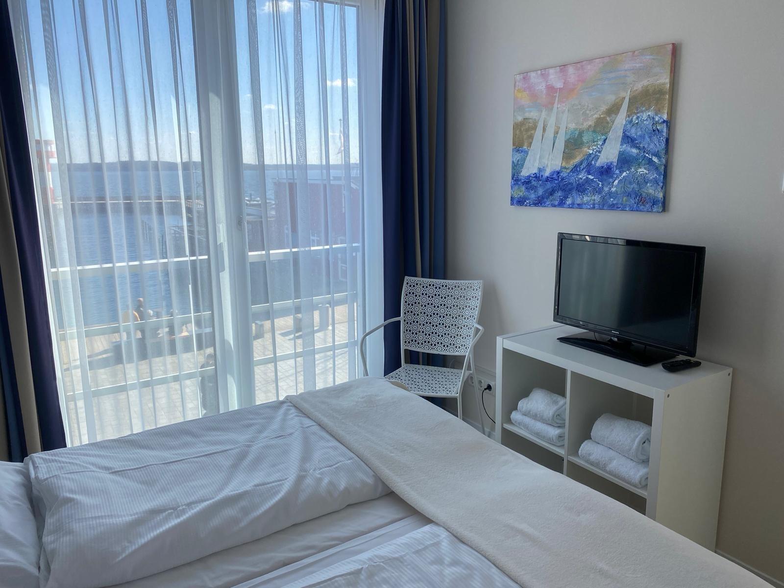 Das Wohnzimmer verfügt über eine gemütliche Sofaecke (neues bequemes Schlafsofa für zwei Personen) mit Meerblick, einen Essplatz und eine voll ausgestattete Küchenzeile mit Geschirrspüler, Backofen und Mikrowelle. Internetzugang, Flachbildschirm, Stereolage und DVD-Player gehören selbstverständlich zum Inventar. Kinderhochstuhl und -bett können dazu gestellt werden. Das Schlafzimmer bietet komfortable Boxspringbetten für einen erholsamen Schlaf (Tiefenreinigung der Matratzen im Januar 2021). Das Erwachen mit Morgensonne und Meerblick lässt den Tag fröhlich beginnen. Das modern ausgestattete Bad verfügt über eine ebenerdige Dusche. Ein Balkon mit Sitzmöbeln lädt zu genussvollen Mahlzeiten mit Blick auf das offene Meer, den Jachthafen und Strand ein, ein zweiter Balkon mit Liegen zum Entspannen in der Nachmittags- und Abendsonne. Durch die Überdachung beider Balkone ist dort auch ein Aufenthalt bei leichtem Regen möglich.