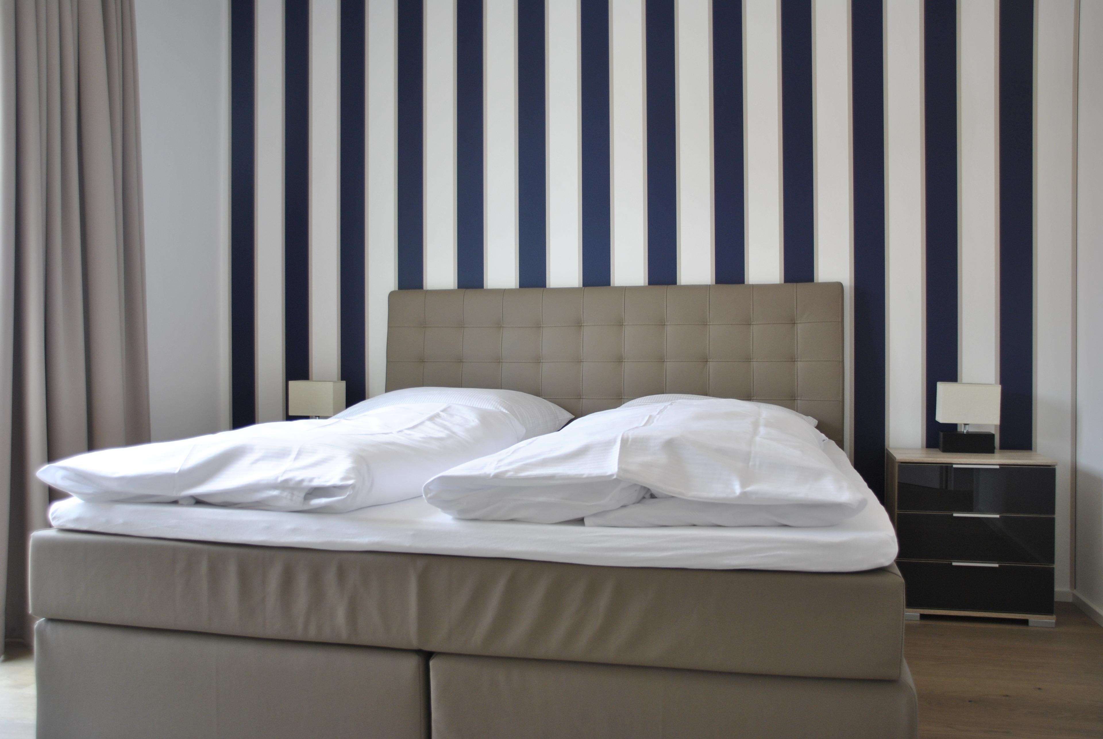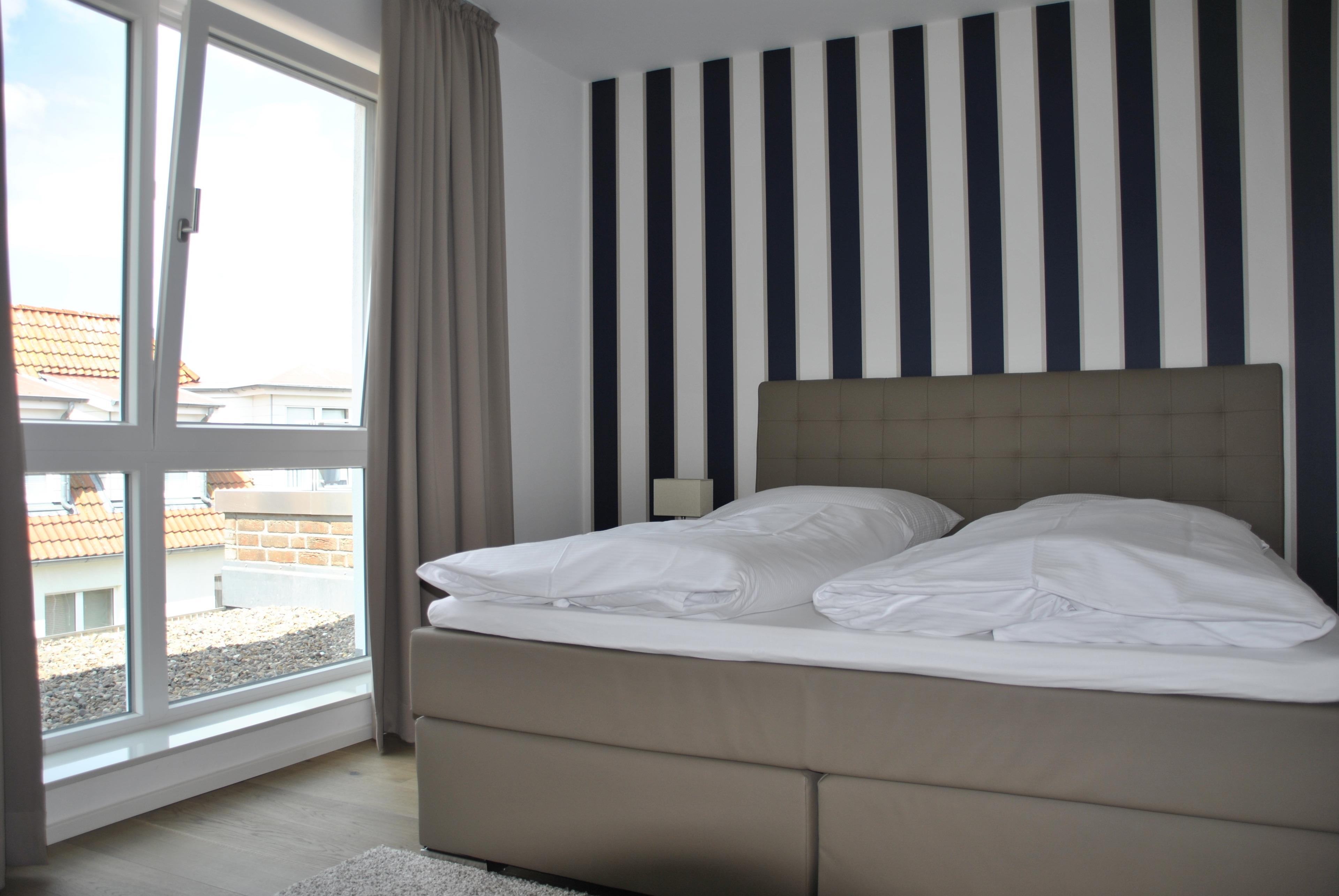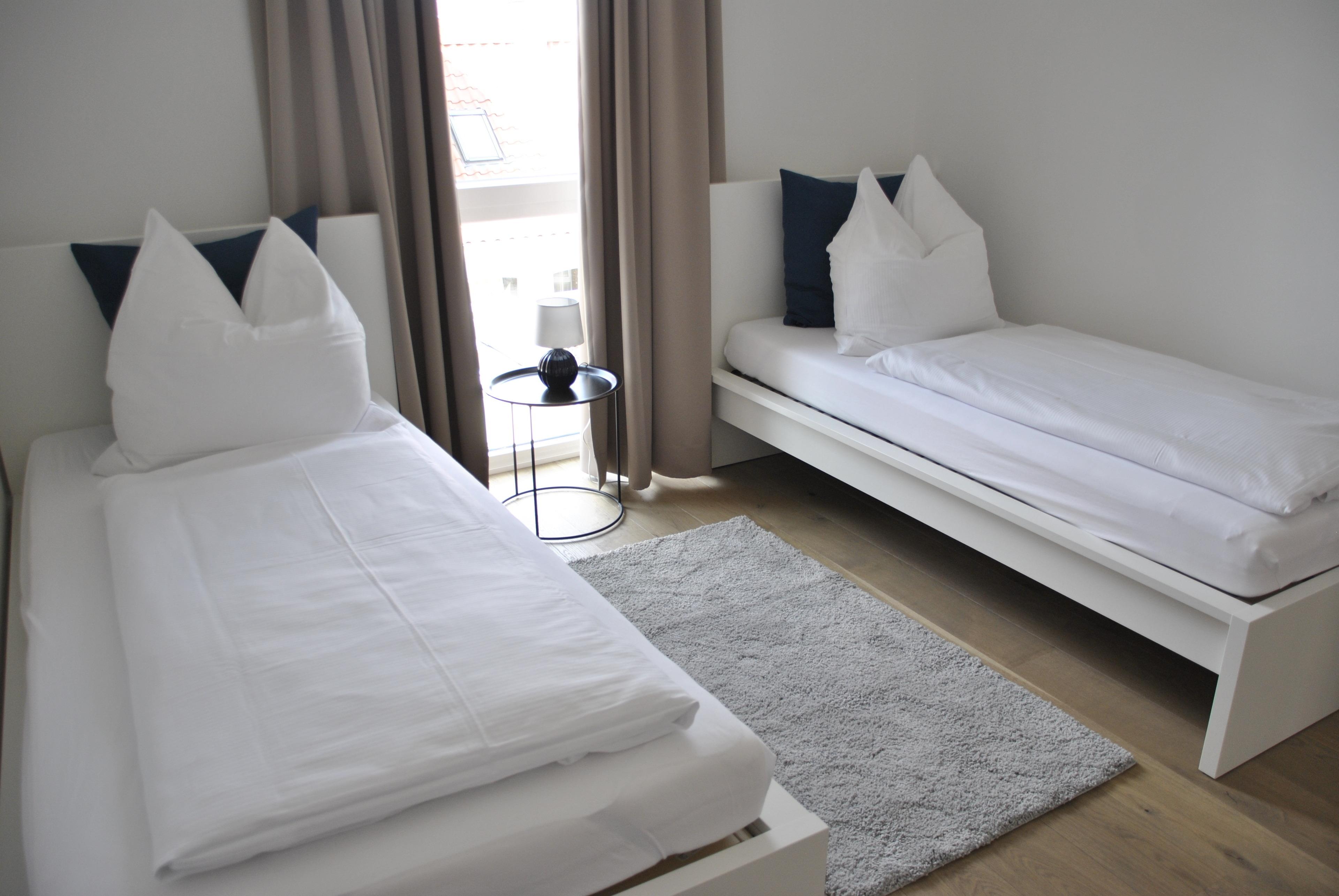 1 Schlafzimmer ist mit einem Boxspringbett (180x200) ausgestattet, das 2. Schlafzimmer mit 2 Einzelbetten (jeweils 80x200), die auf Wunsch auch als Doppelbett zusammengestellt werden können.