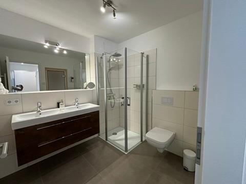 1 Badezimmer mit Dusche, Doppelwaschbecken und WC.