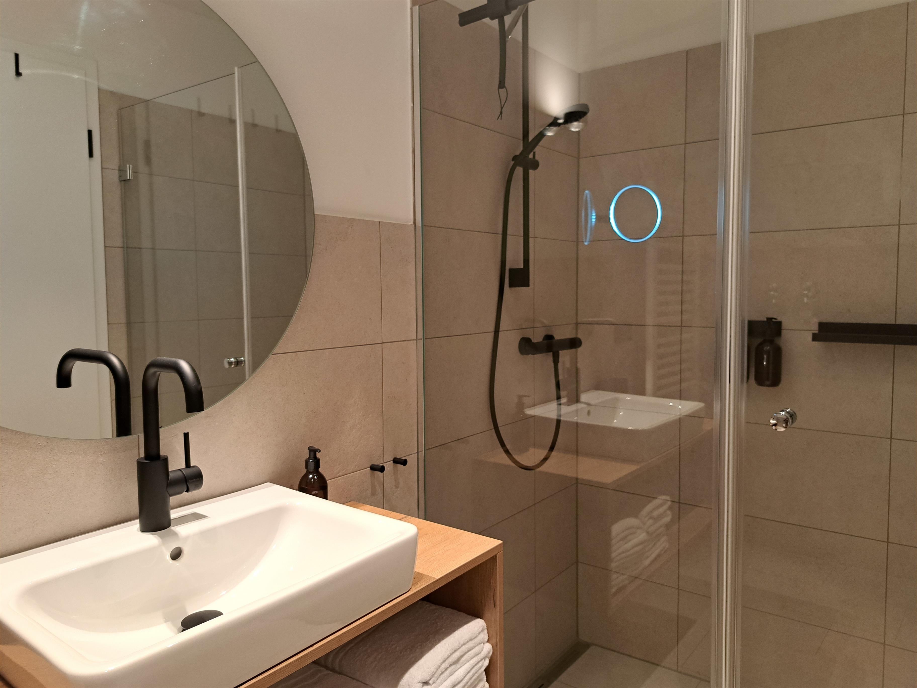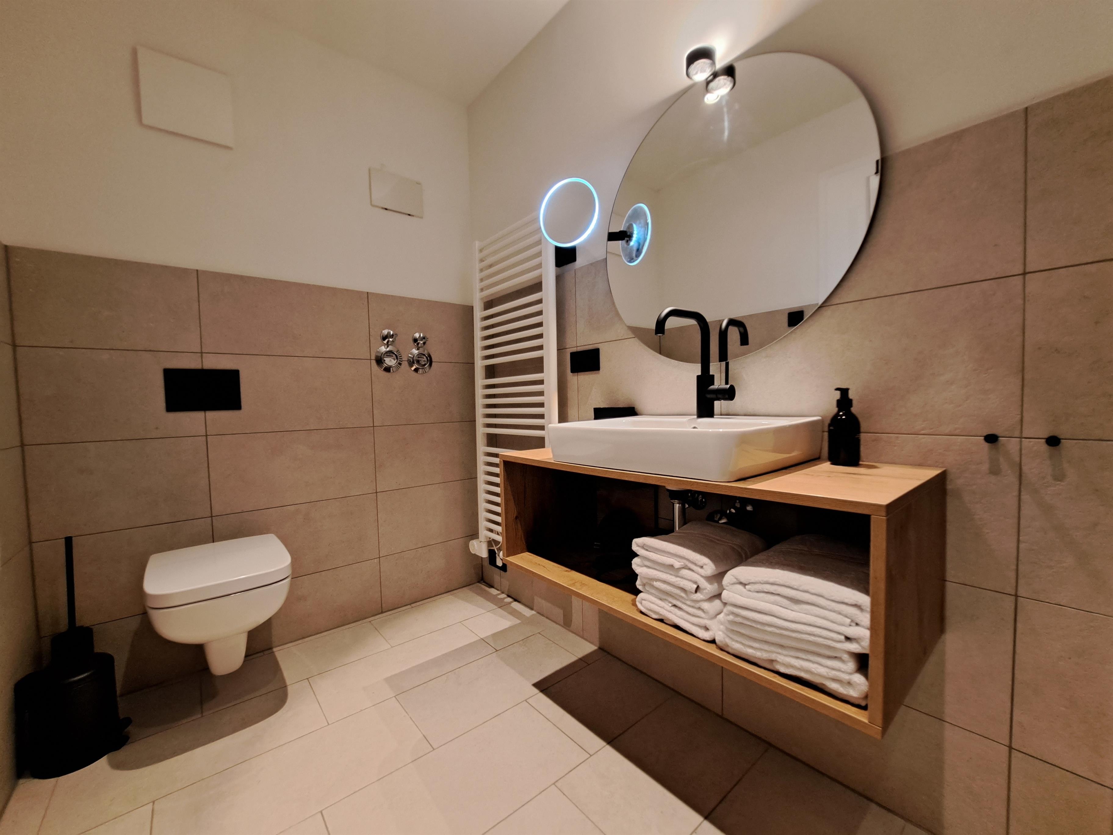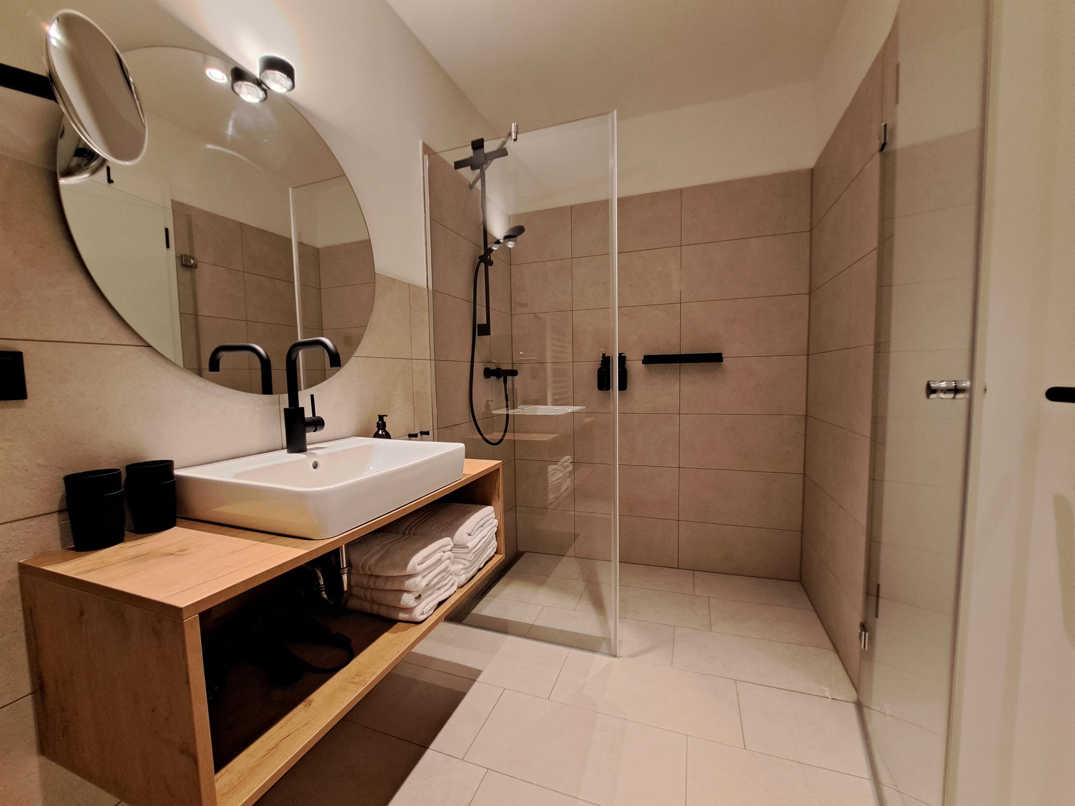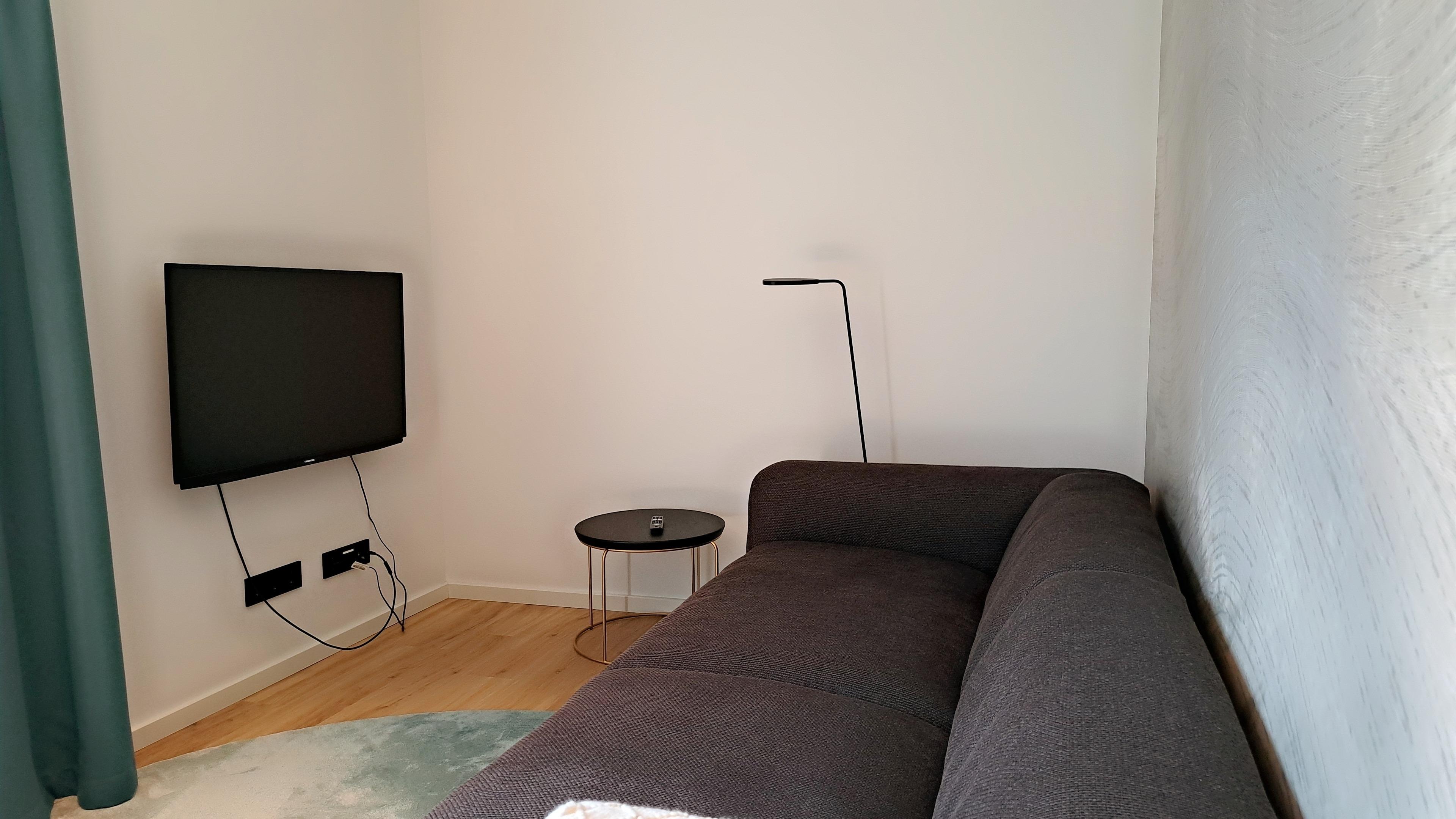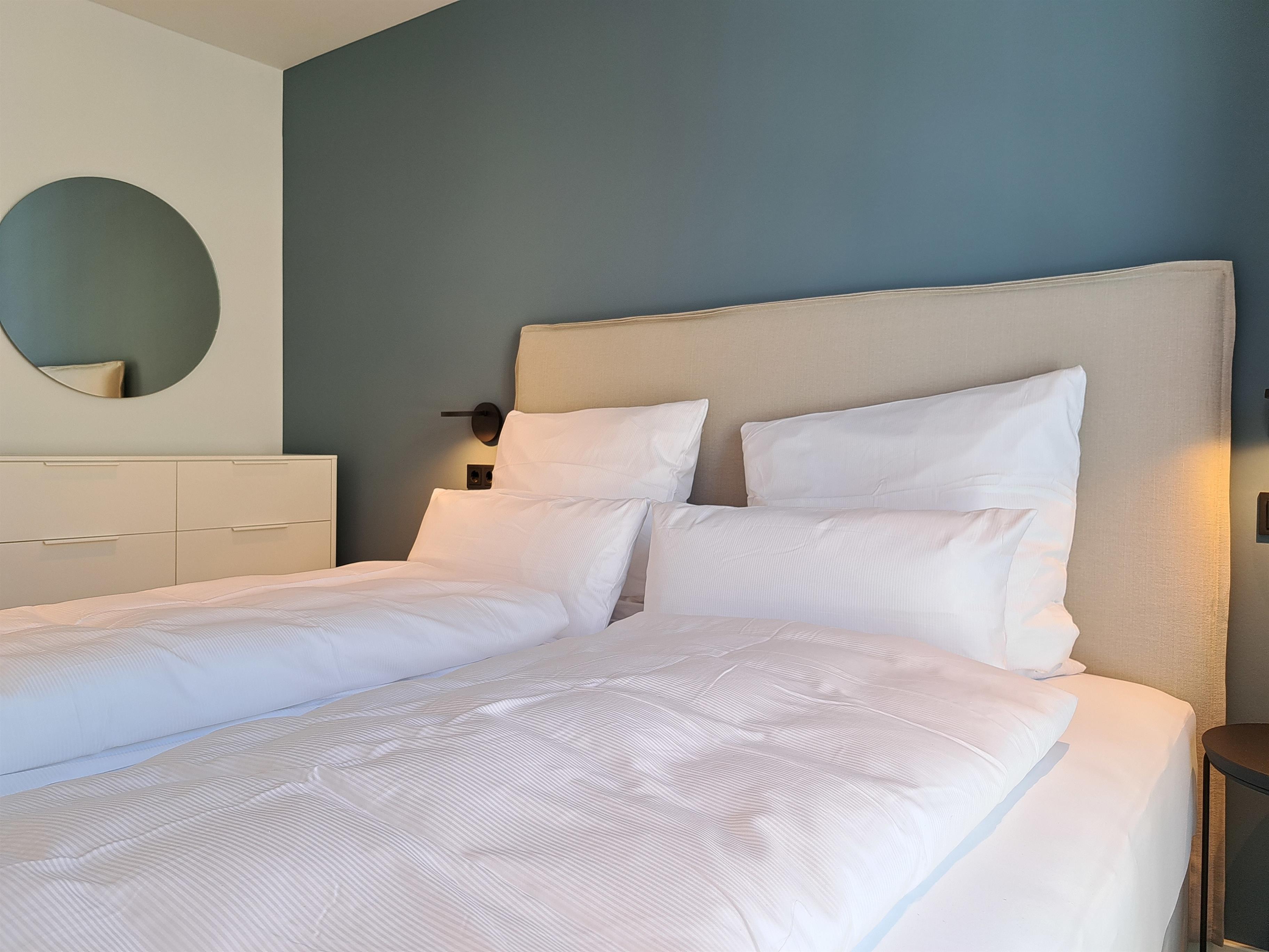 Die Schlafbereiche sind mit hochwertigen Boxspringbetten und Kleiderschrank mit Zimmersafe eingerichtet. Eines der Schlafzimmer ist zusätzlich mit einem TV ausgestattet.