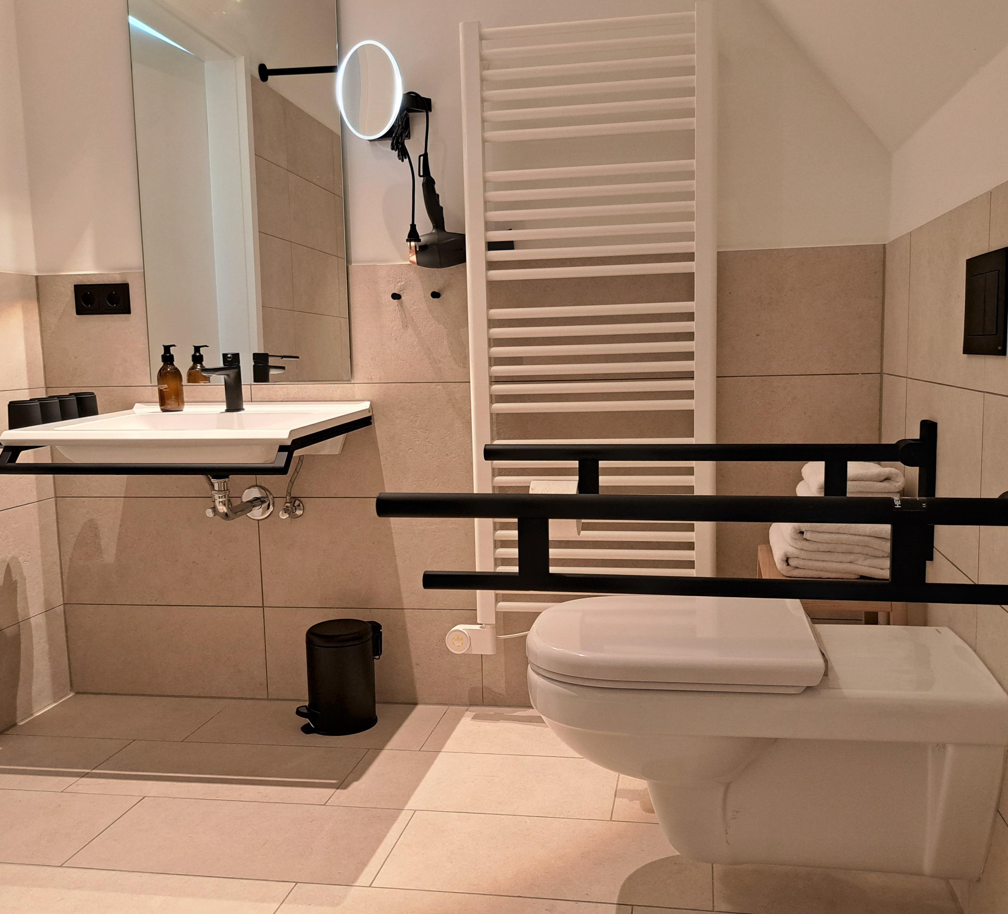 - WC mit vergrößerter Ausladung und Stützklappgriffen beidseitig