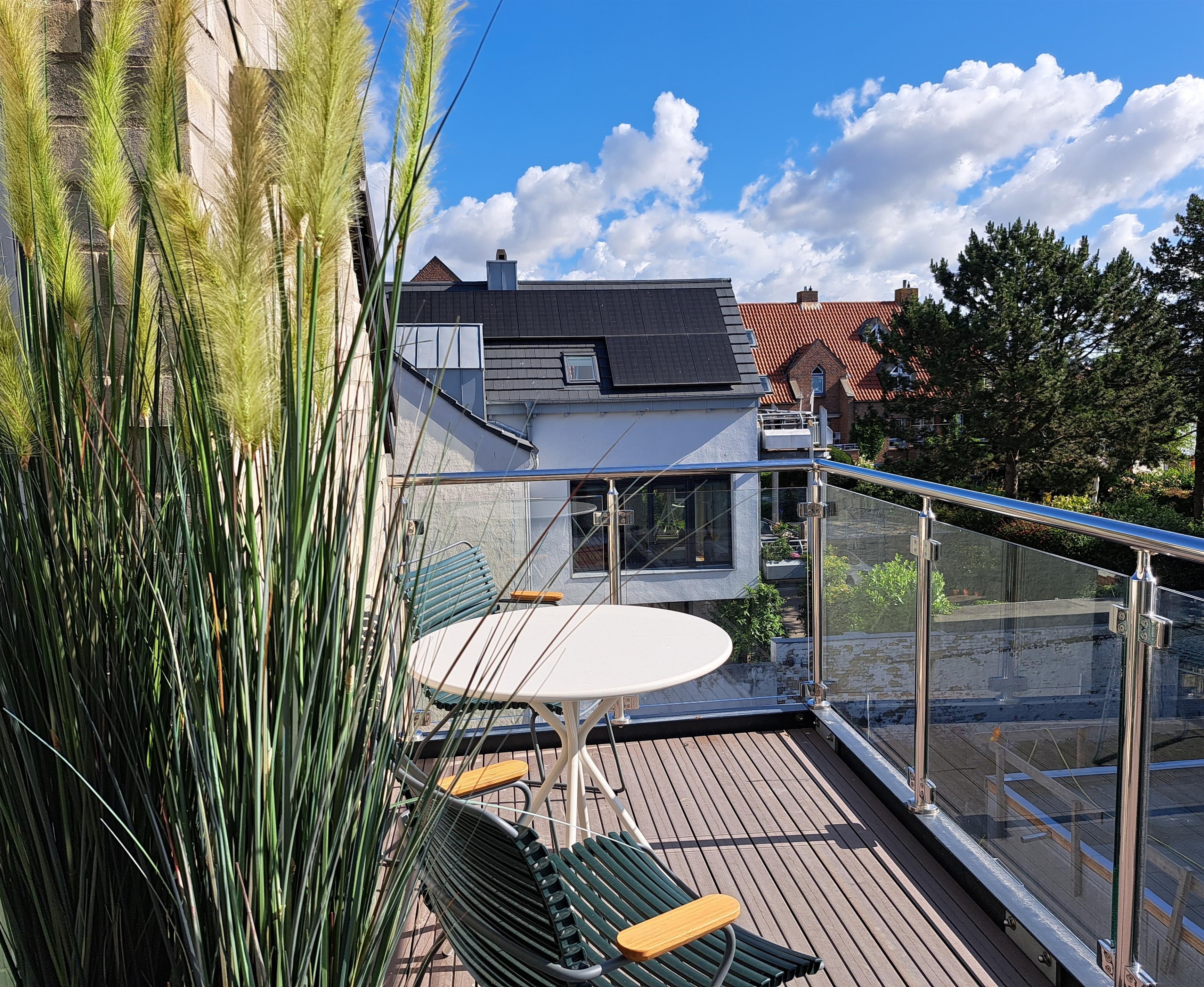 ECK AM MEER 7 verfügt über eine zum Meer und Strand hin seitliche Loggia von 4 qm mit südlicher Ausrichtung und einer Dachterrasse über 5 qm Ostrichtung. Außenmöblierung ist selbstverständlich vorhanden.