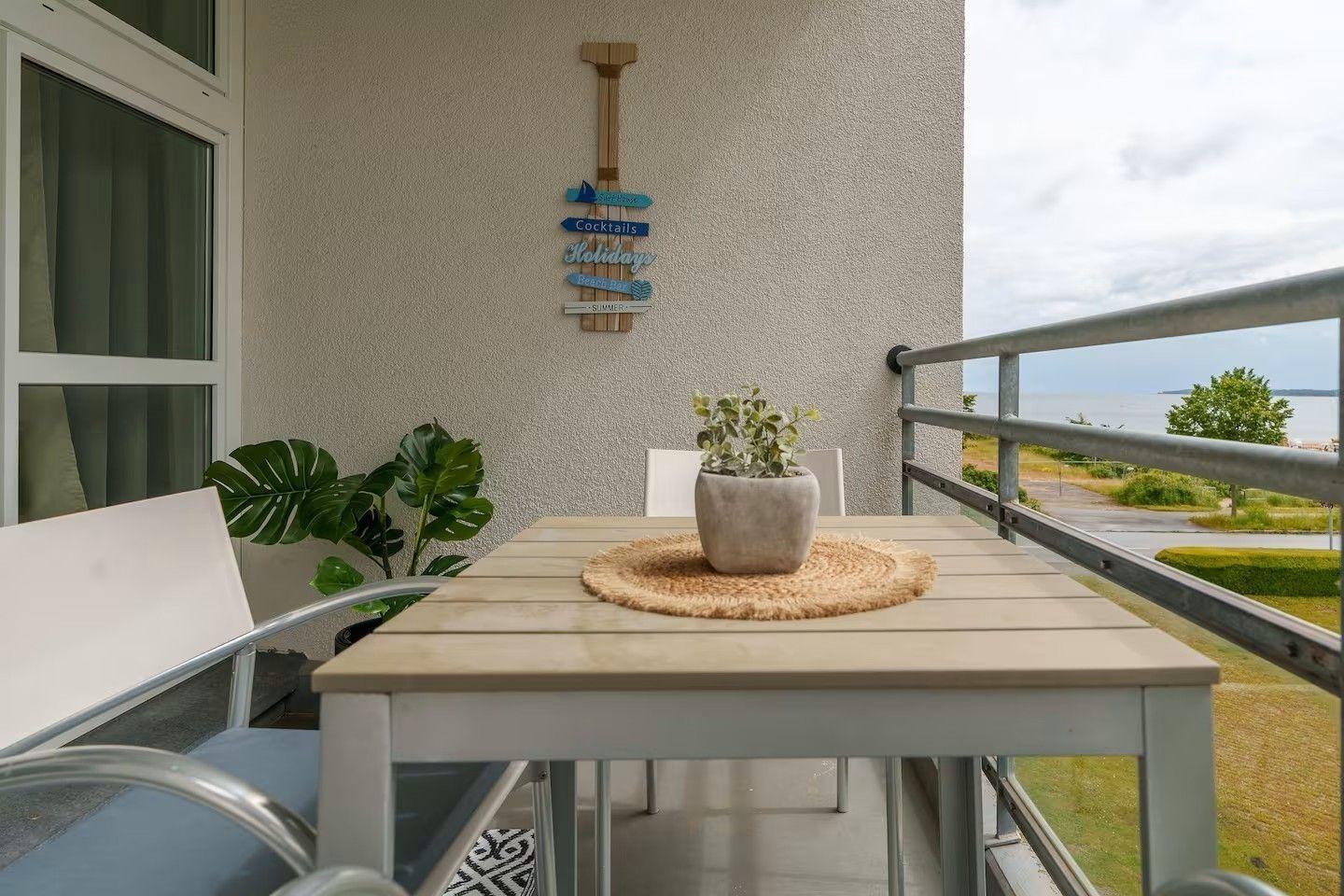 Moderne Ferienwohnung in Eckernförde mit direktem Meerblick und Balkon, ideal für einen entspannten Ostseeurlaub.