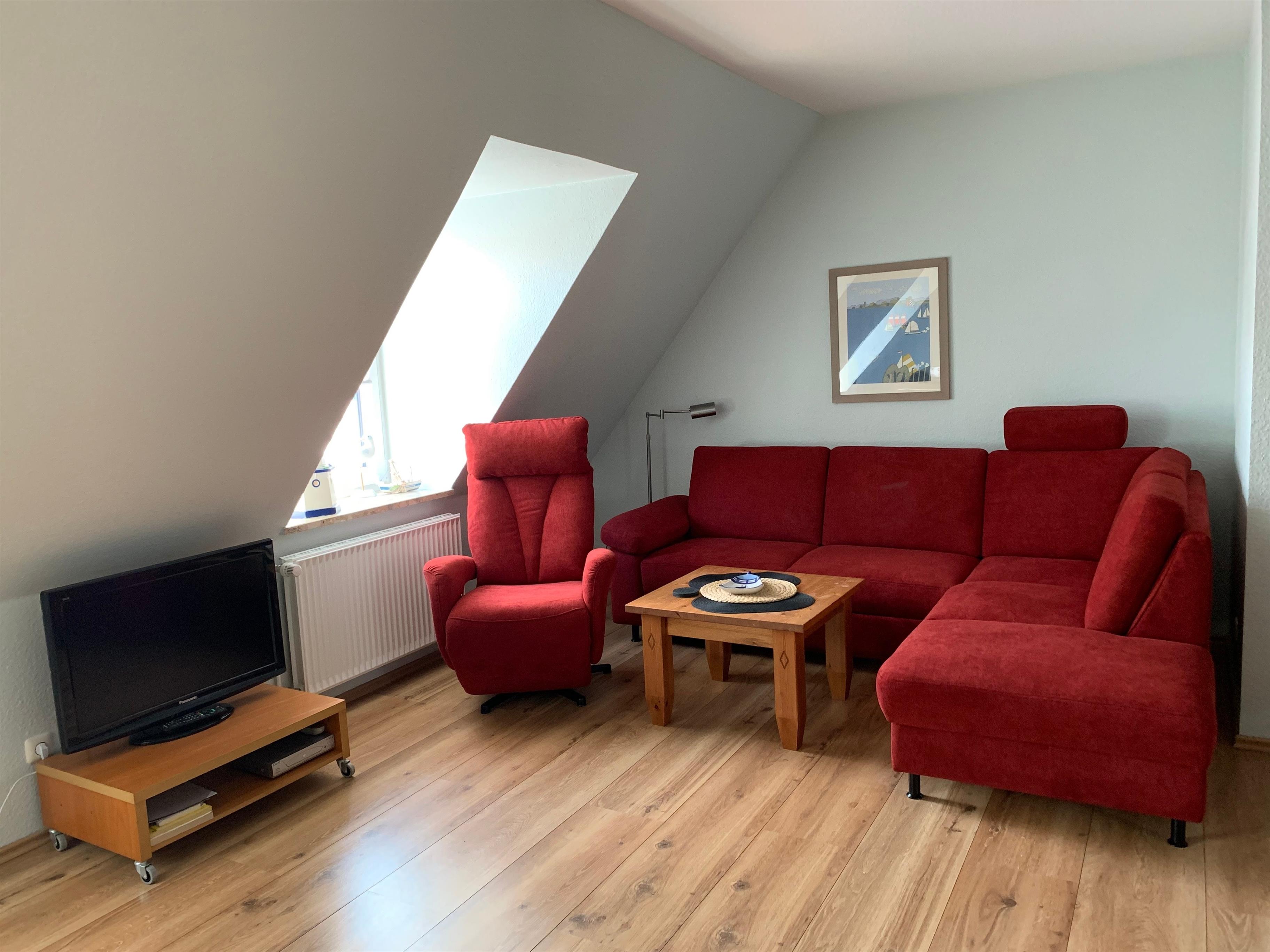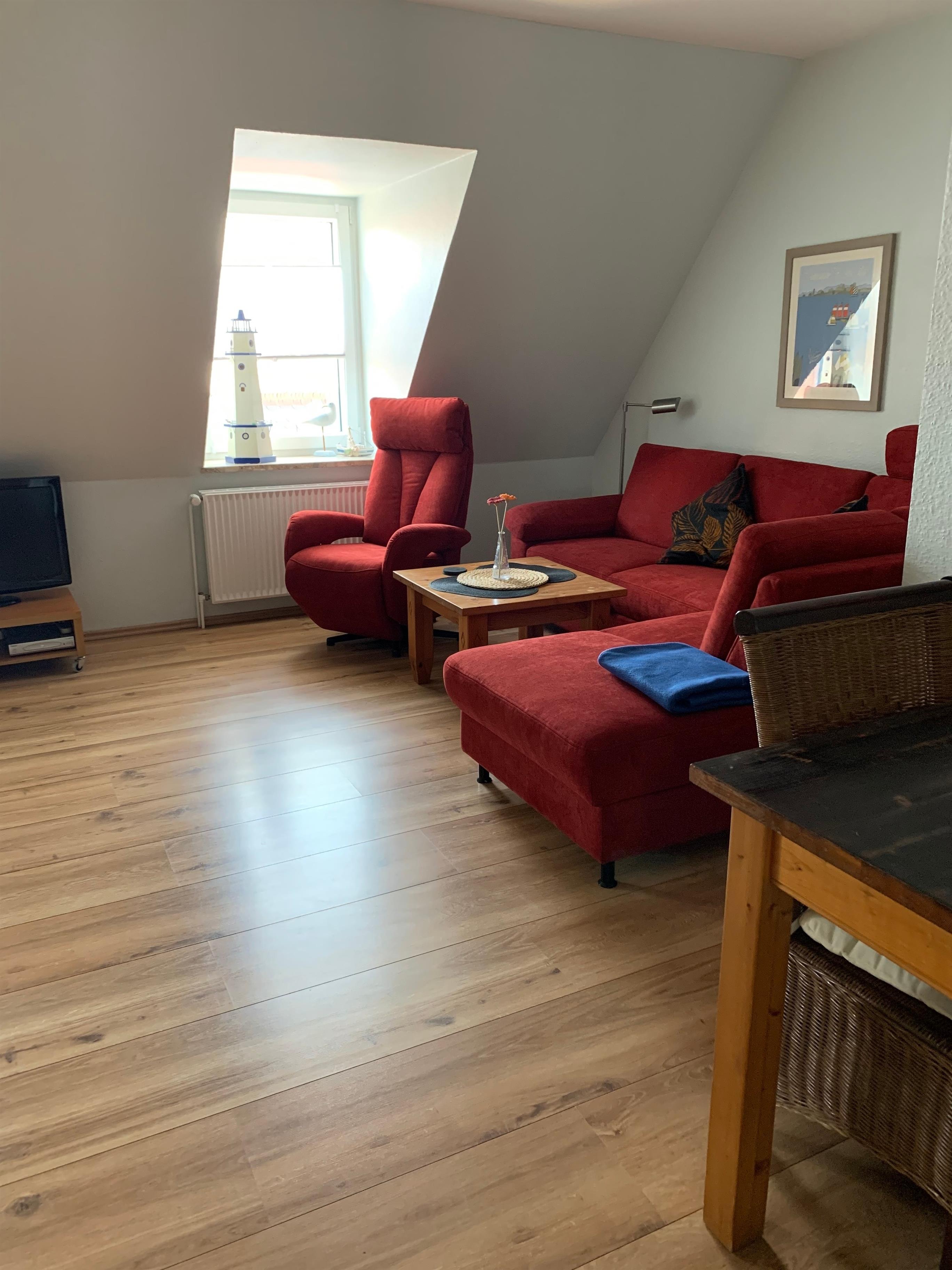 Die Wohnung im Dachgeschoss besteht aus einem großzügigen Wohnzimmer mit Einbauküche und Schlafsofa, einem extra Schlafzimmer mit einem Doppelbett sowie einem Duschbad.