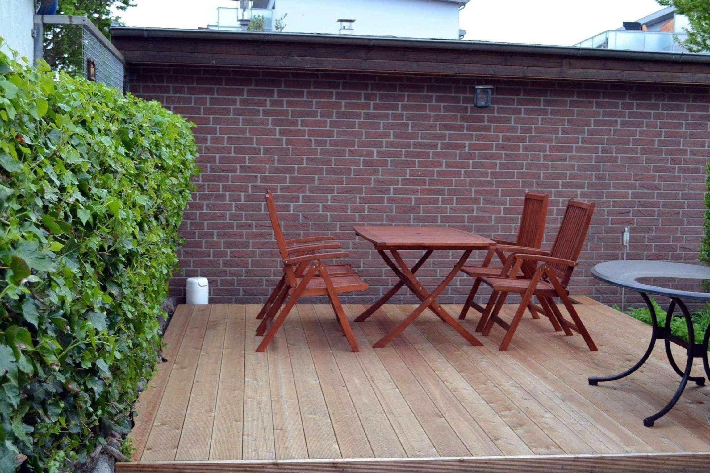 Ebenerdige Südterrasse, umgeben von einem liebevoll angelegten, ortstypischen Garten.