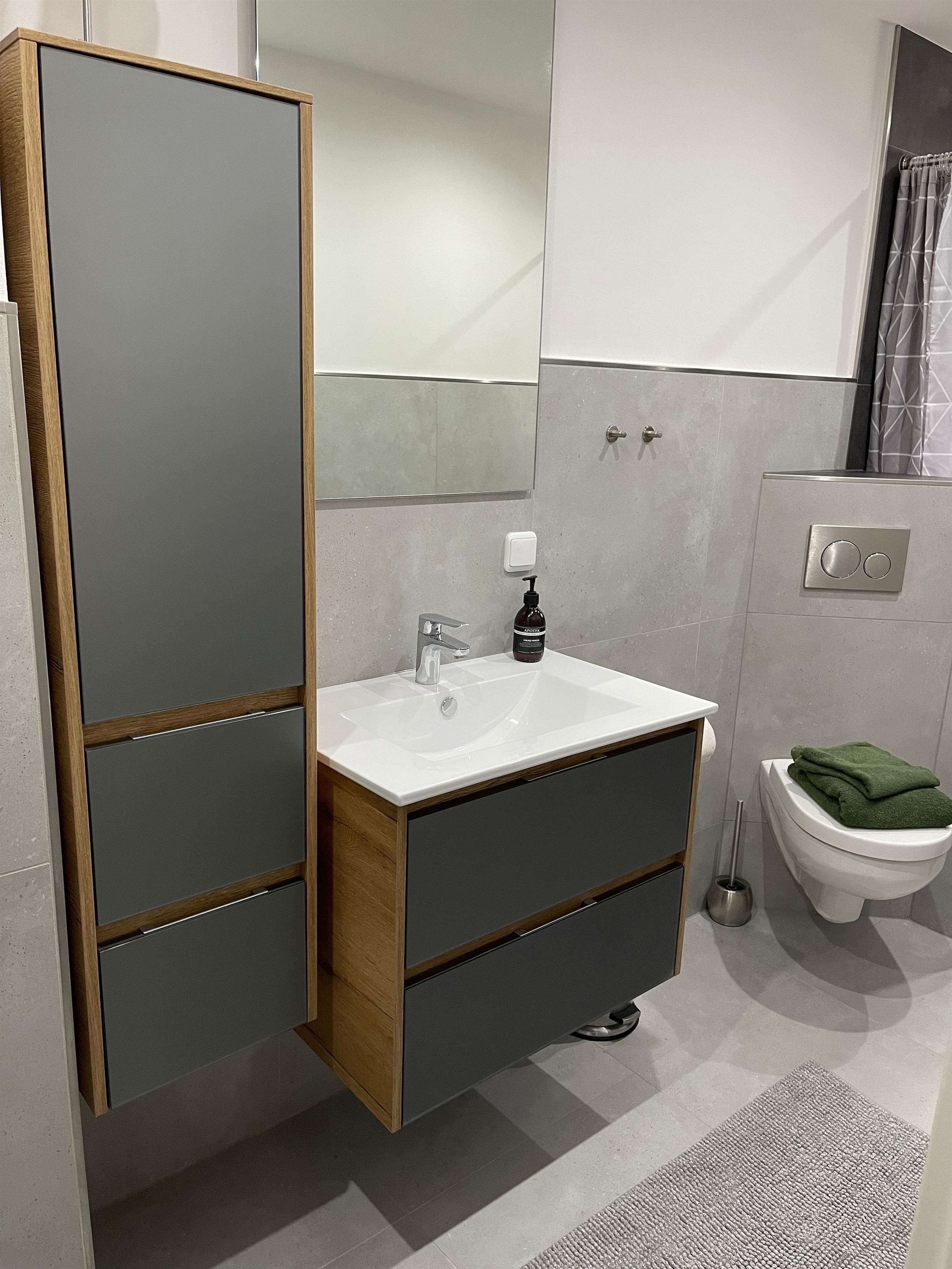 Neues Badezimmer mit ebenerdiger Dusche und Fußbodenheizung , Fön vorhanden