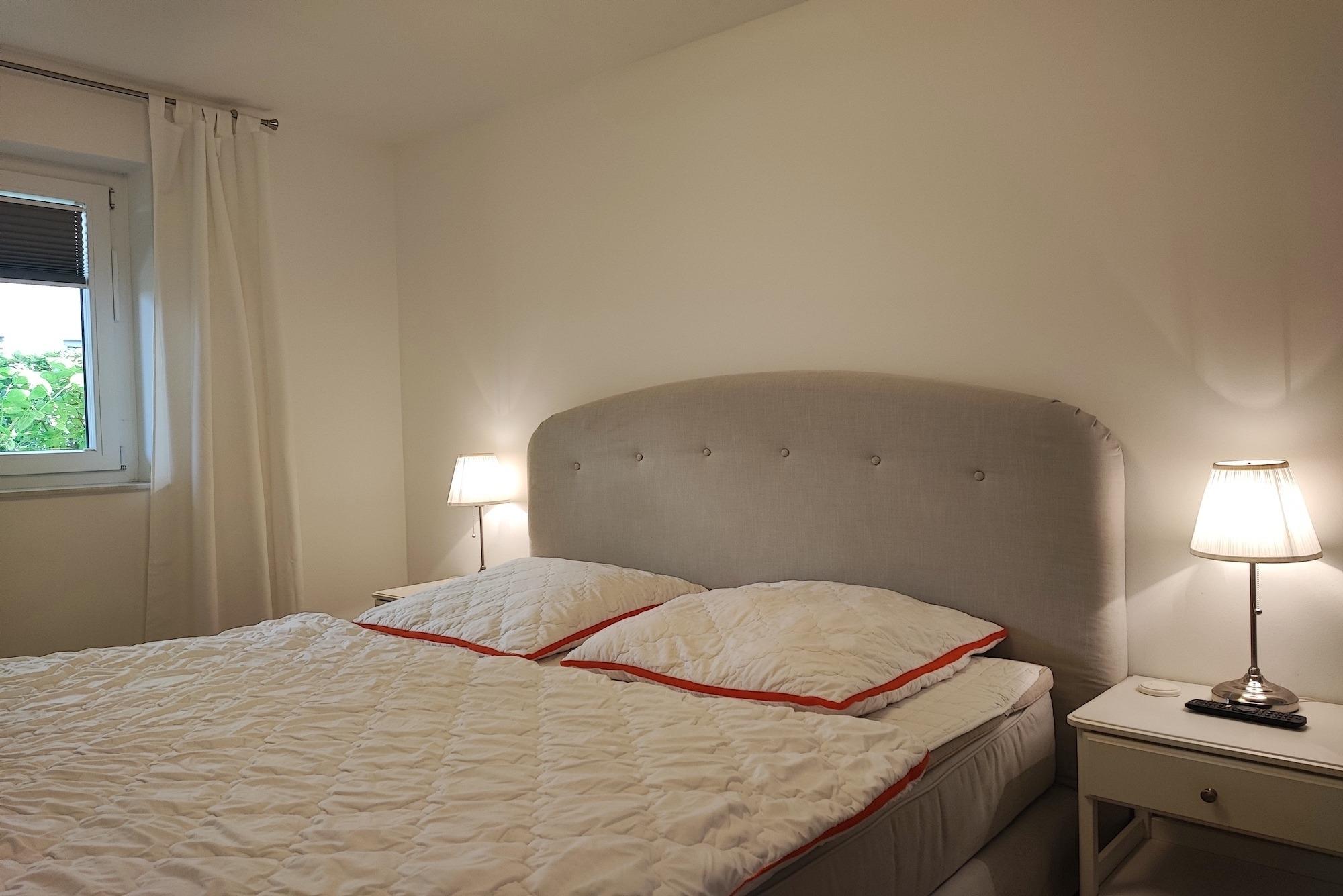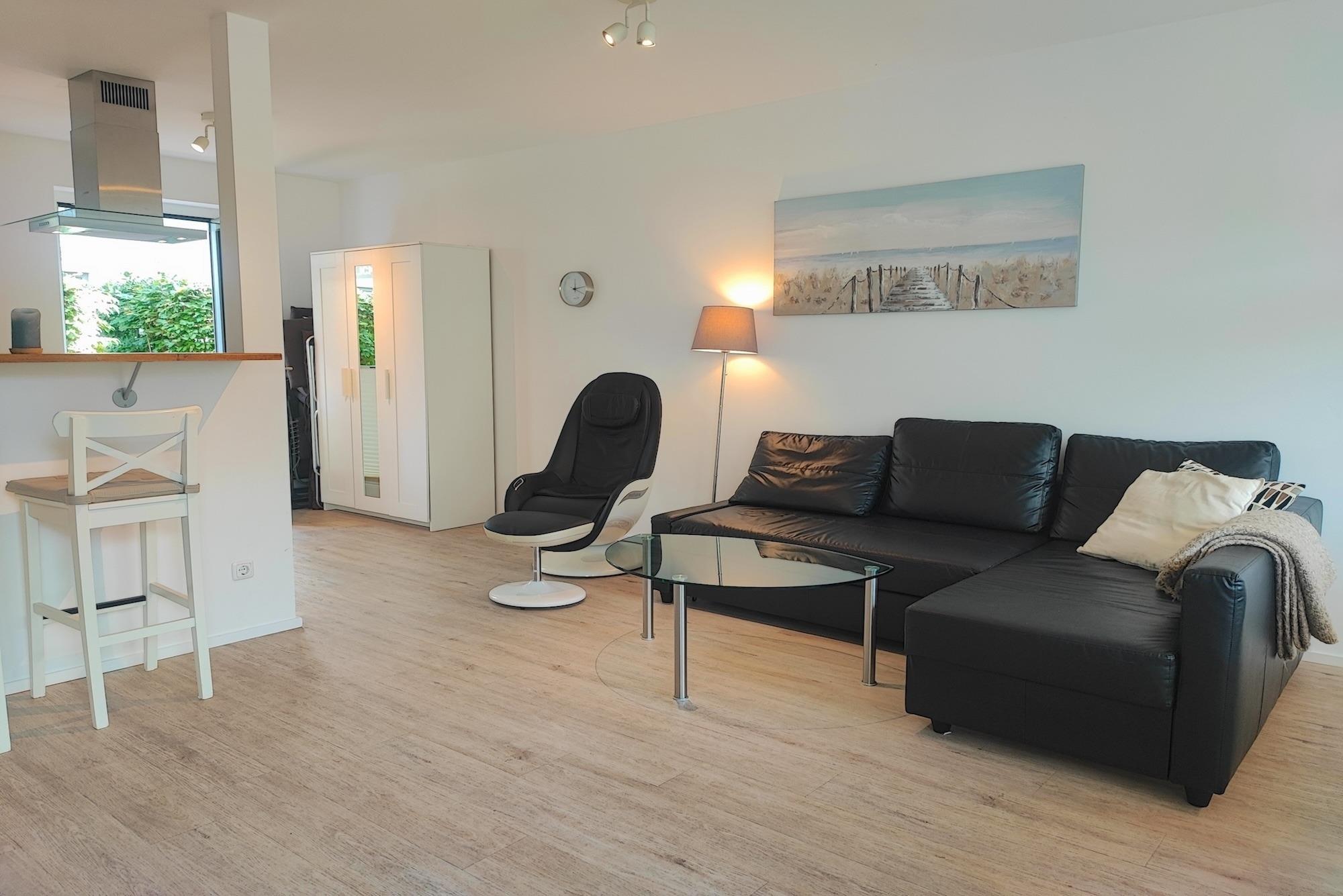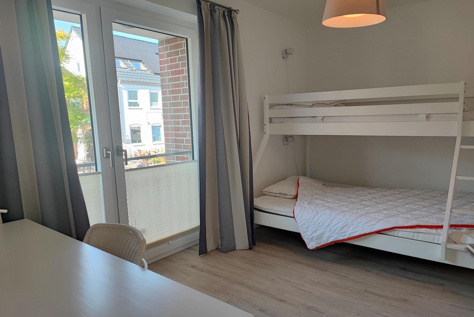 Die Wohnung ist über einen separaten Hauseingang und über die Innenhofterrasse zugänglich. Der lichtdurchflutete, großzügige Wohn- und Essbereich, mit voll ausgestatteter Küche, la¨dt zum gemeinsamen Entspannen und Kochen ein! Die Wohnung verfügt über eine Innenhofterrasse und eine Veranda mit direktem Zugang zur Wohnung. Ein Schlafzimmer wurde mit einem modernen Boxspringbett (180x200), einem Kleiderschrank und einem TV-Gerät ausgestattet. Im zweiten Schlafzimmer befindet sich ein Etagenbett (90x200 und 140x200) und ebenfalls ein Kleiderschrank und ein Schreibtisch. Die Schlafzimmer bieten somit die gewünschte nächtliche Erholung!