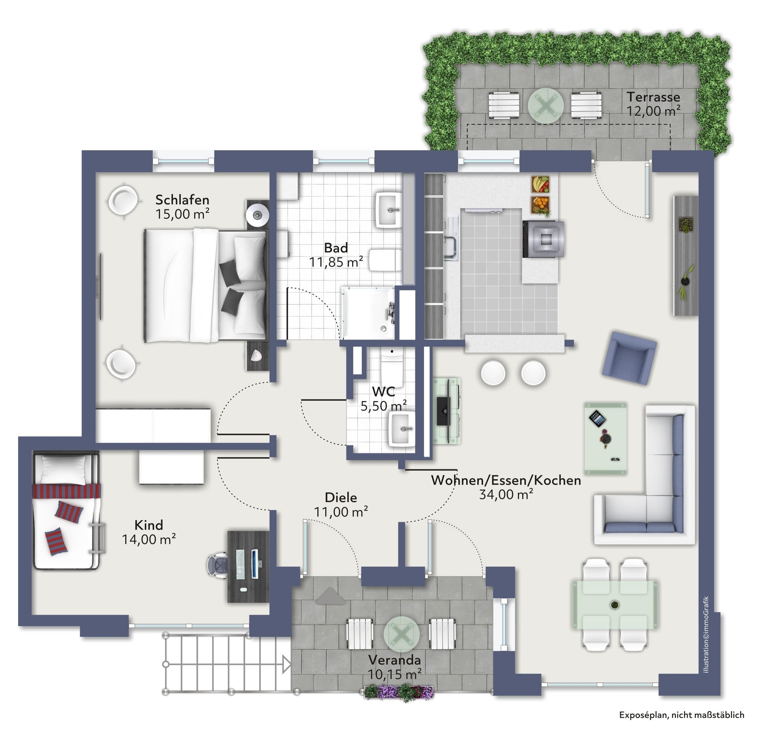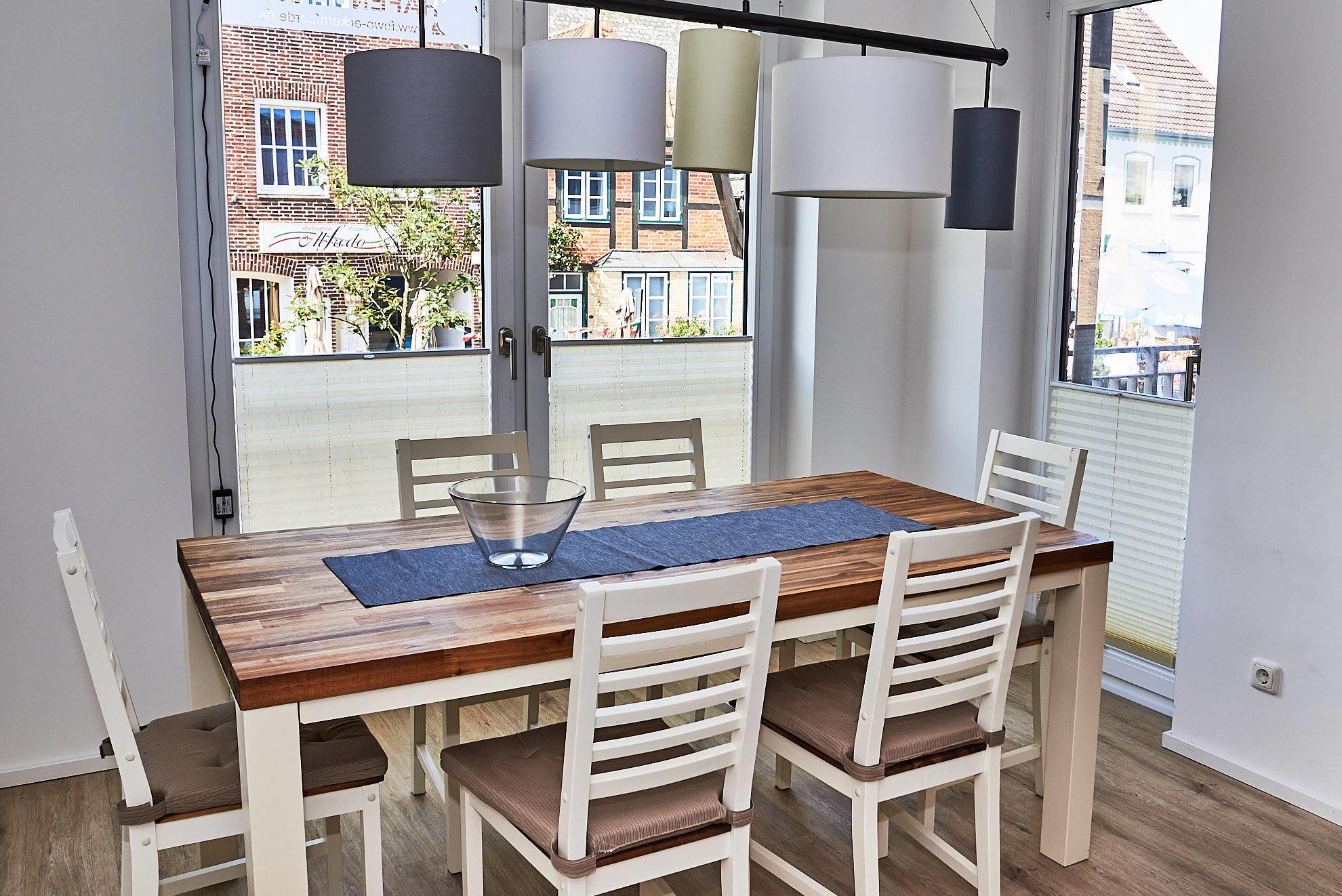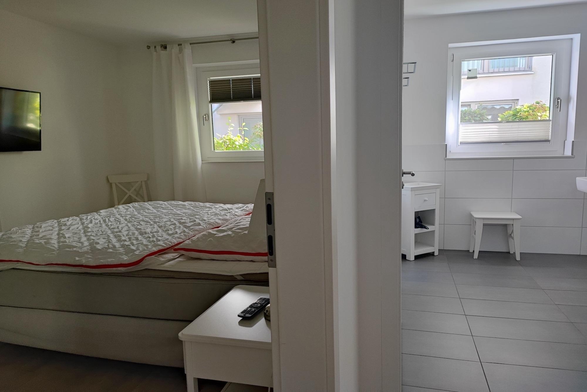 Die Wohnung ist über einen separaten Hauseingang und über die Innenhofterrasse zugänglich. Der lichtdurchflutete, großzügige Wohn- und Essbereich, mit voll ausgestatteter Küche, la¨dt zum gemeinsamen Entspannen und Kochen ein! Die Wohnung verfügt über eine Innenhofterrasse und eine Veranda mit direktem Zugang zur Wohnung. Ein Schlafzimmer wurde mit einem modernen Boxspringbett (180x200), einem Kleiderschrank und einem TV-Gerät ausgestattet. Im zweiten Schlafzimmer befindet sich ein Etagenbett (90x200 und 140x200) und ebenfalls ein Kleiderschrank und ein Schreibtisch. Die Schlafzimmer bieten somit die gewünschte nächtliche Erholung!