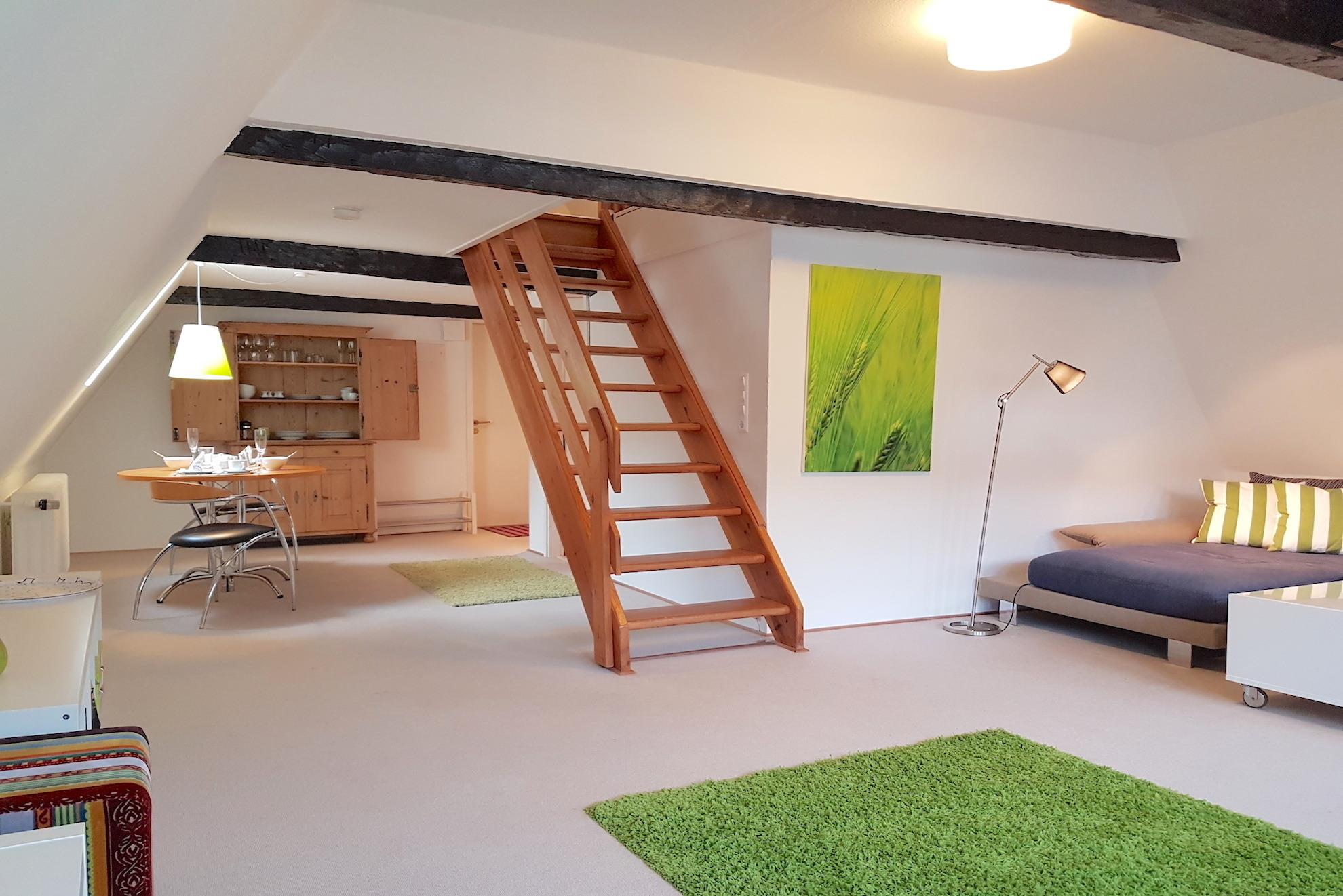 Die gemütliche 55 qm Maisonette Wohnung ist auf zwei Ebenen verteilt und befindet sich im 1. Stockwerk des historischen Fischerhauses in der Gudewerdtstrasse.